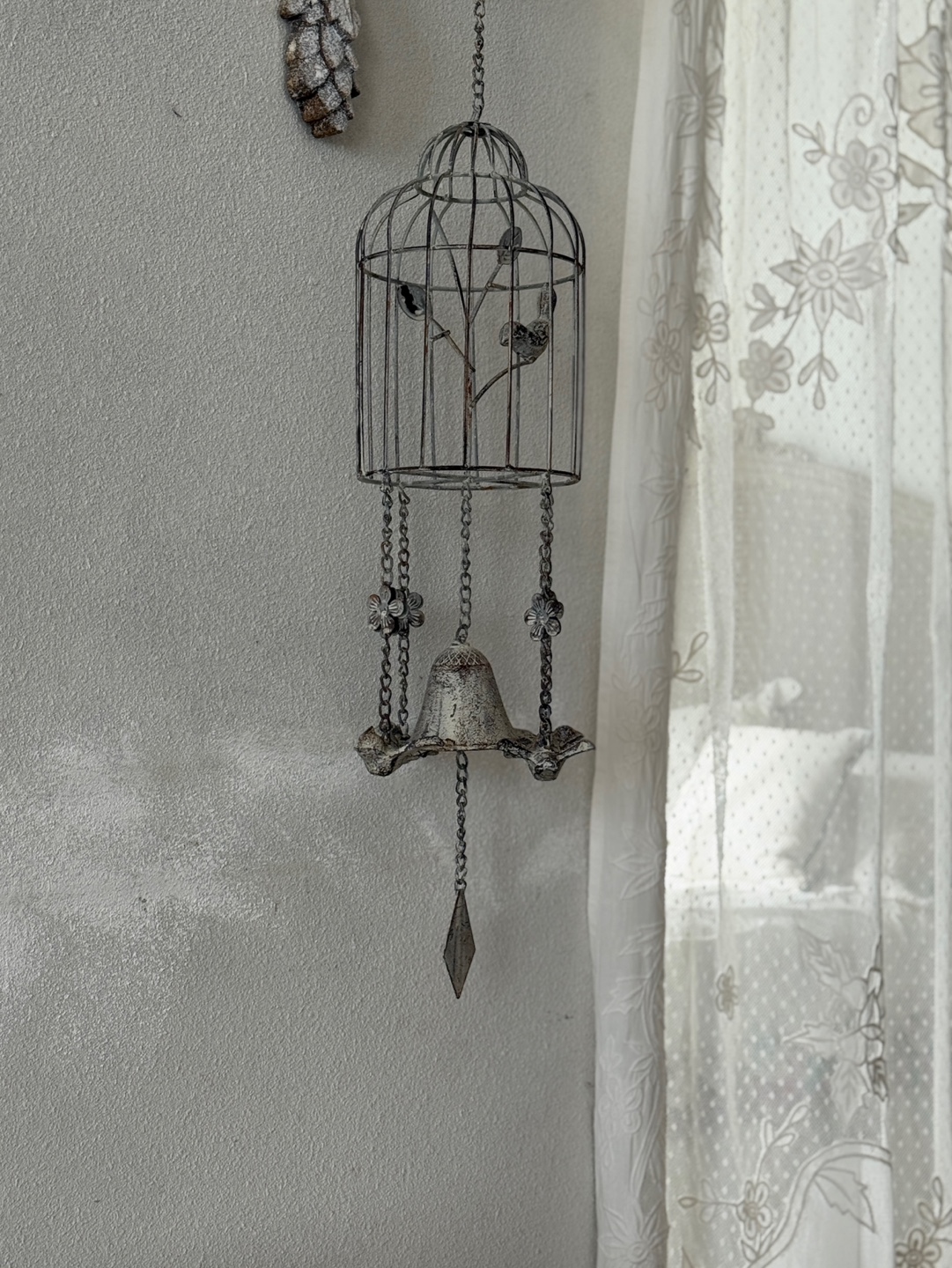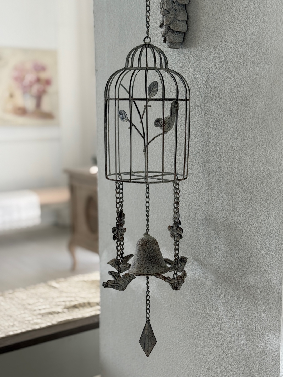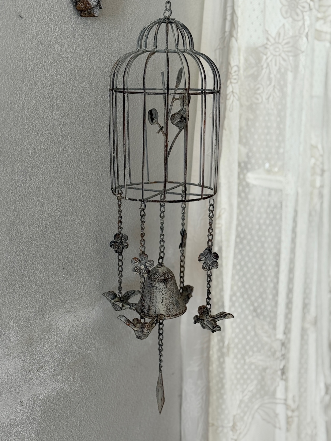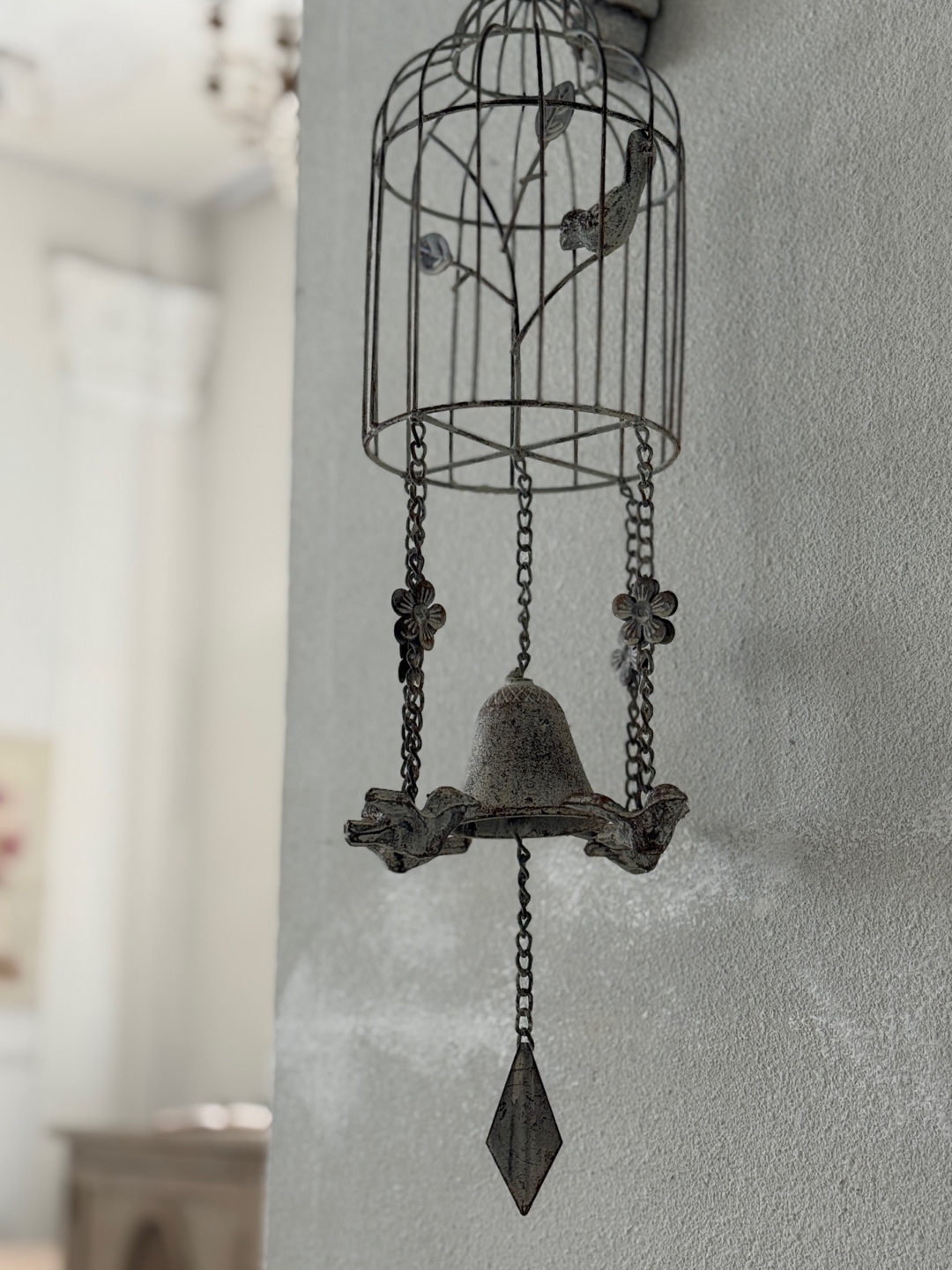 빈티지한 철제 새장과 종의 낭만적인 조화