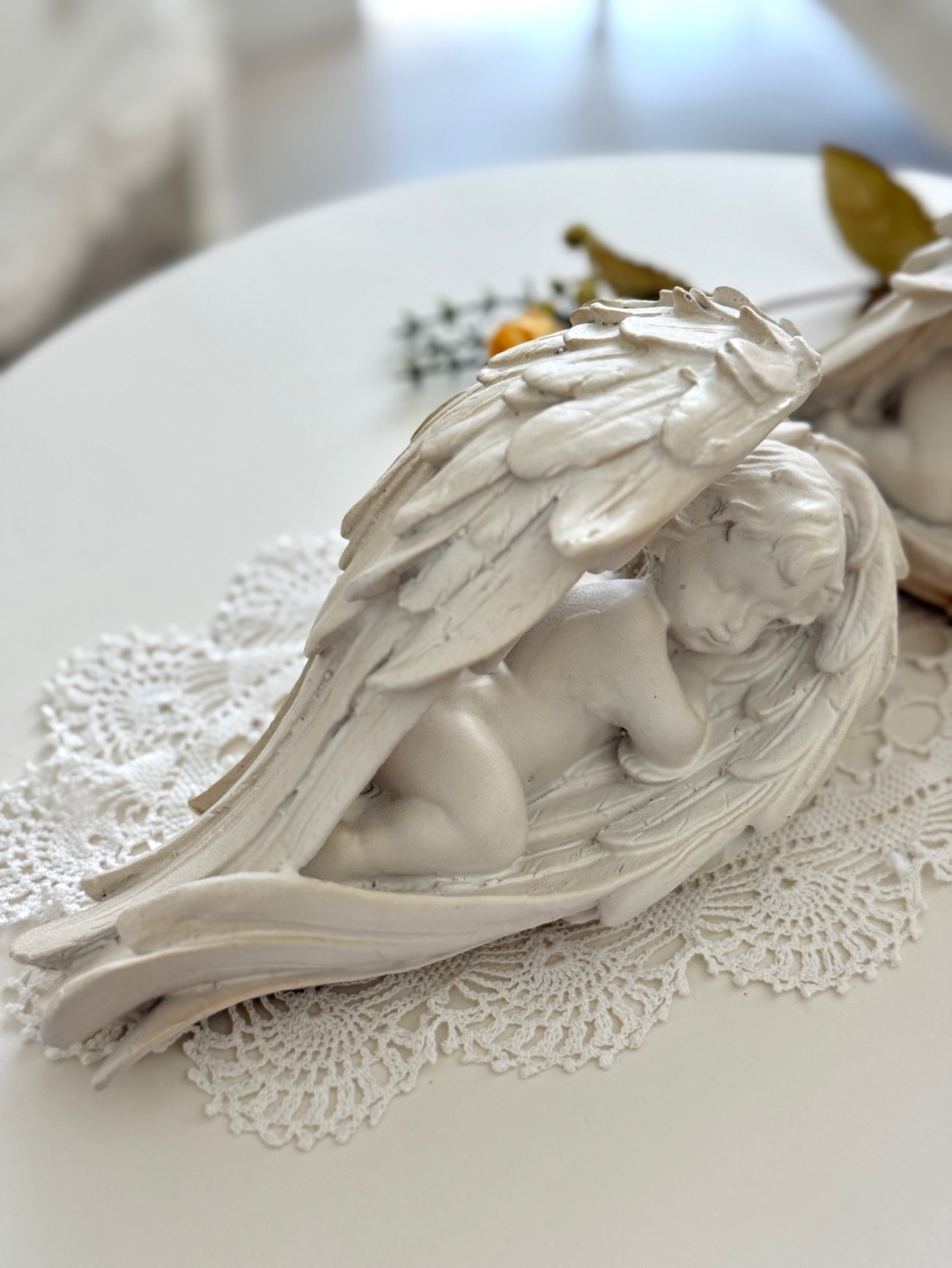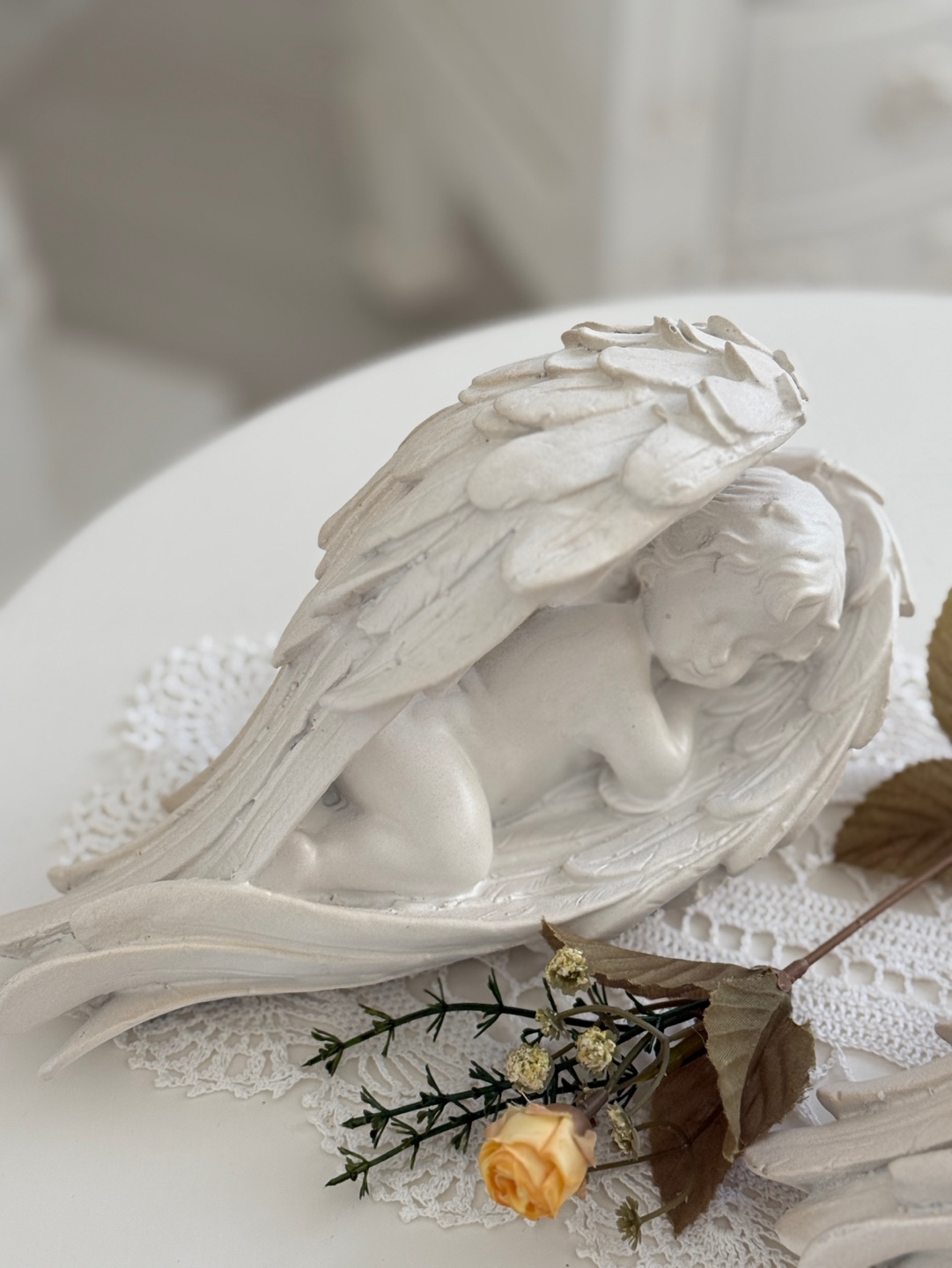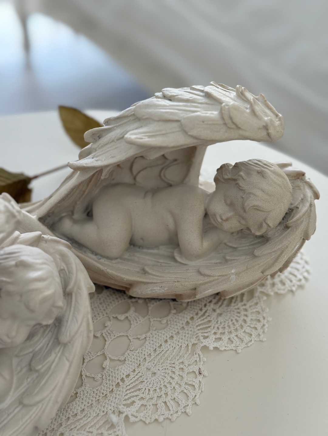 풍성하고 섬세한 날개 디테일 속에 평온하게 잠든 아기 천사의 모습