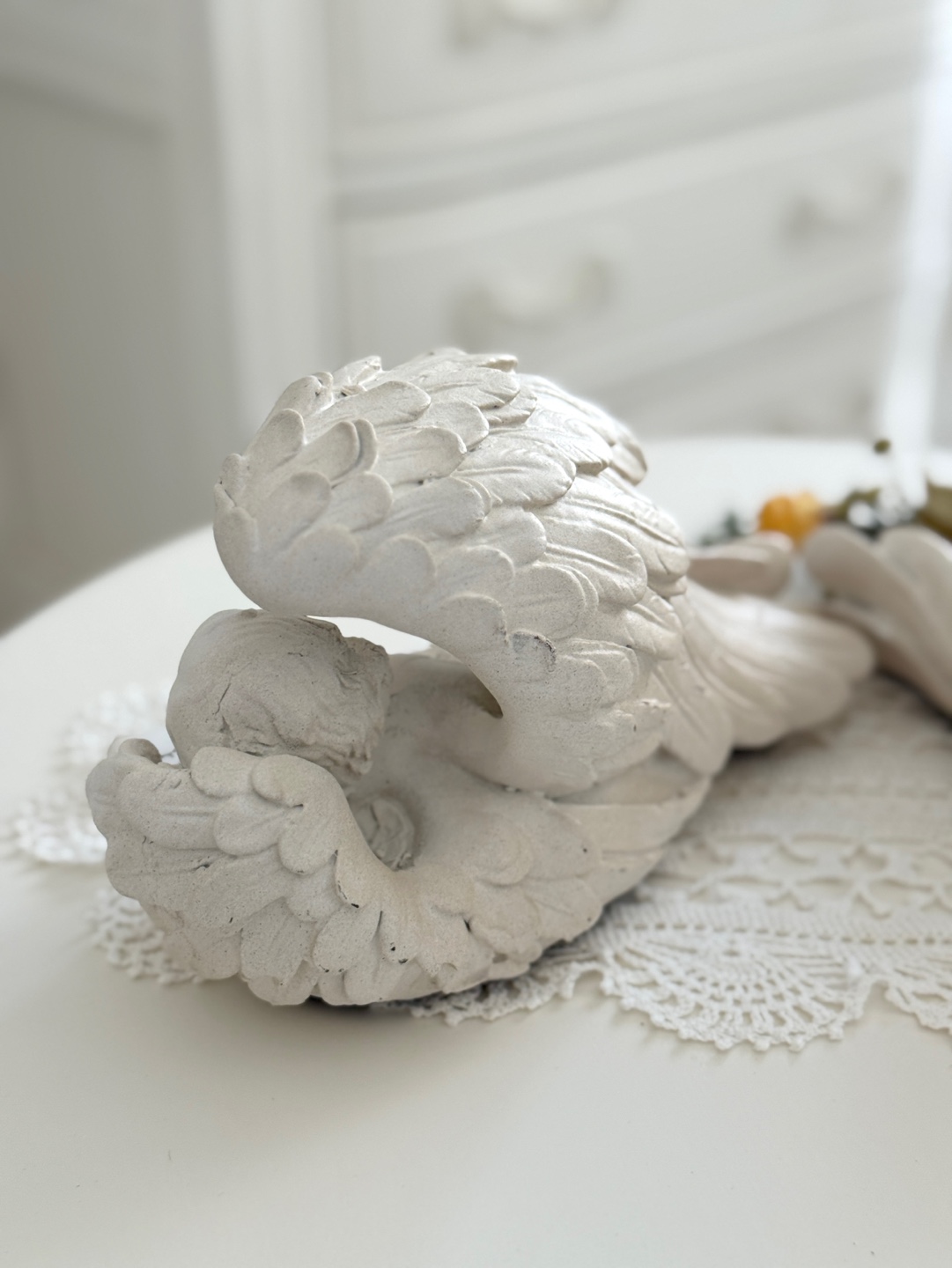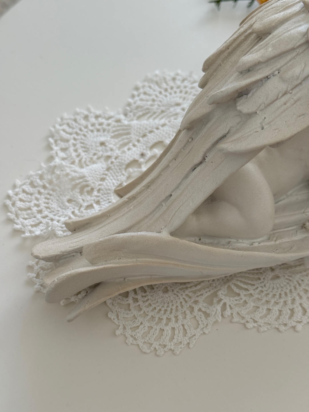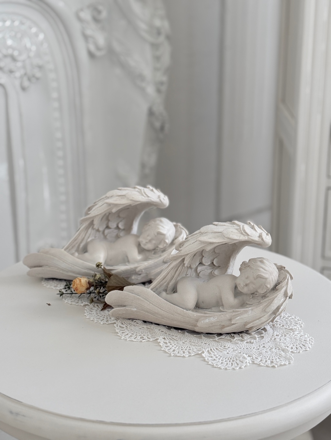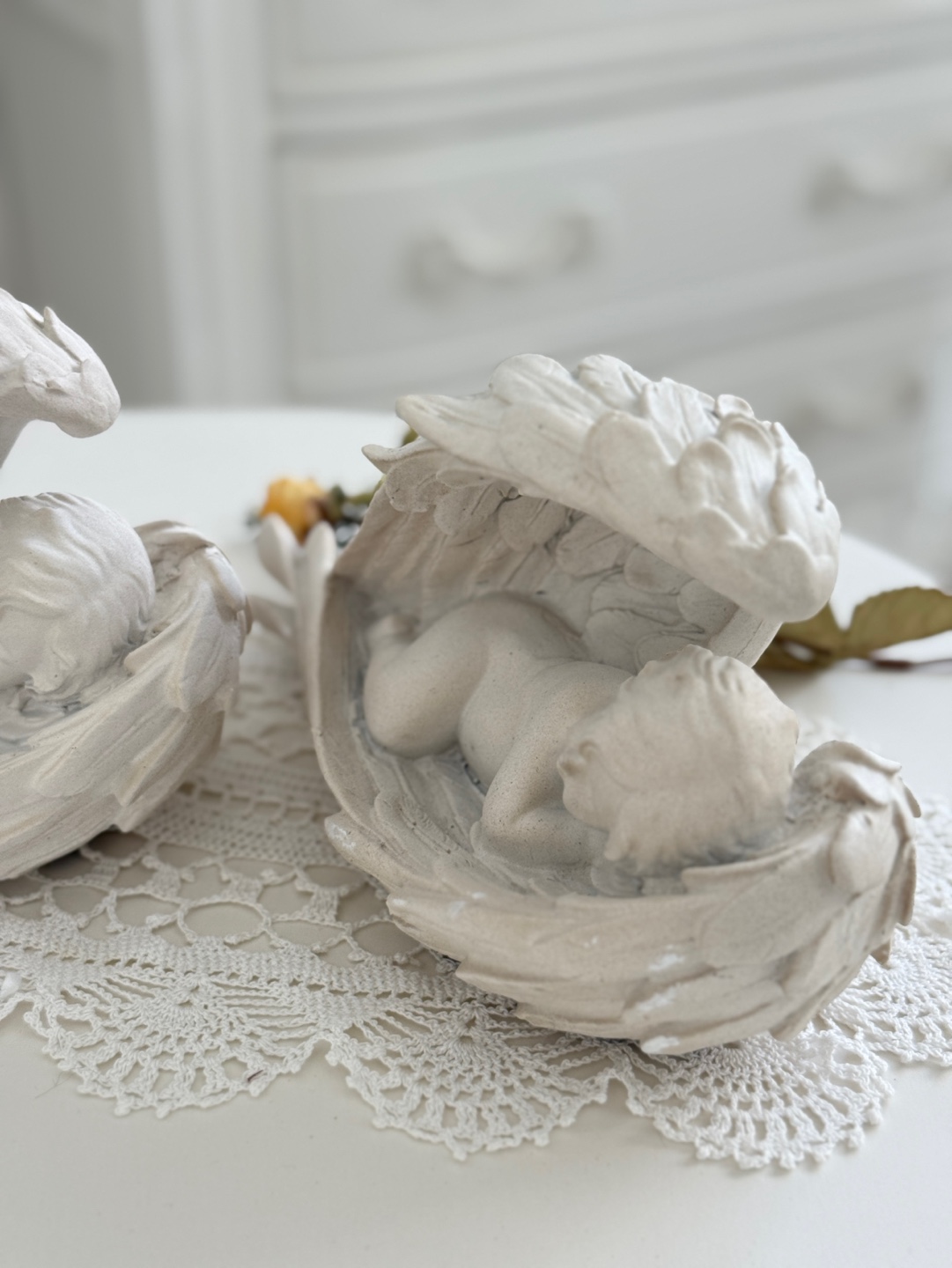 풍성하고 섬세한 날개 디테일 속에 평온하게 잠든 아기 천사의 모습
