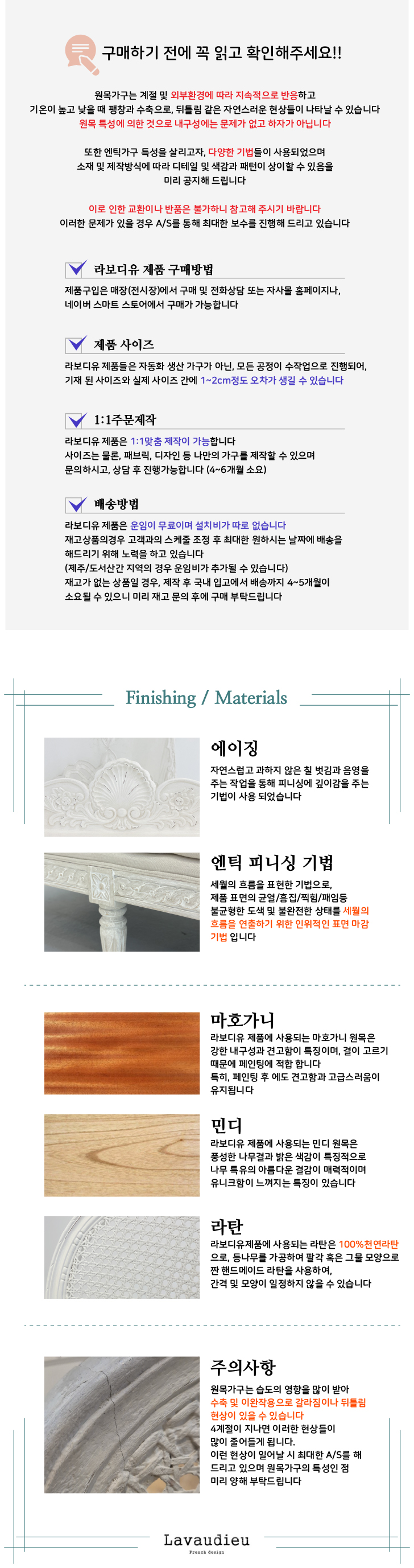 • - 디테일 부분은 핸드메이드 방식으로 제작되기 때문에, 제품마다 균일하지 않을 수 있습니다. 빈티지 작업 즉 스크래치 공법으로 도장 마감 전 스크래치를 내주는 공법이 사용됩니다. 핀홀공법(마감 전 못이박힌 브러쉬같은 도구로 찍어주는공법)과 더스트공법(옛스럽게 보이려 세월의 먼지가 쌓인것처럼 연출하는 공법)을 사용합니다.