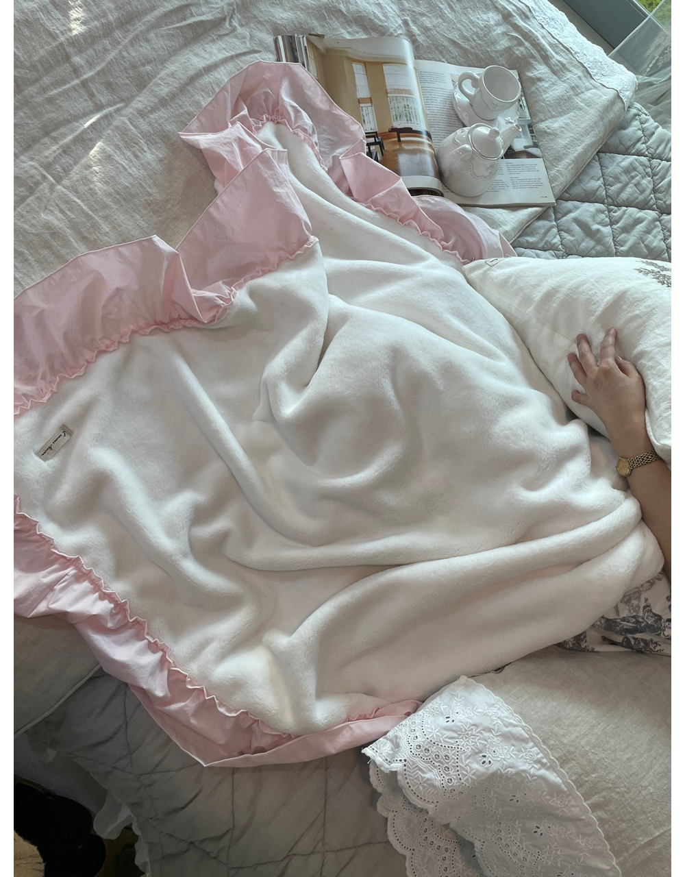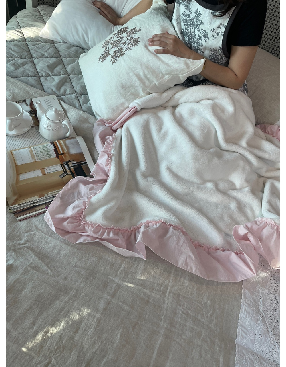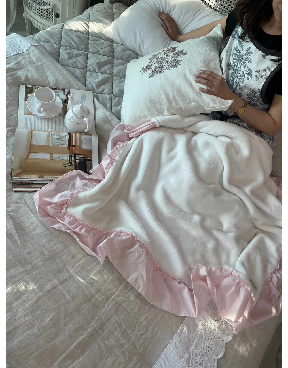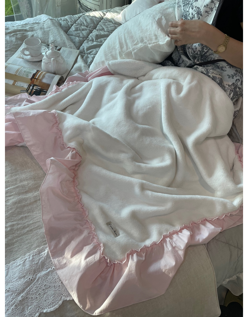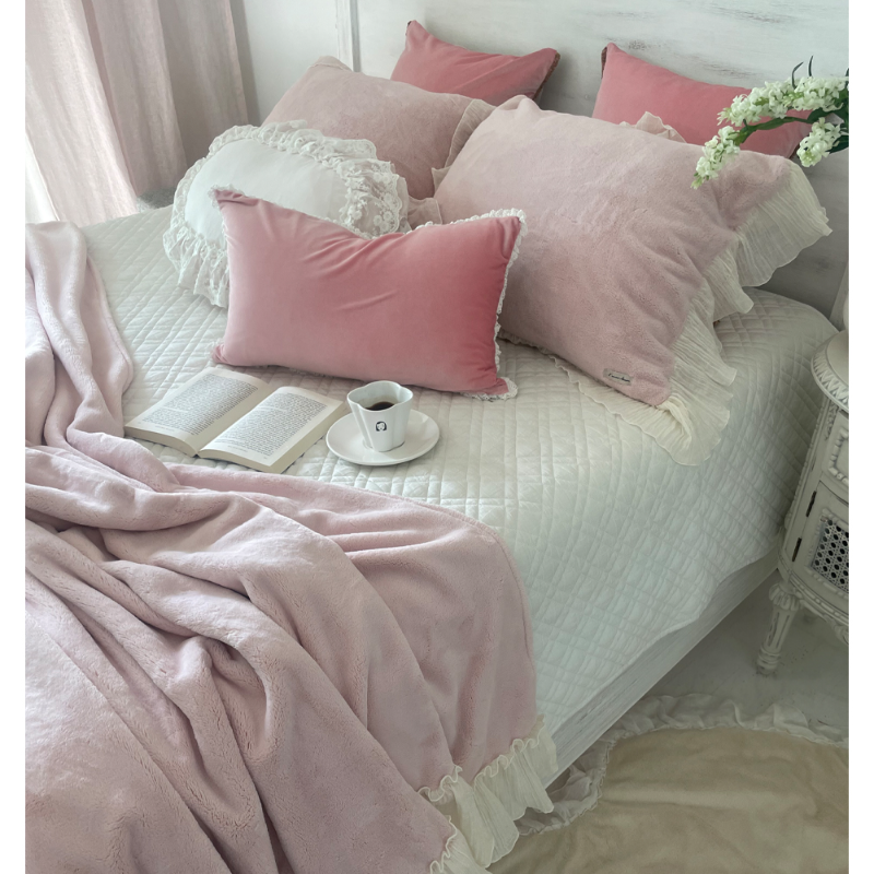 HOME > 침구,쿠션,커버류 > 블랭킷,스프레드,패드 > 프렌치 침구 헤라 핑크 프릴 밍크 퍼 미니블랭킷 담요 홈패브릭