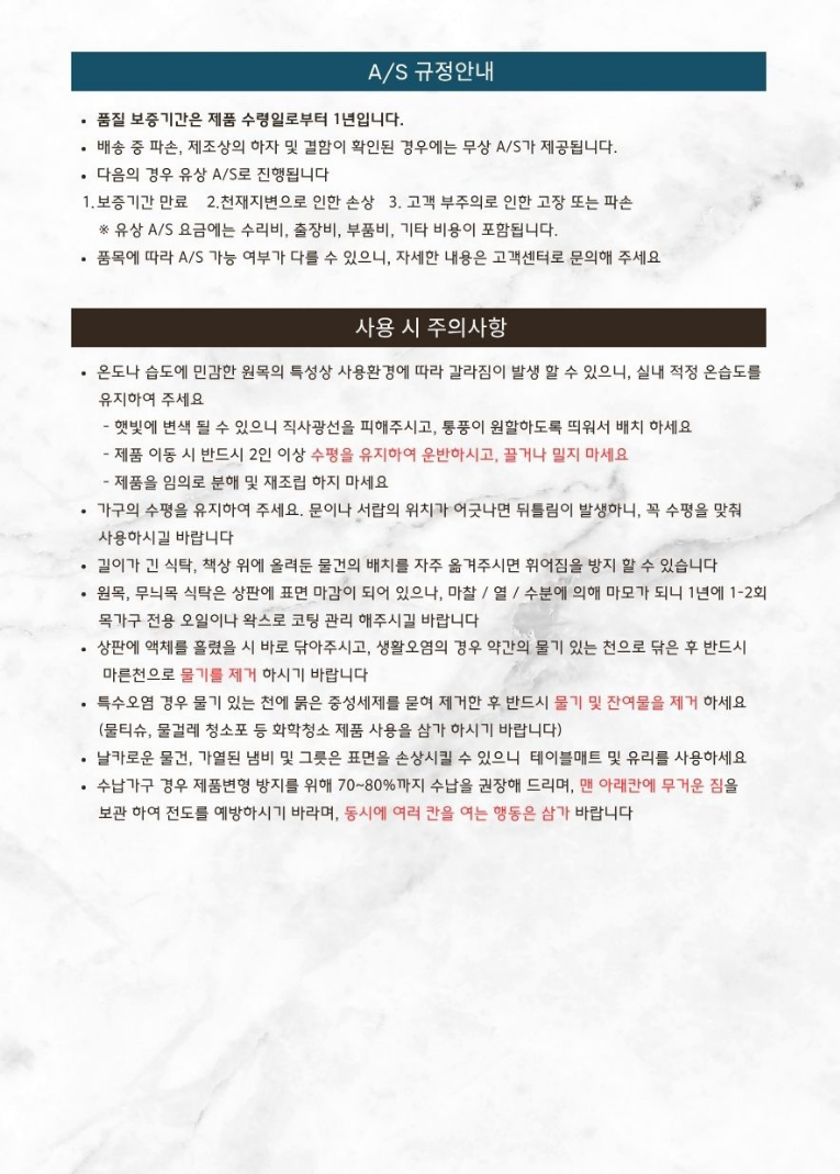 • - 지나치게 습하거나 건조한곳에 두지 마세요. 원목가구 청소시에는 부드러운 마른천으로 이용부탁드립니다.