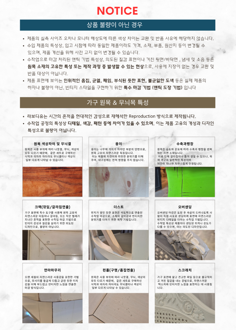 • - 디테일 부분은 핸드메이드 방식으로 제작되기 때문에, 제품마다 균일하지 않을 수 있습니다. 빈티지 작업 즉 스크래치 공법으로 도장 마감 전 스크래치를 내주는 공법이 사용됩니다. 핀홀공법(마감 전 못이박힌 브러쉬같은 도구로 찍어주는공법)과 더스트공법(옛스럽게 보이려 세월의 먼지가 쌓인것처럼 연출하는 공법)을 사용합니다.