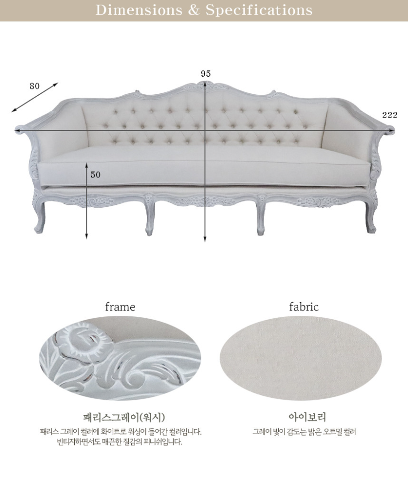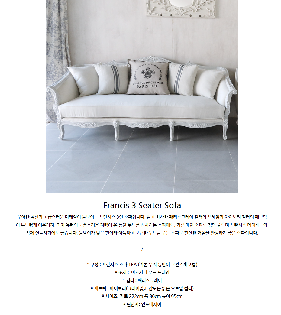 프렌치 프란시스 3인 소파 패리스그레이 모던프렌치 인테리어가구 패브릭소파