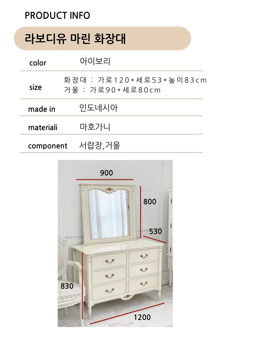 크기 서랍장 : 가로120/세로53/높이83cm 거울 : 가로90/세로80cm