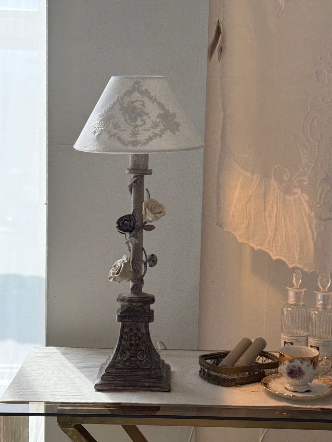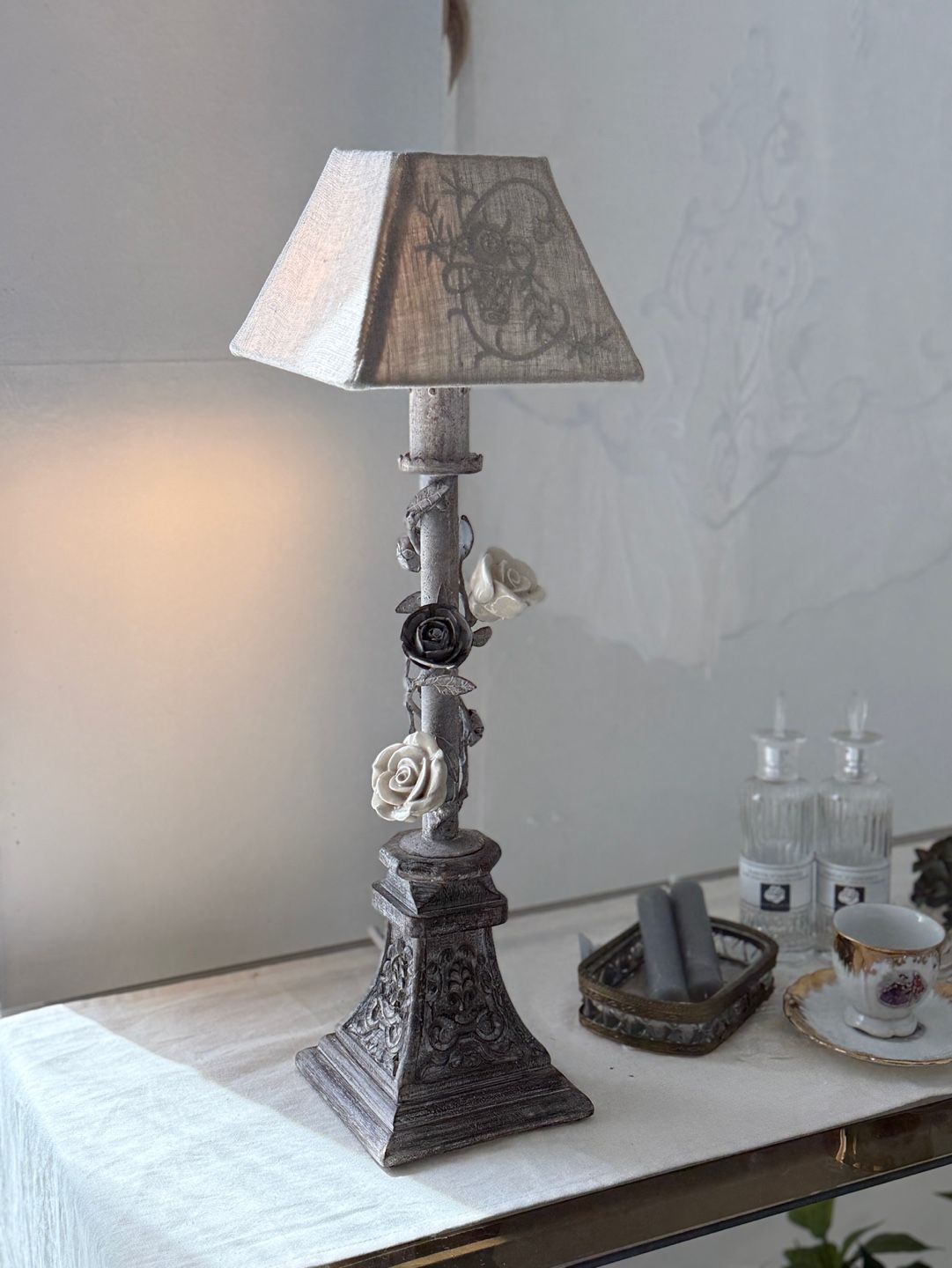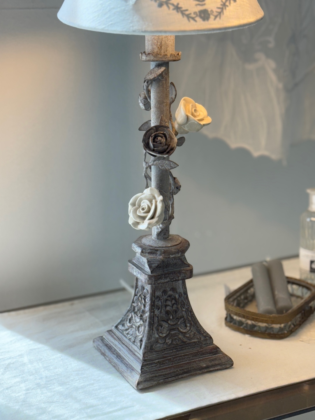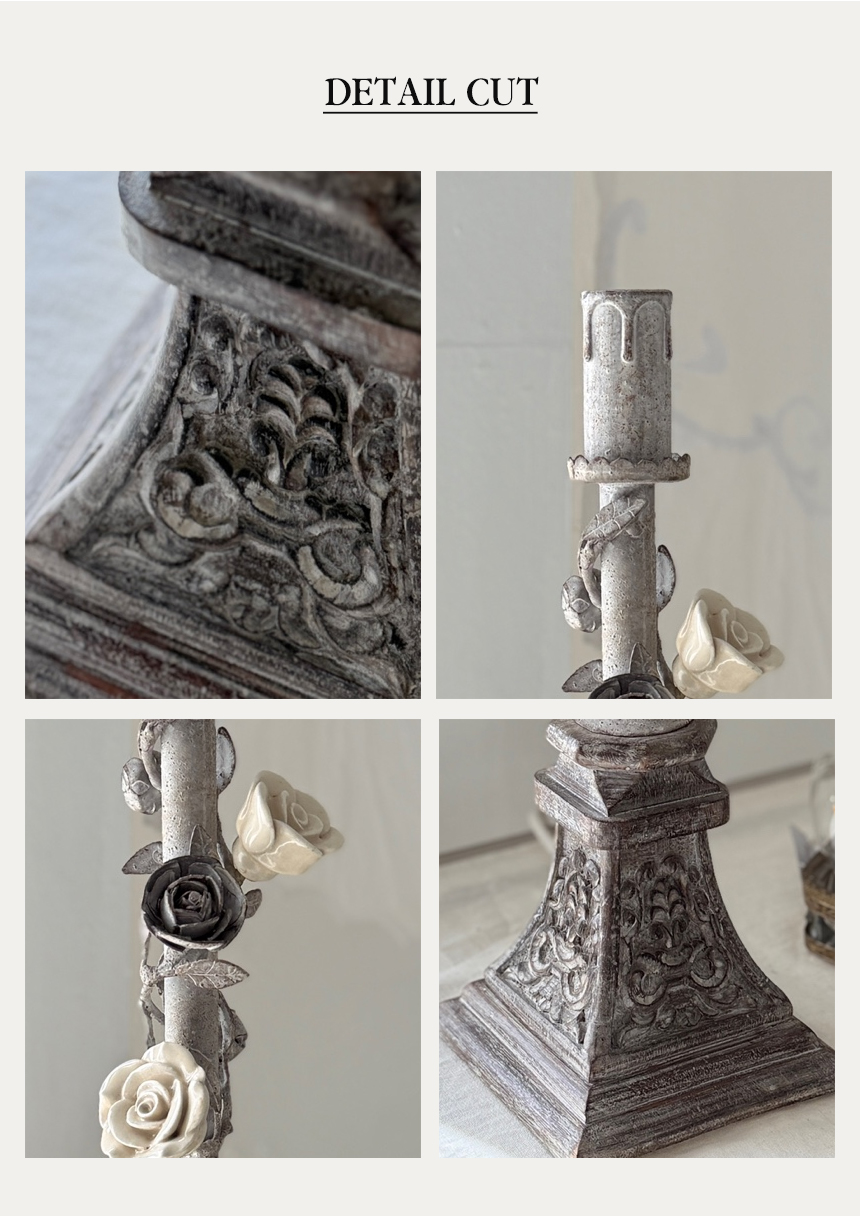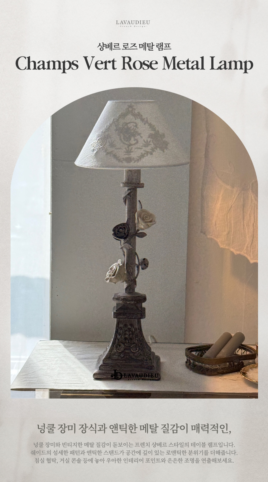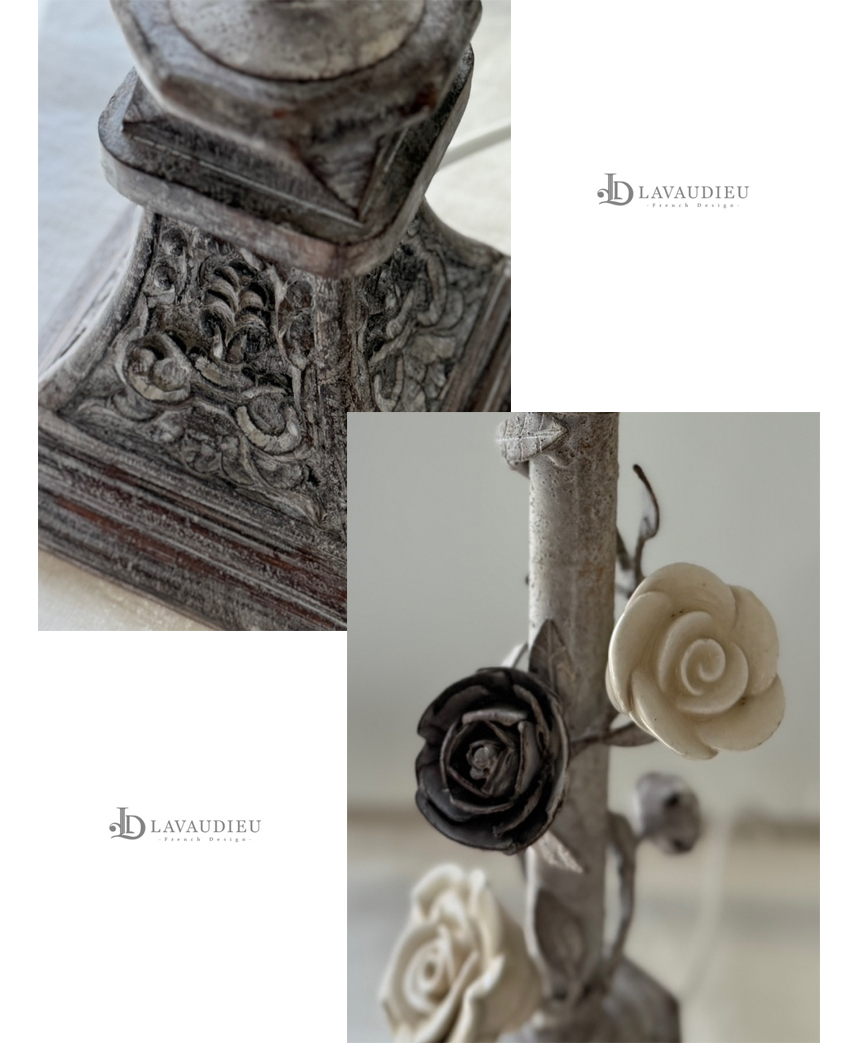 넝쿨 장미와 빈티지한 메탈 질감이 돋보이는 프렌치 샹베르 스타일의 테이블 램프입니다.