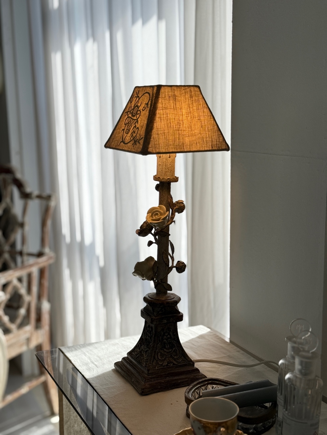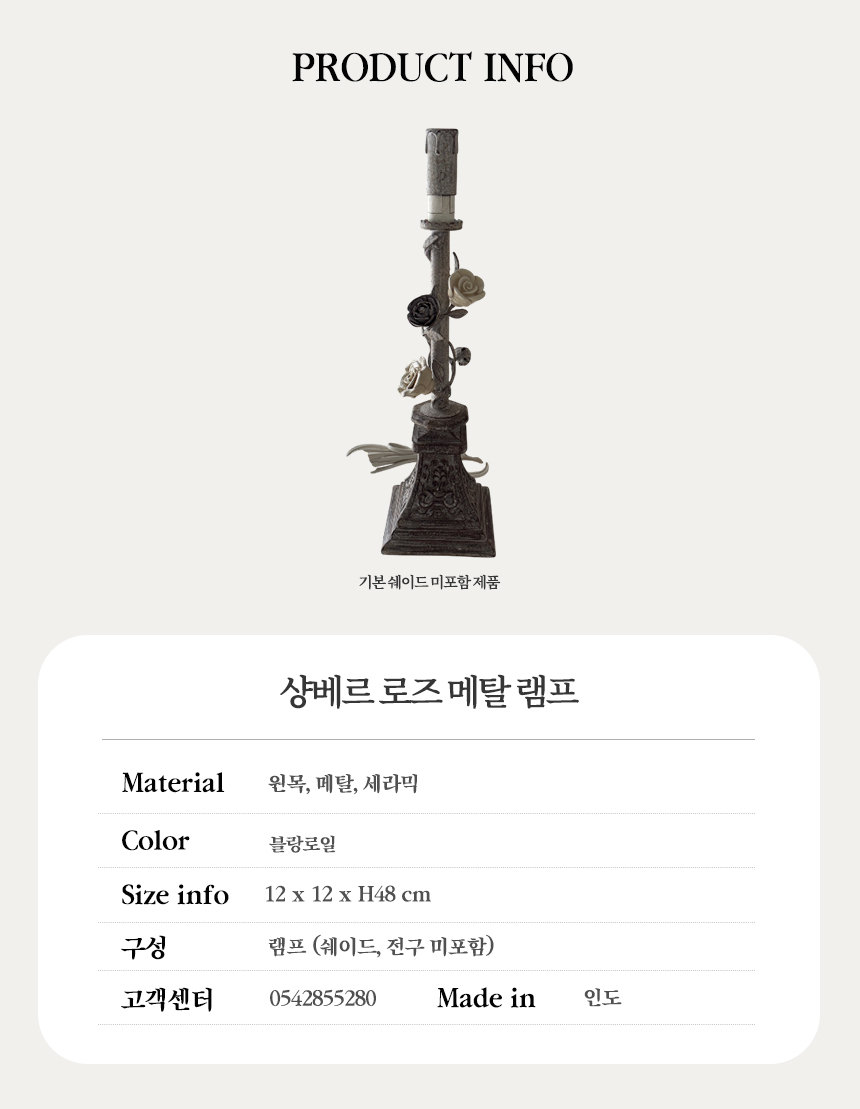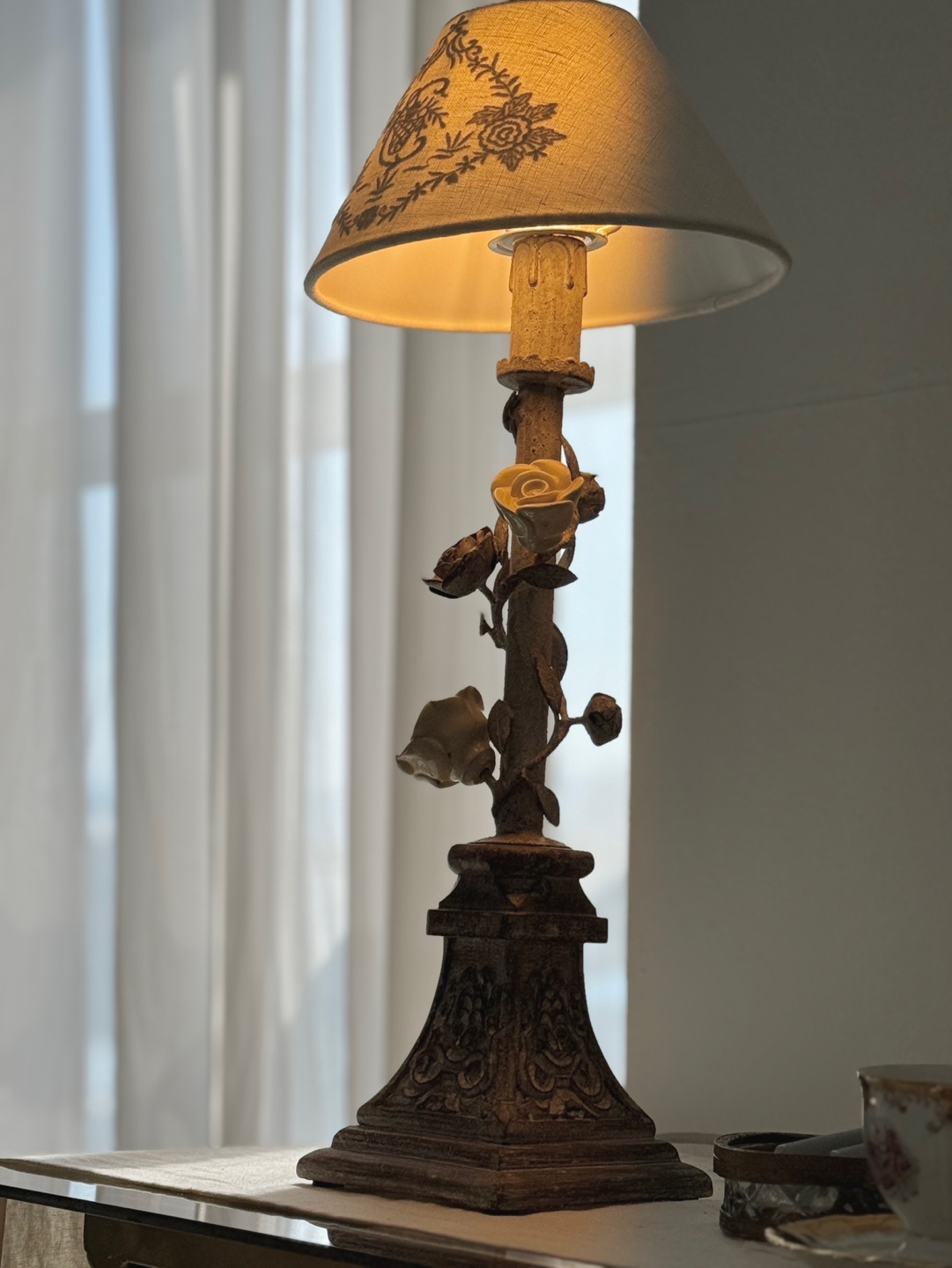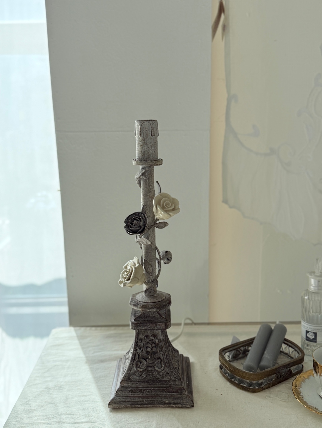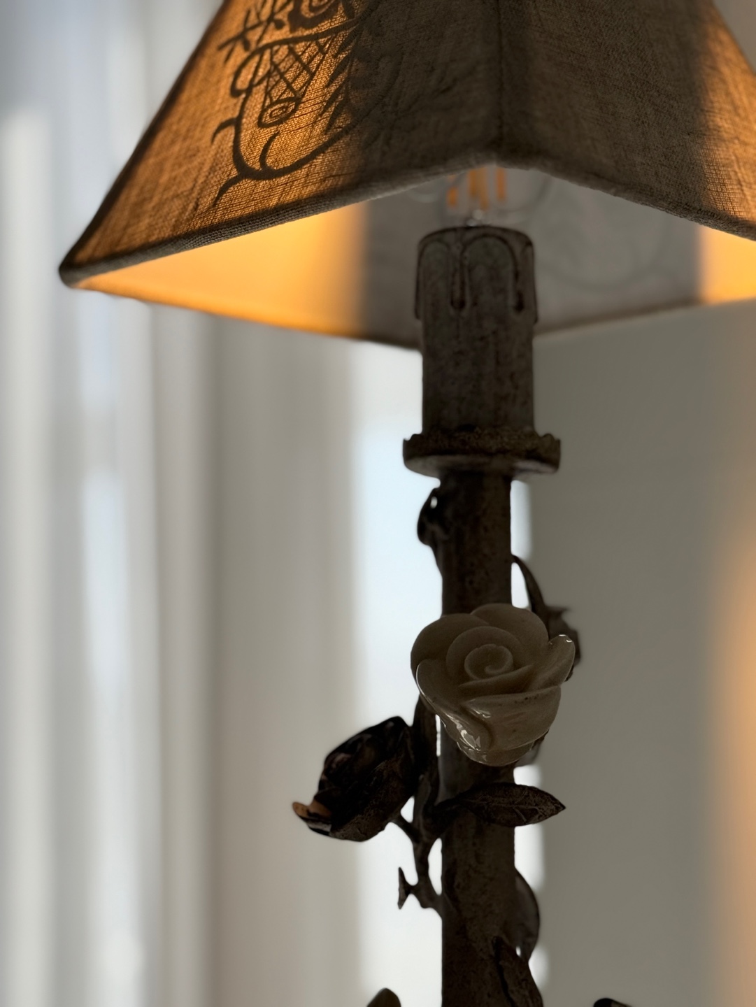 넝쿨 장미와 빈티지한 메탈 질감이 돋보이는 프렌치 샹베르 스타일의 테이블 램프입니다.