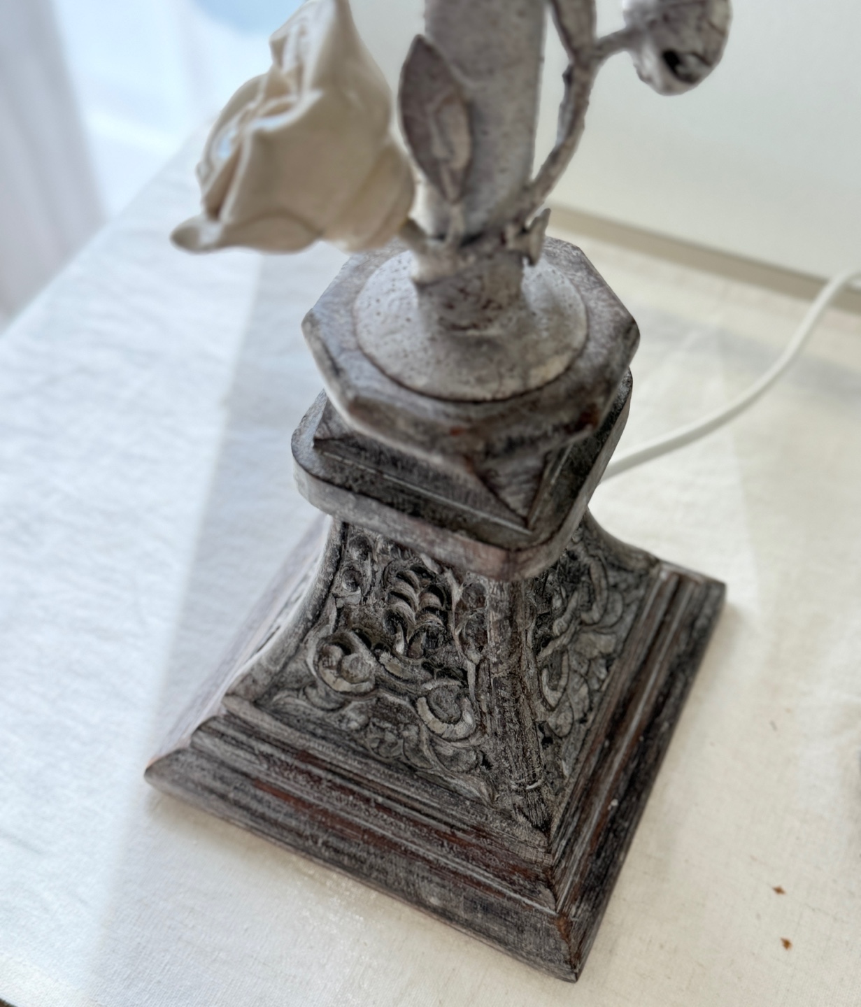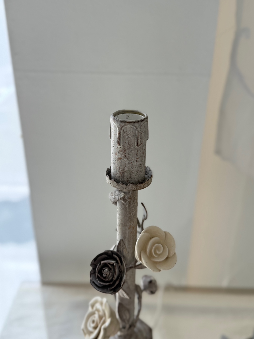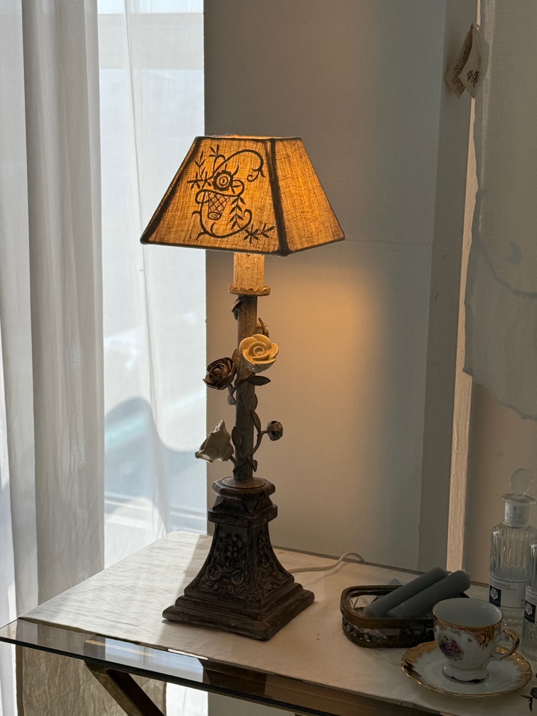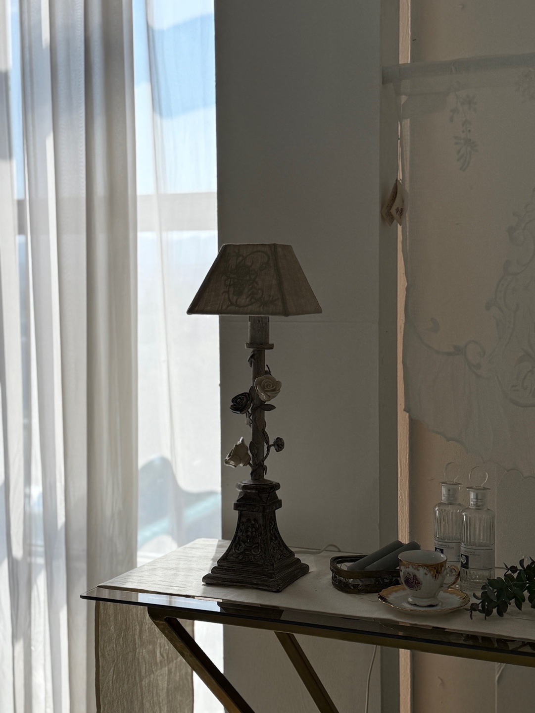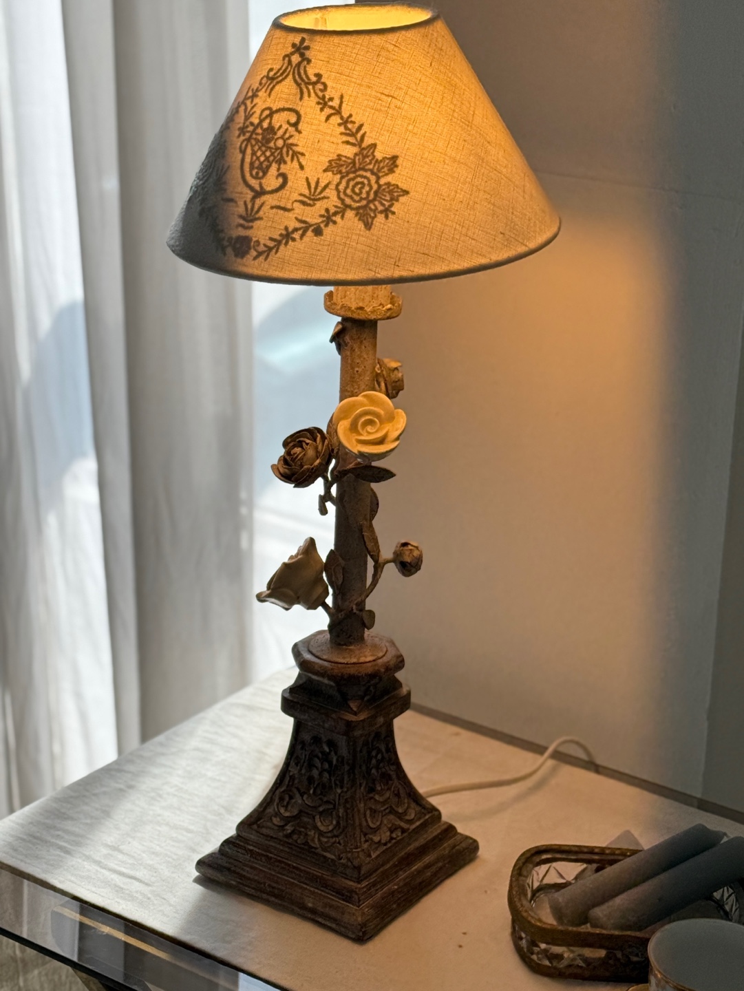 넝쿨 장미와 빈티지한 메탈 질감이 돋보이는 프렌치 샹베르 스타일의 테이블 램프입니다.