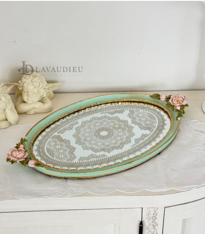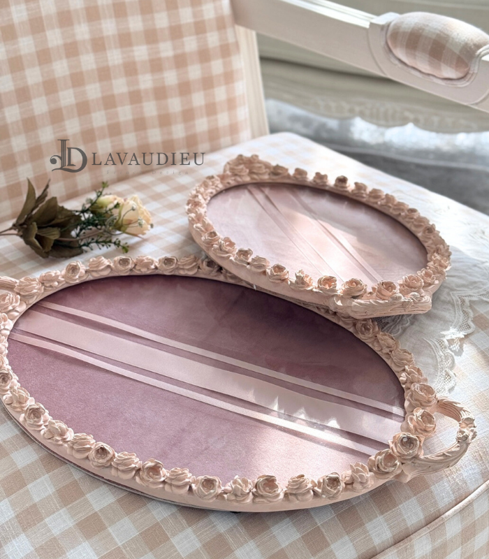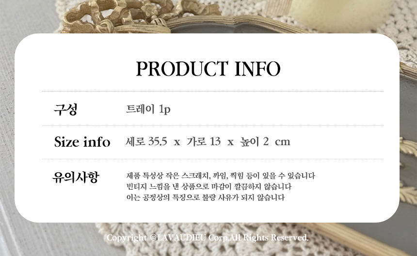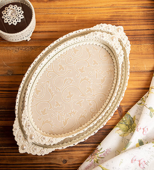 곡선이 돋보이는 오벌 형태와 정교한 조각이 어우러져 우아한 매력을 선사하는 트레이입니다.