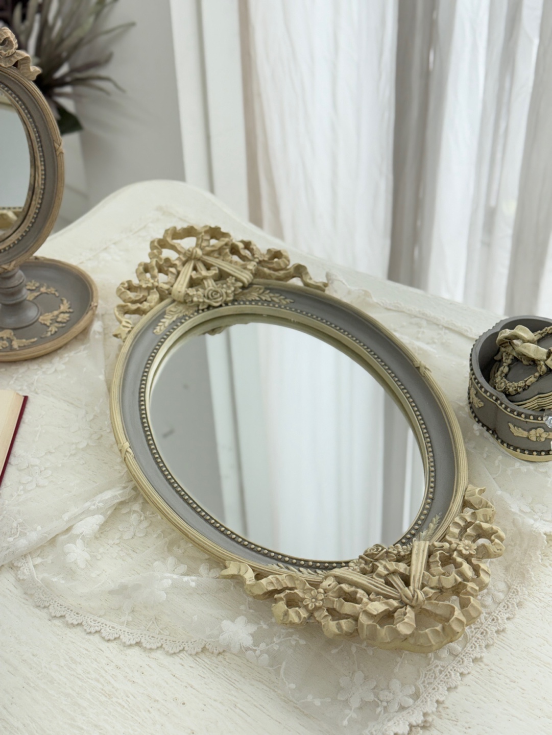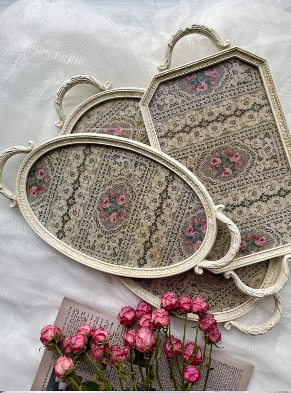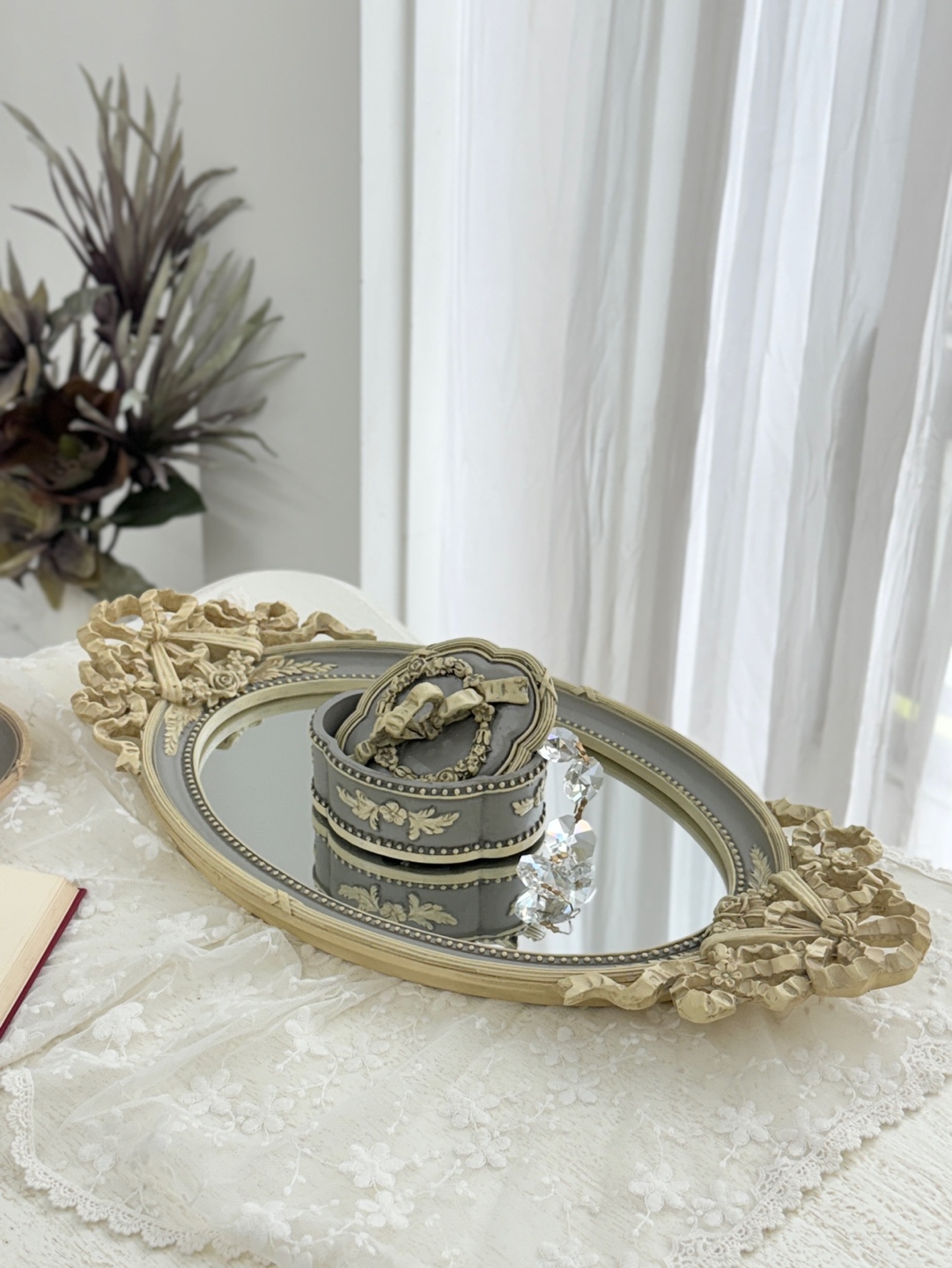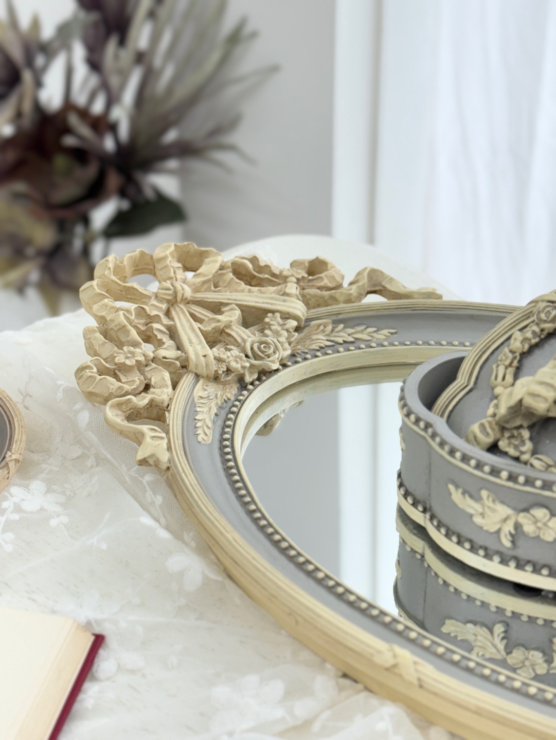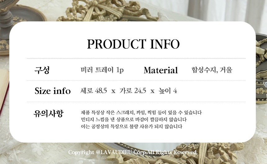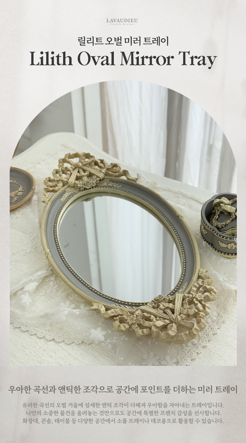 유려한 곡선의 오벌 거울에 섬세한 앤틱 조각이 더해져 우아함을 자아내는 트레이입니다.