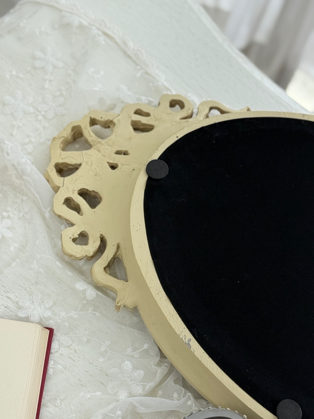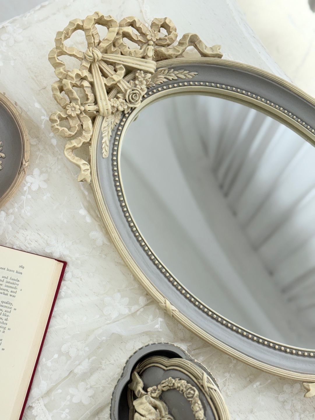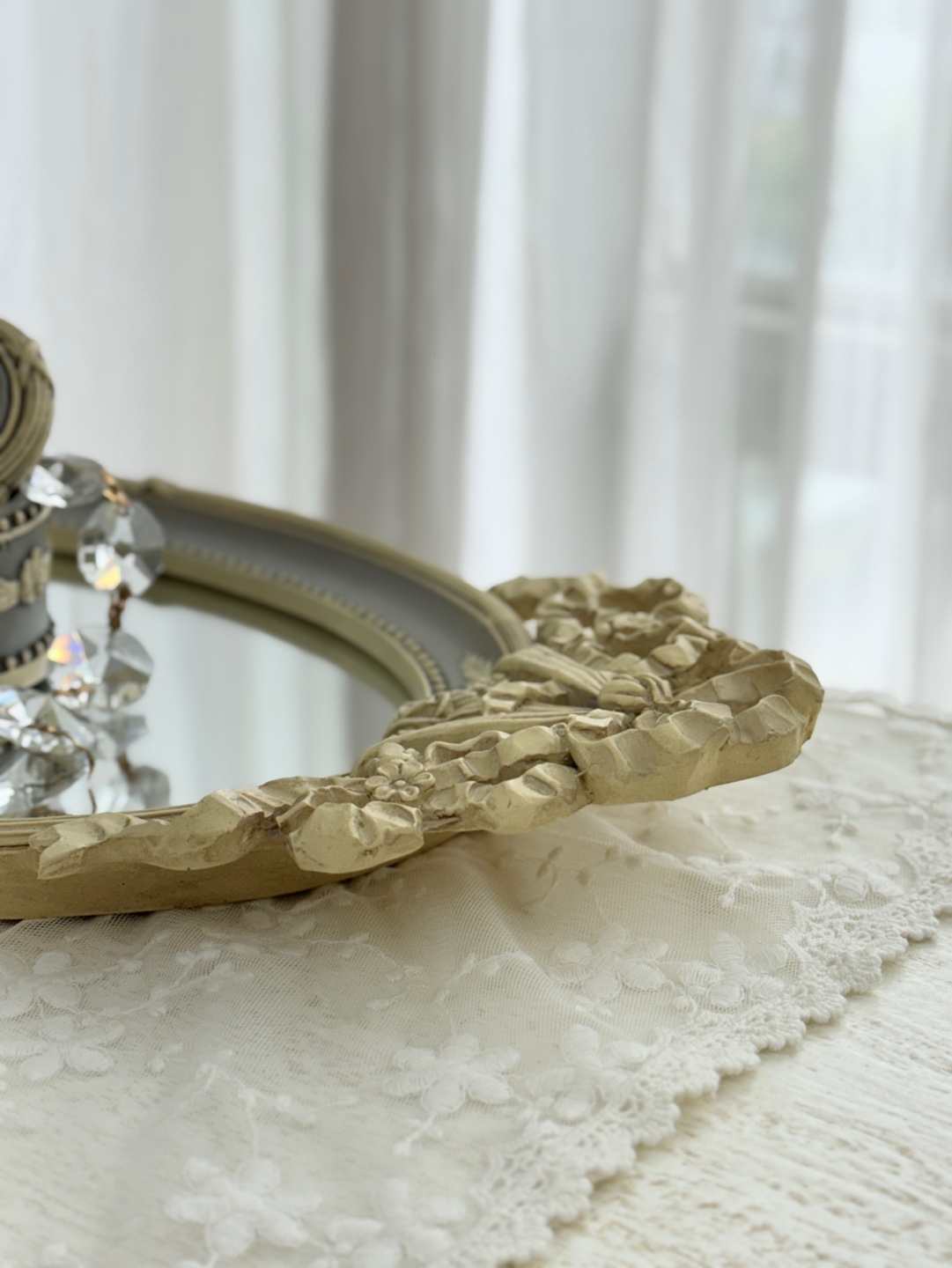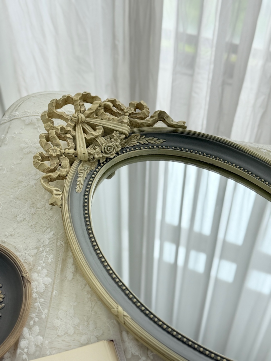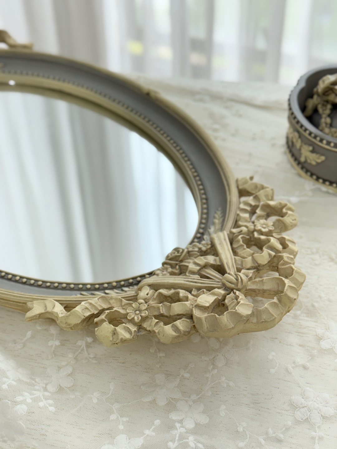 유려한 곡선의 오벌 거울에 섬세한 앤틱 조각이 더해져 우아함을 자아내는 트레이입니다.