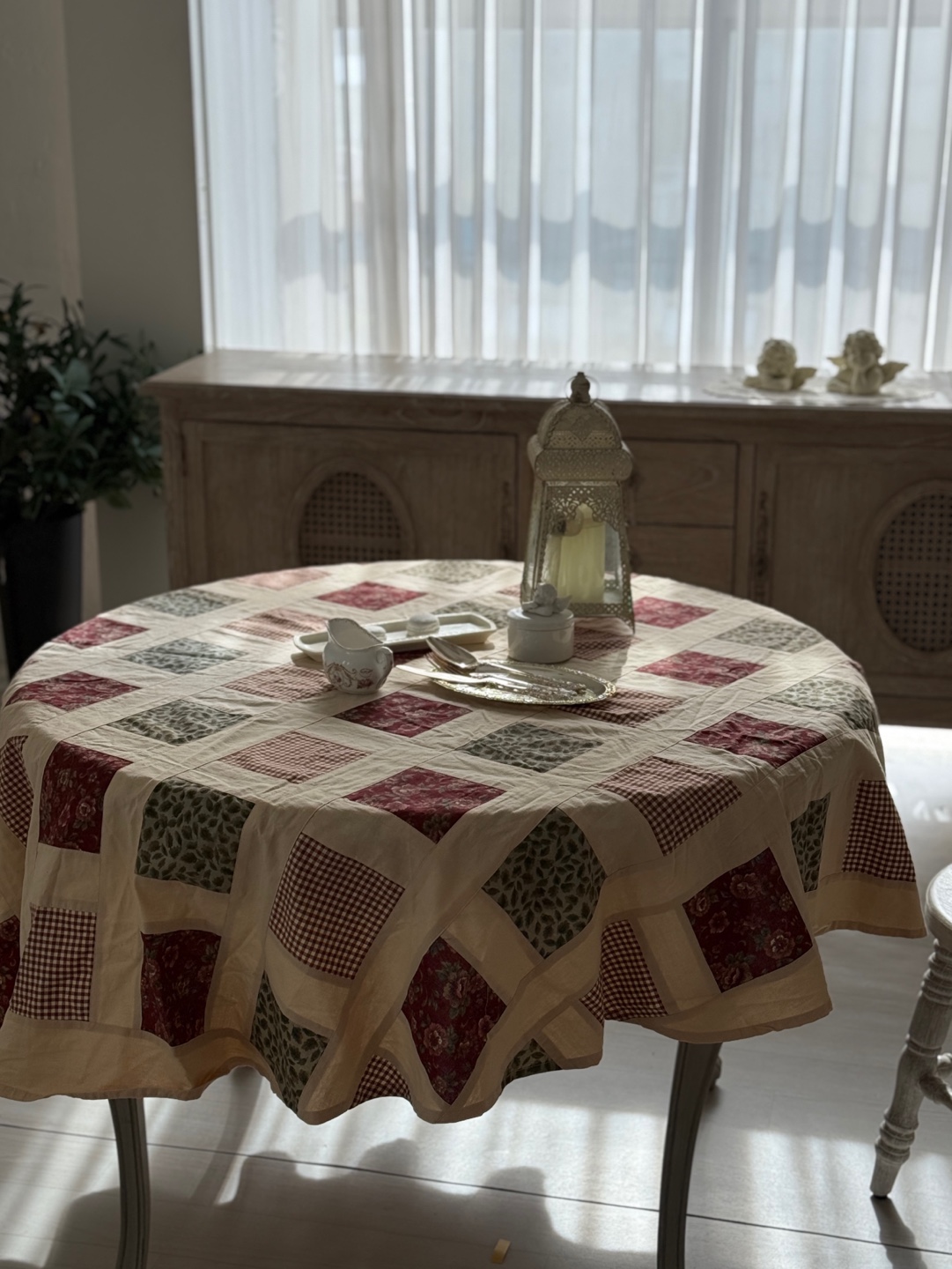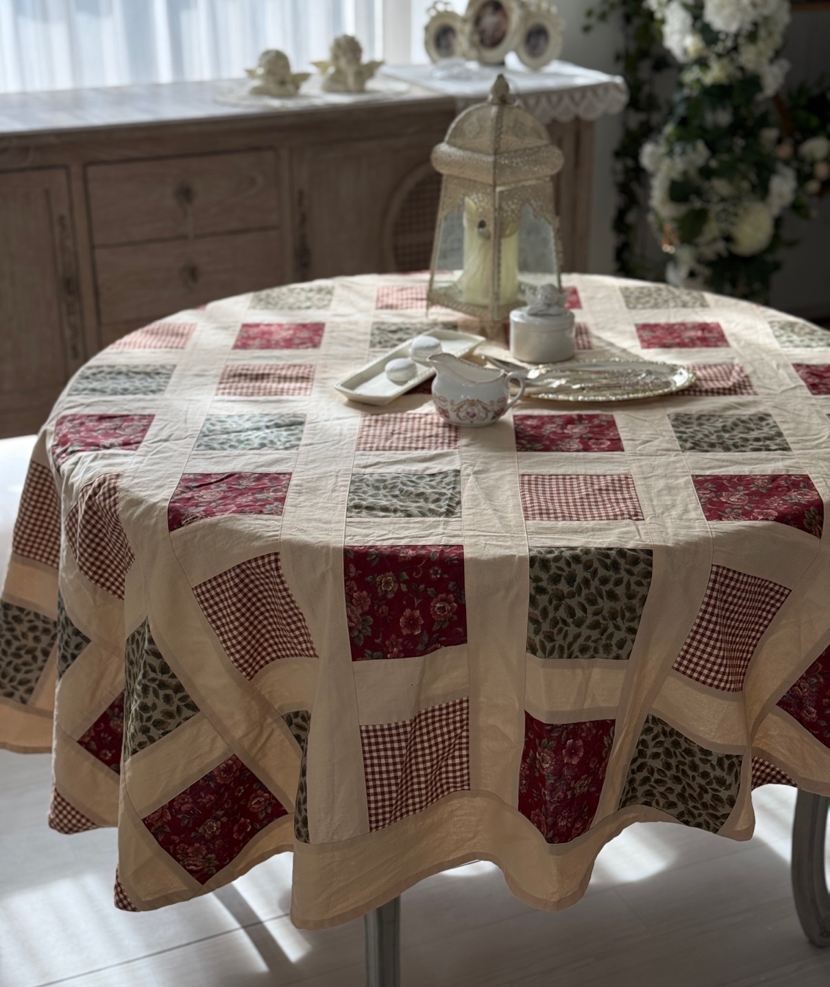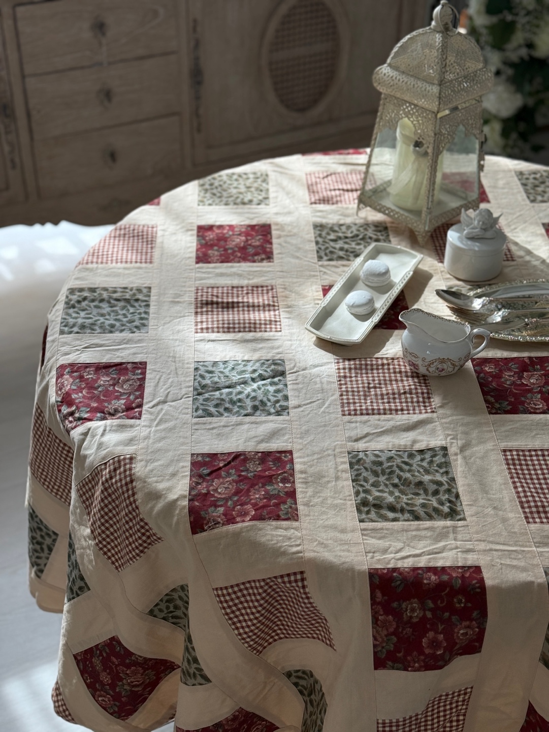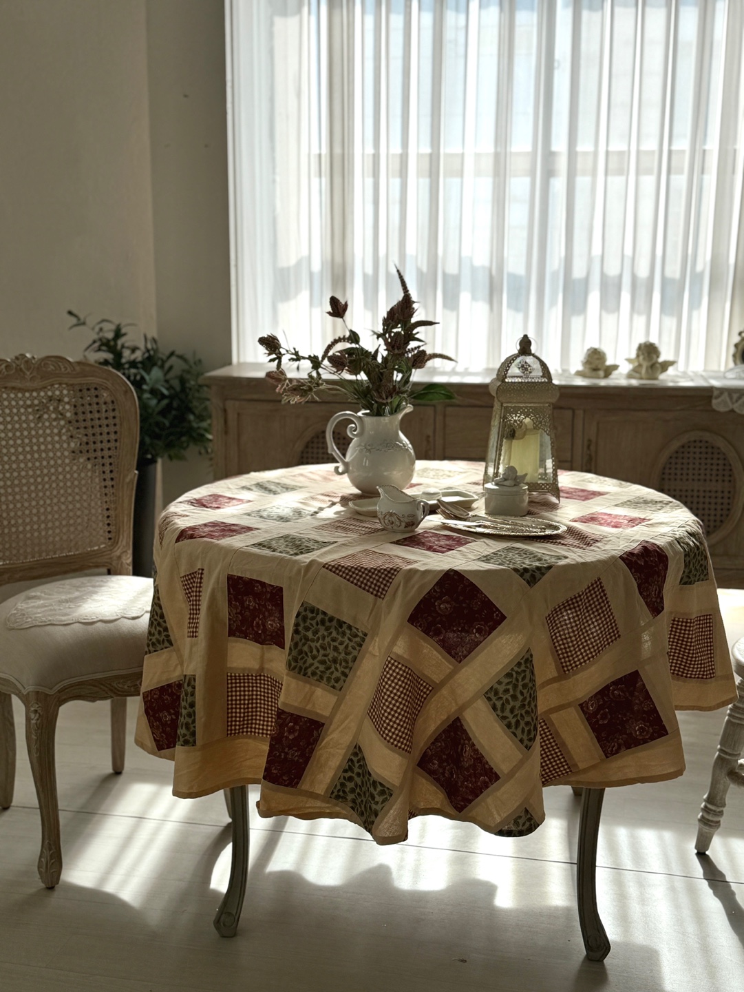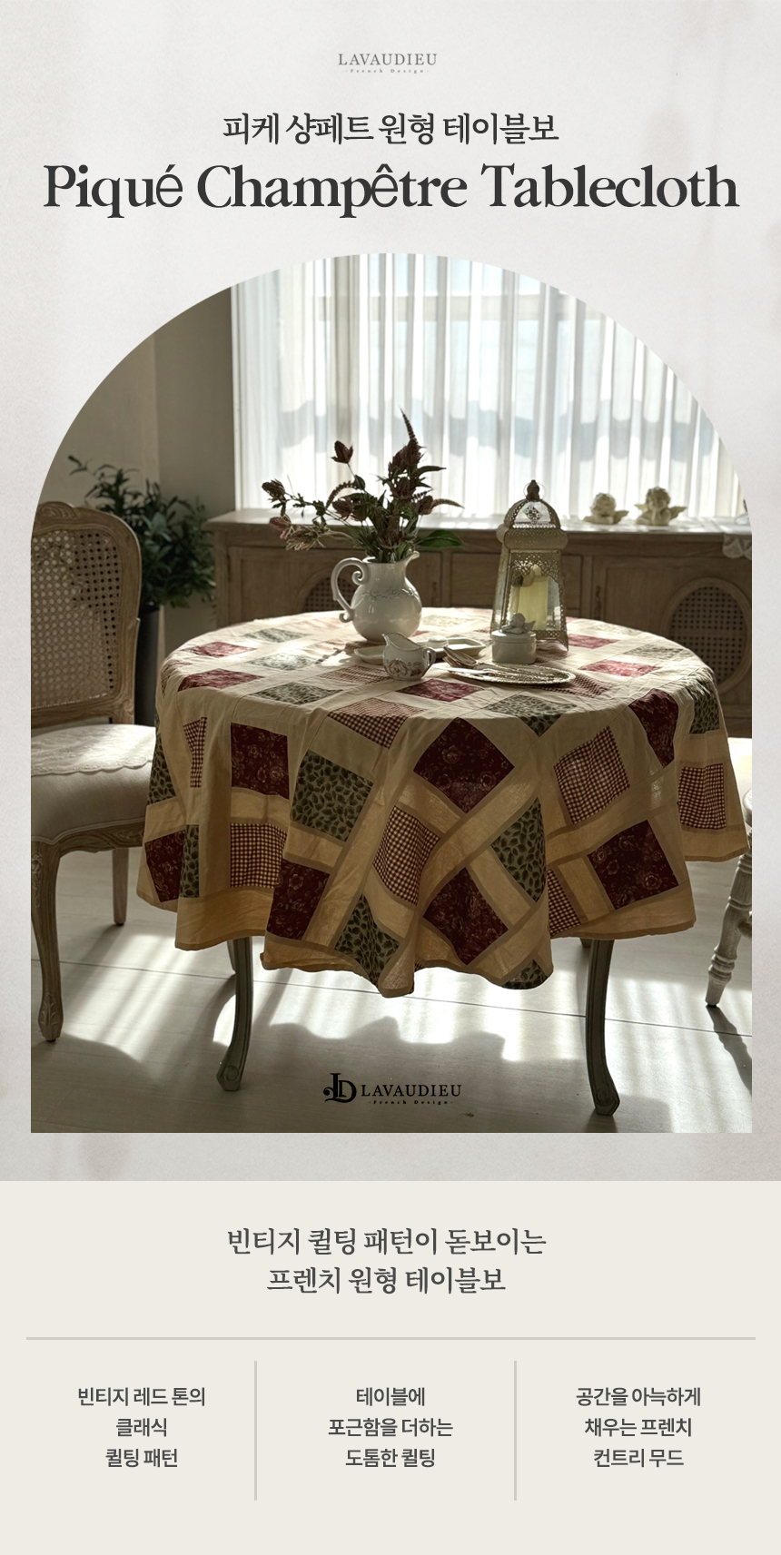 빈티지 퀼팅 패턴이 돋보이는 프렌치 원형 테이블보