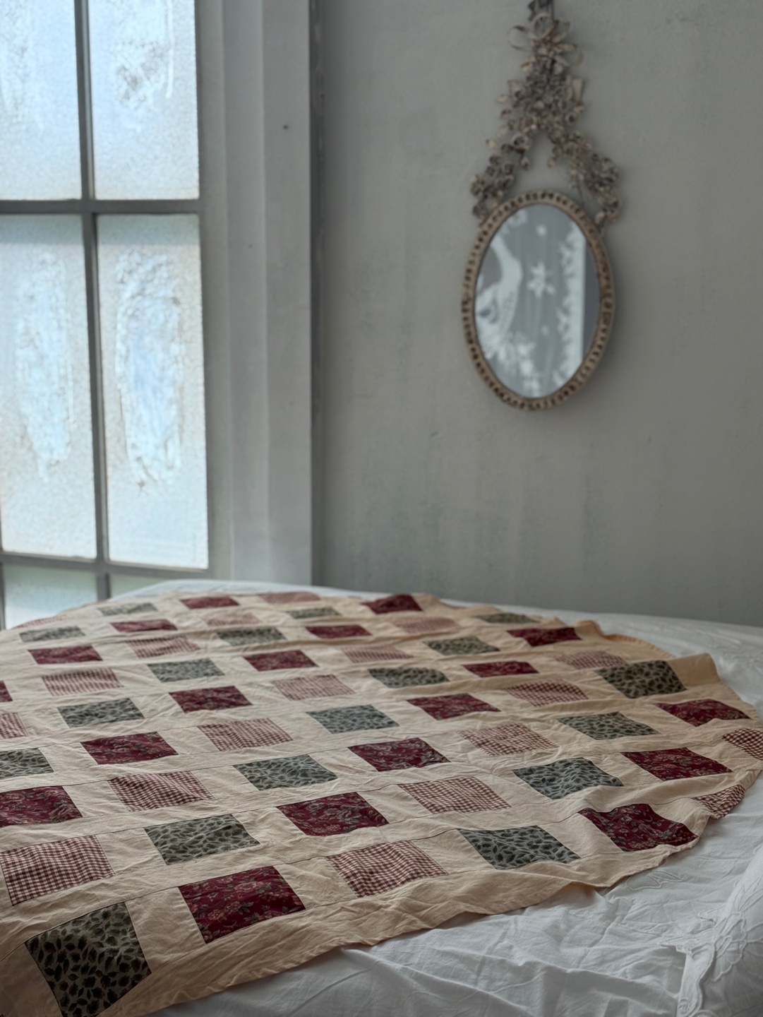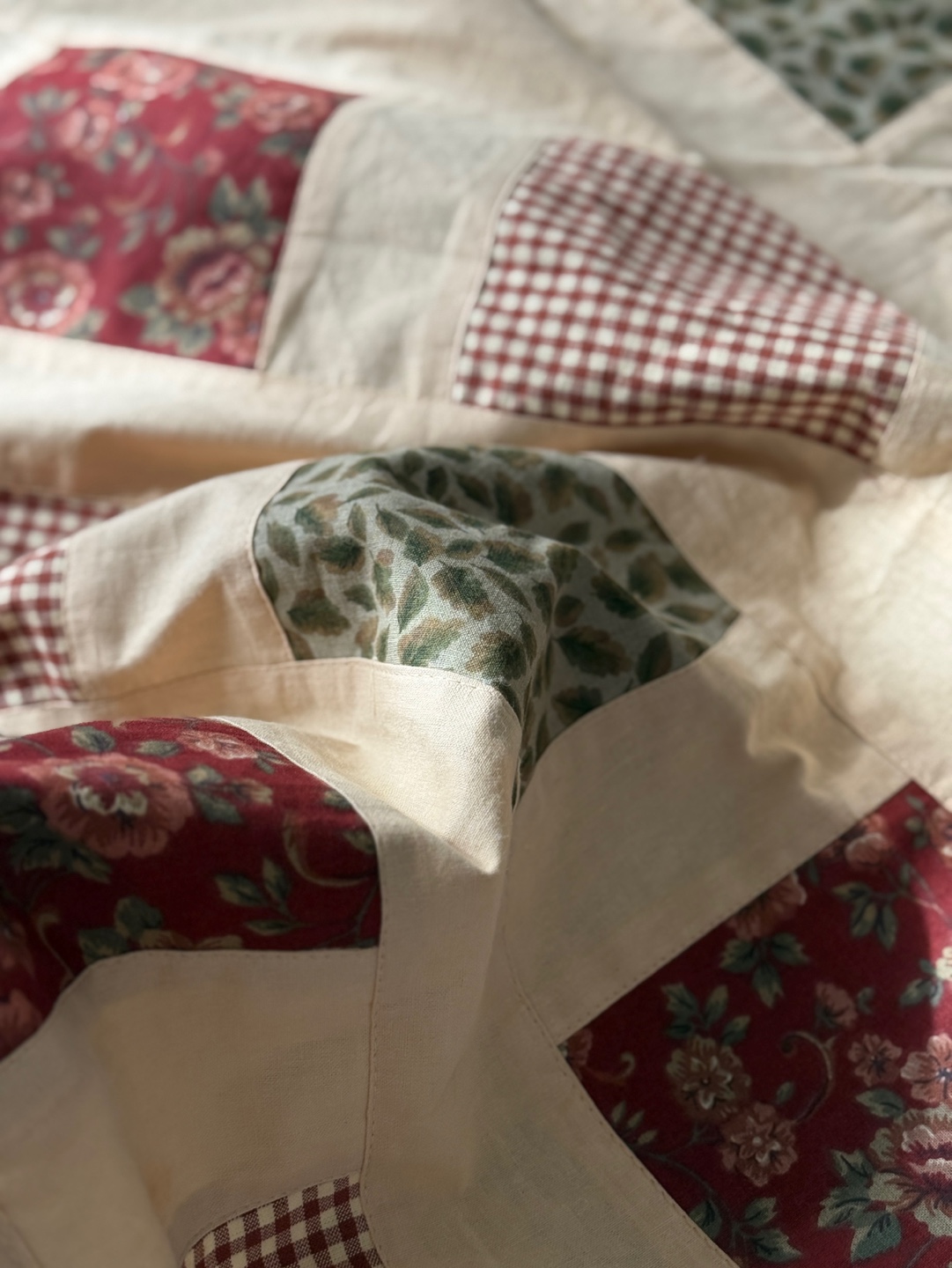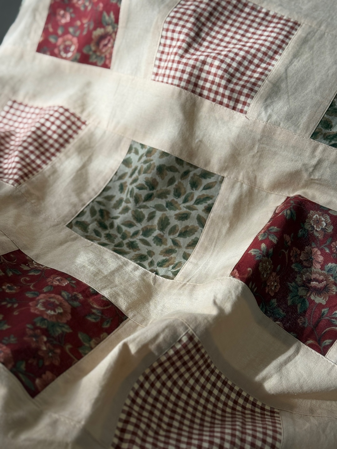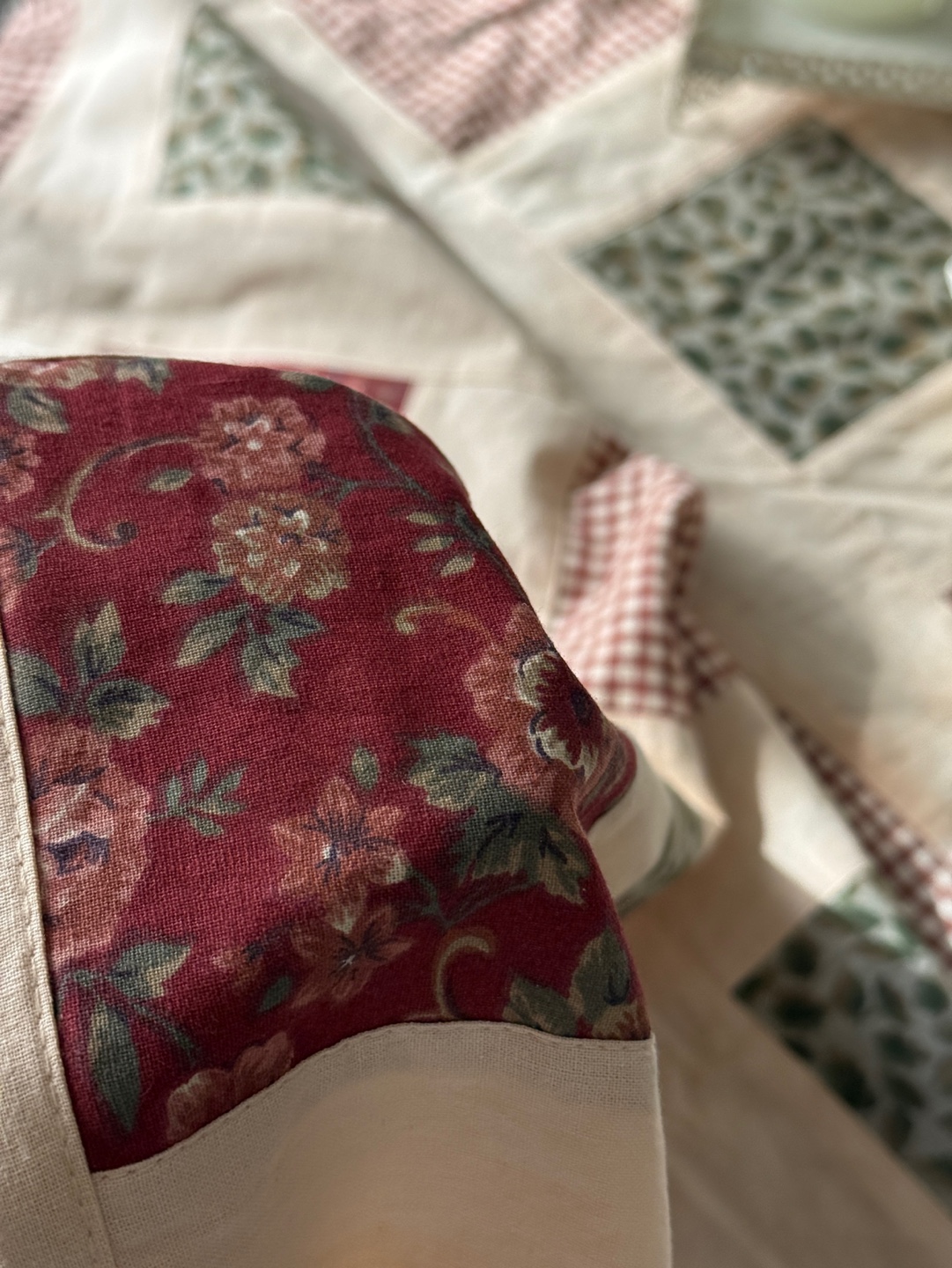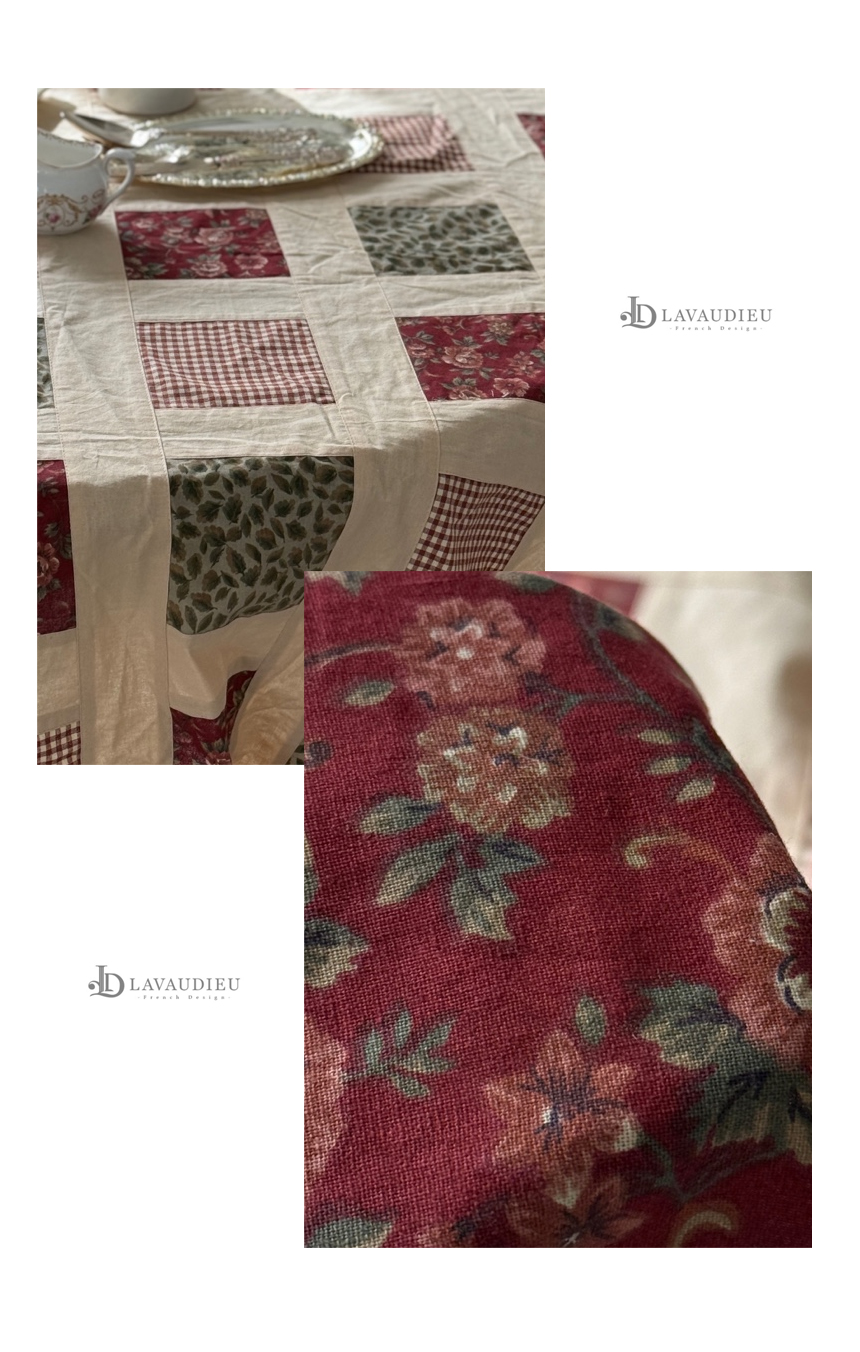 레드와 베이지 톤의 클래식한 퀼팅 조각들이 이어진 핸드메이드 감성의 테이블보입니다.