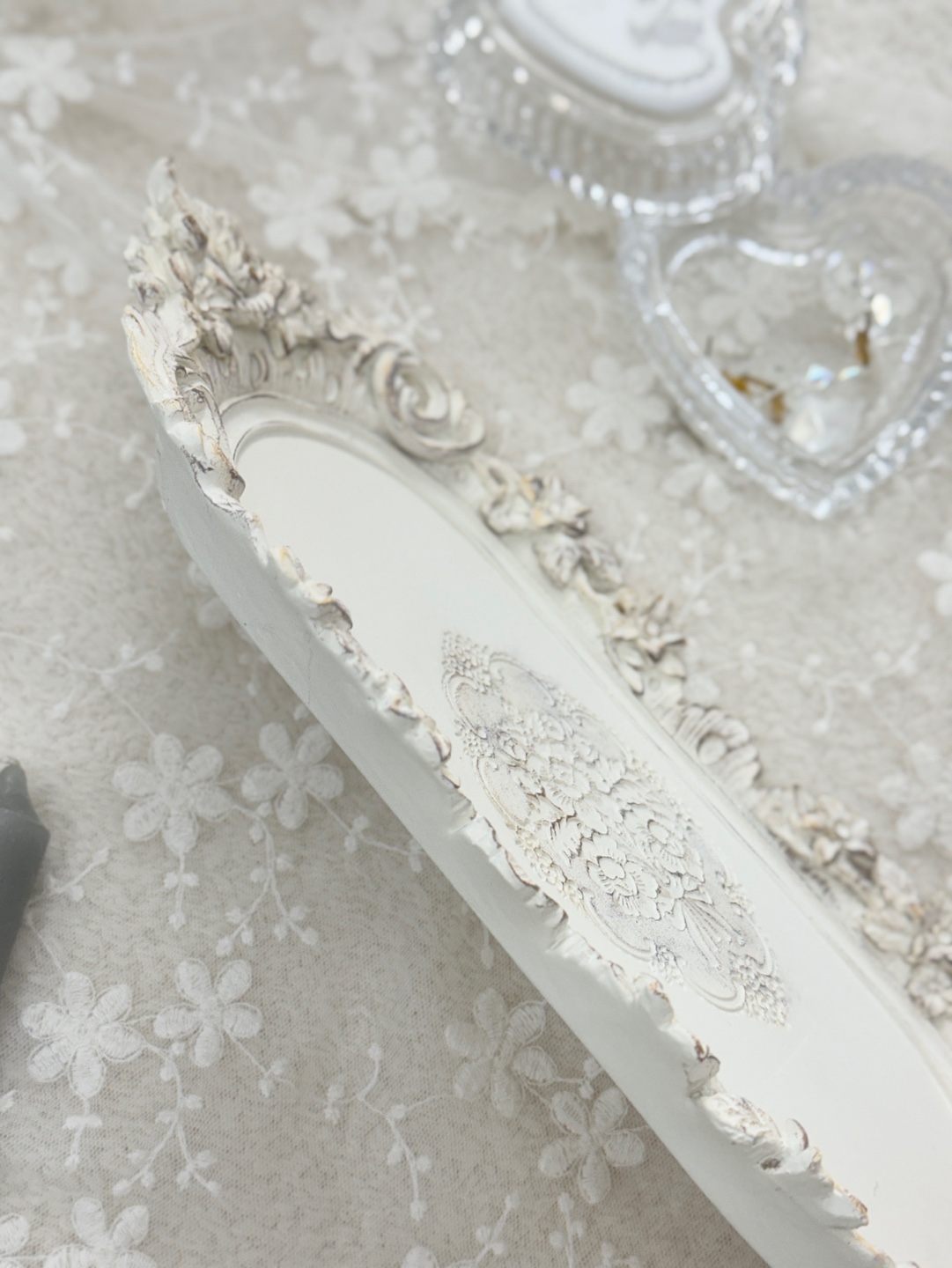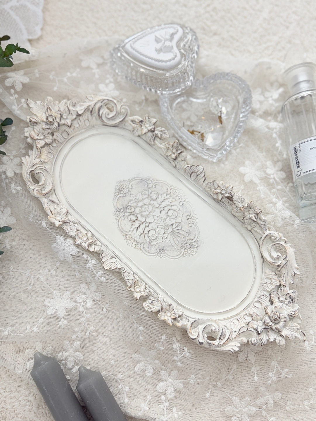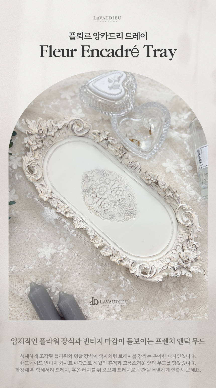 입체적인 플라워 장식과 빈티지 마감이 돋보이는 프렌치 앤틱 무드의 장식 트레이.