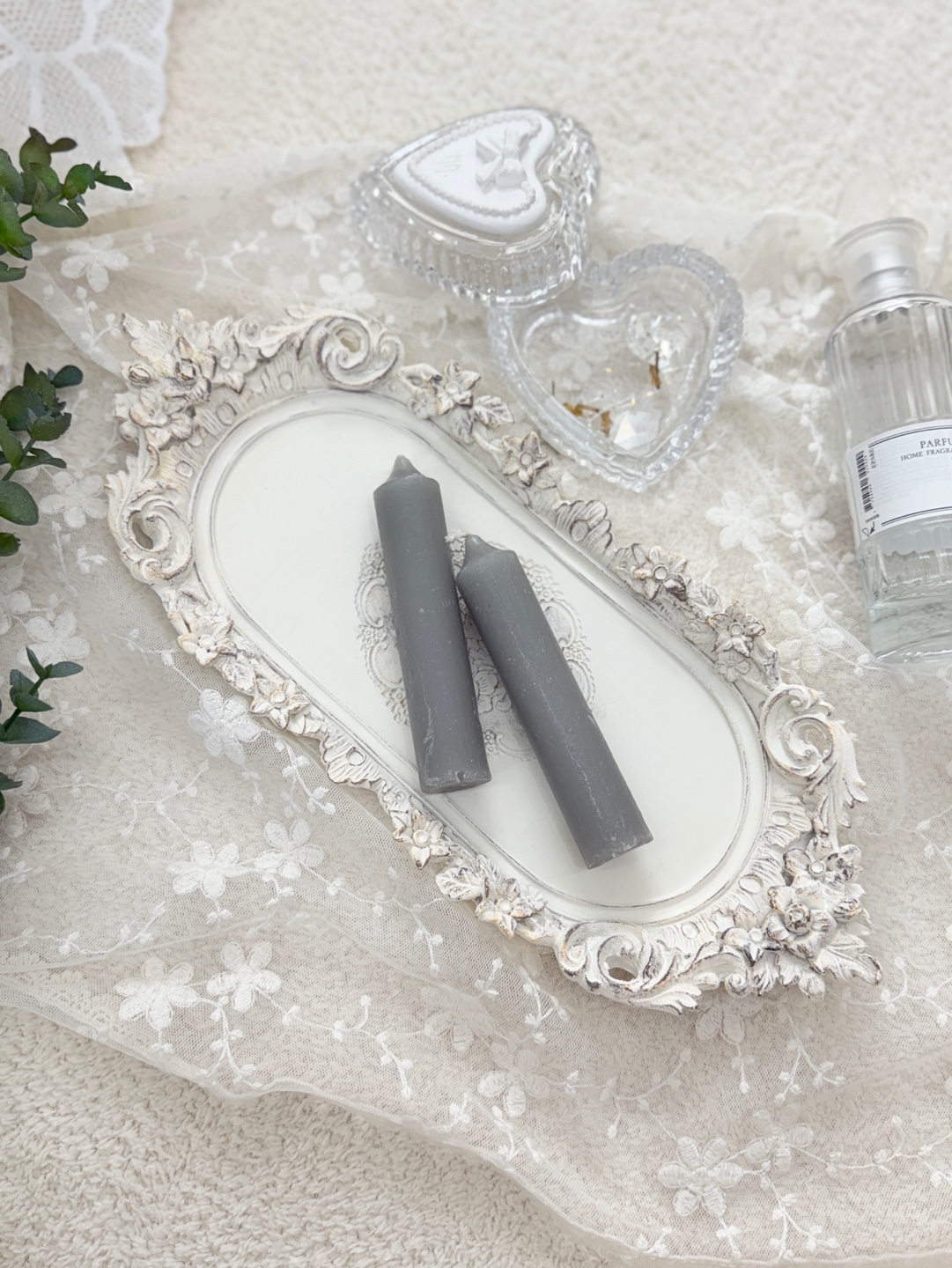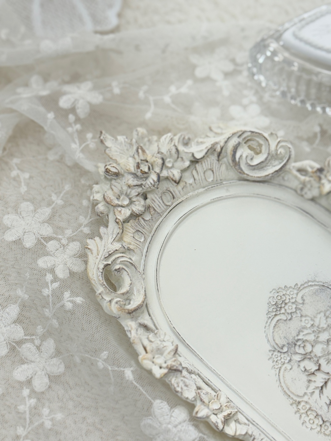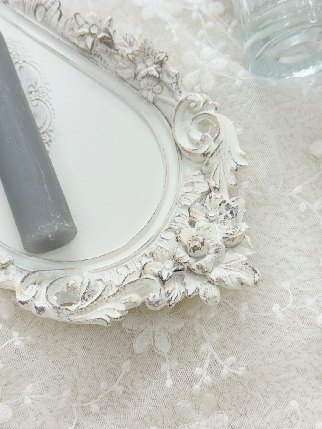 입체적인 플라워 장식과 빈티지 마감이 돋보이는 프렌치 앤틱 무드의 장식 트레이.