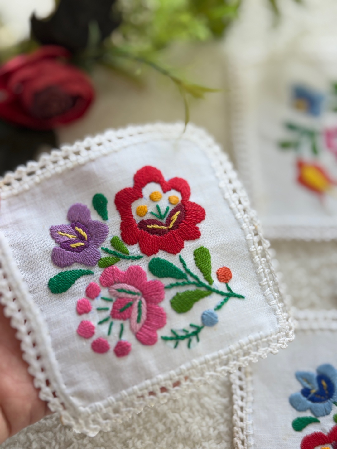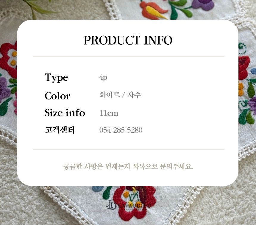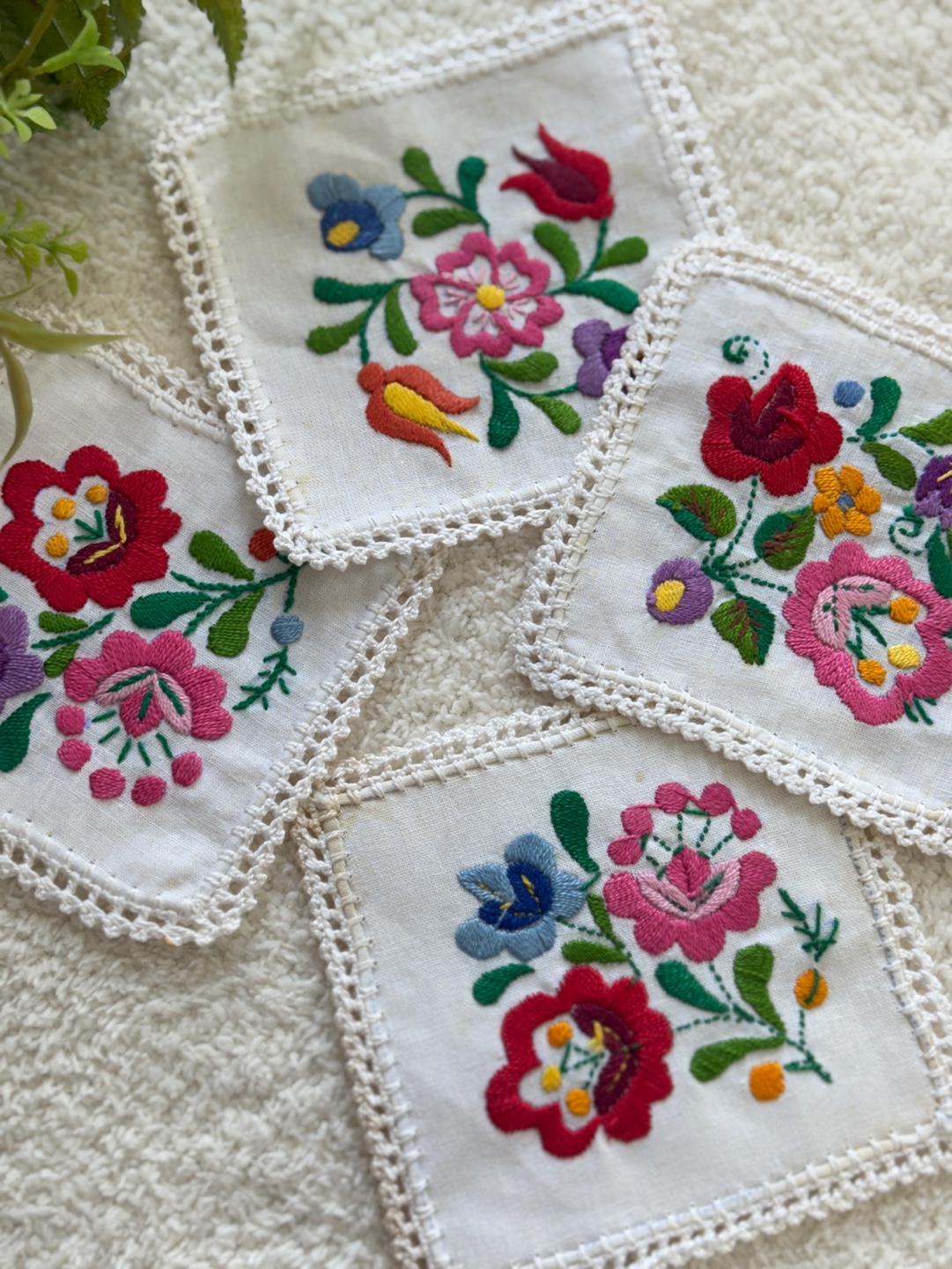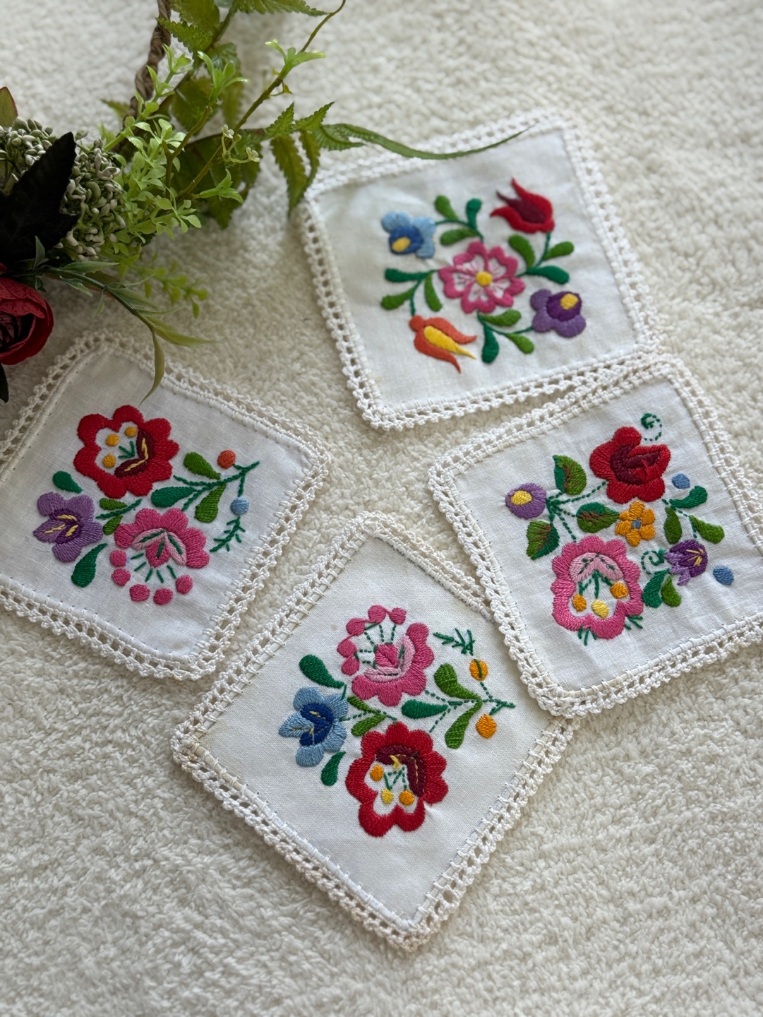 화려하고 섬세한 꽃 자수가 돋보이는 핸드메이드 감성의 코스터 세트입니다.