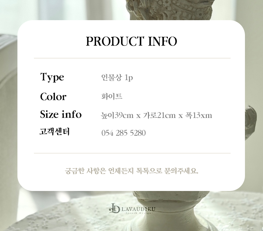 소재&마감 | 견고하고 무게감 있는 레진 소재, 고전적인 조각의 입체감을 살린 앤티크 마감