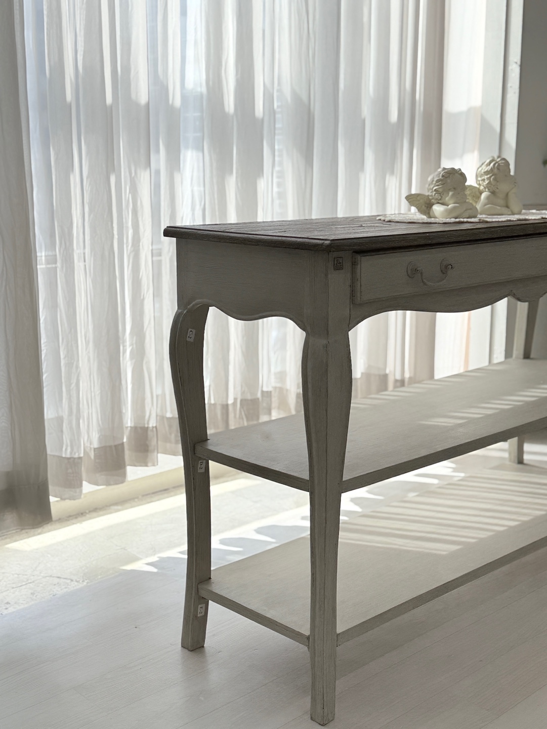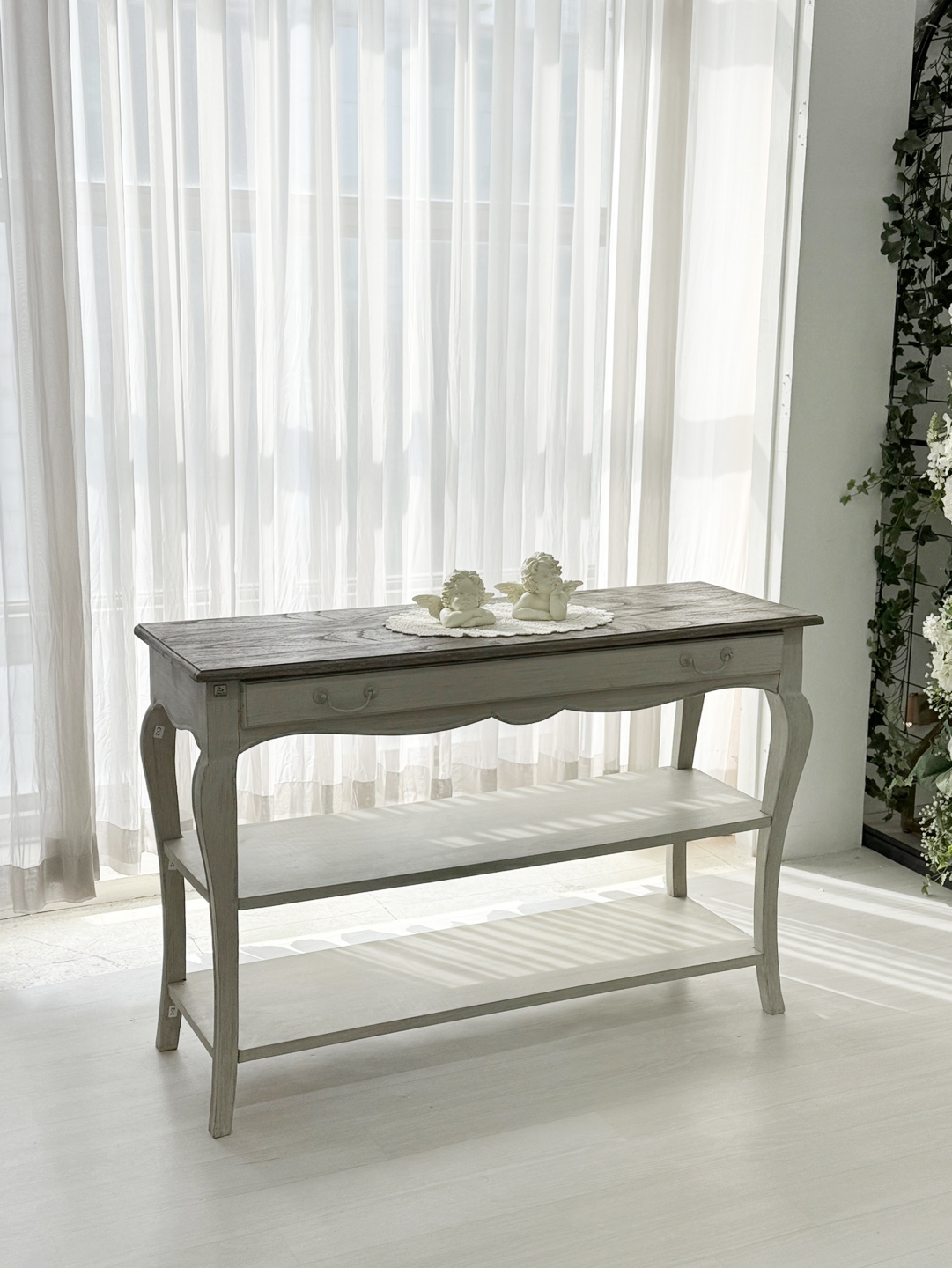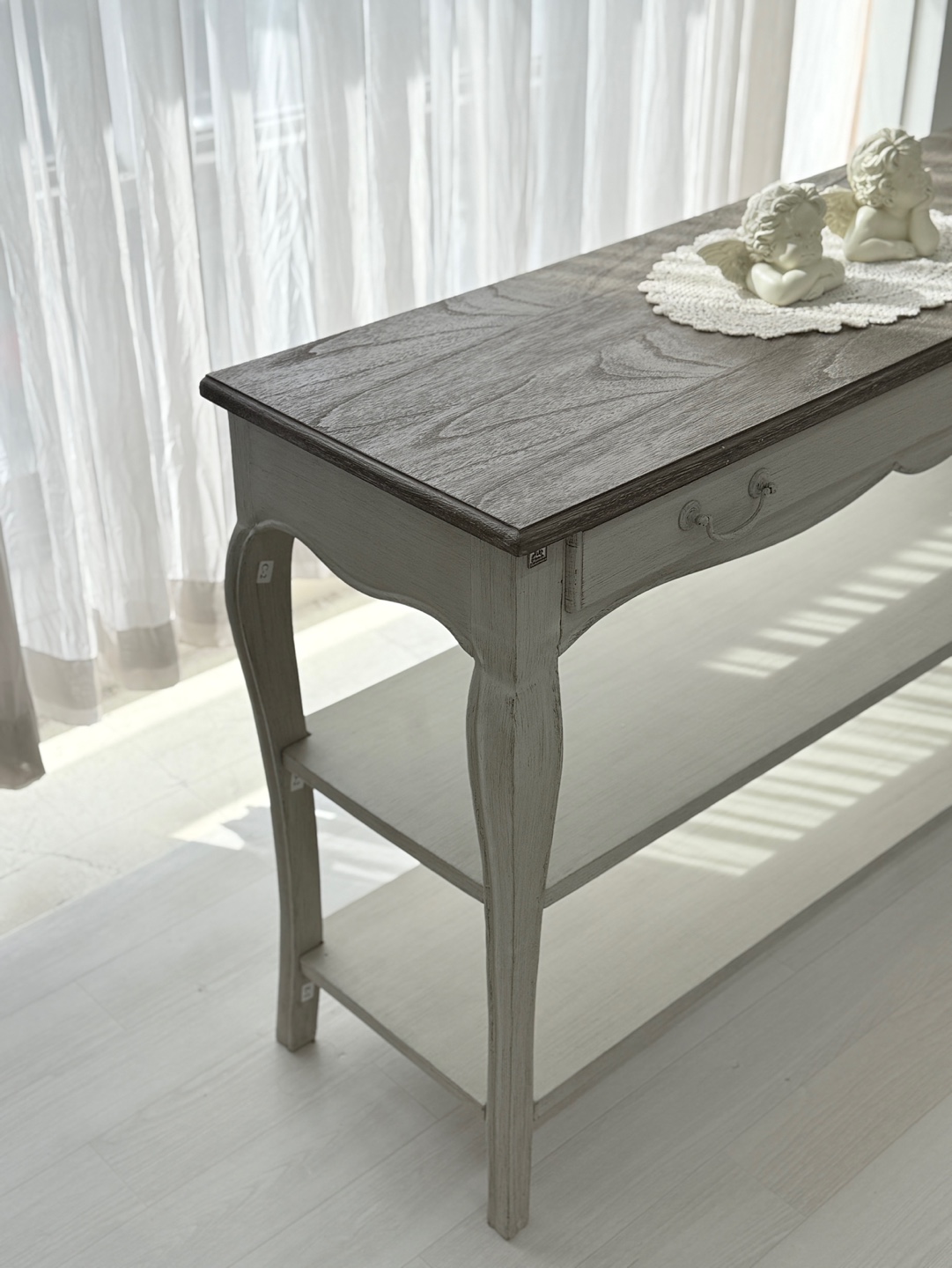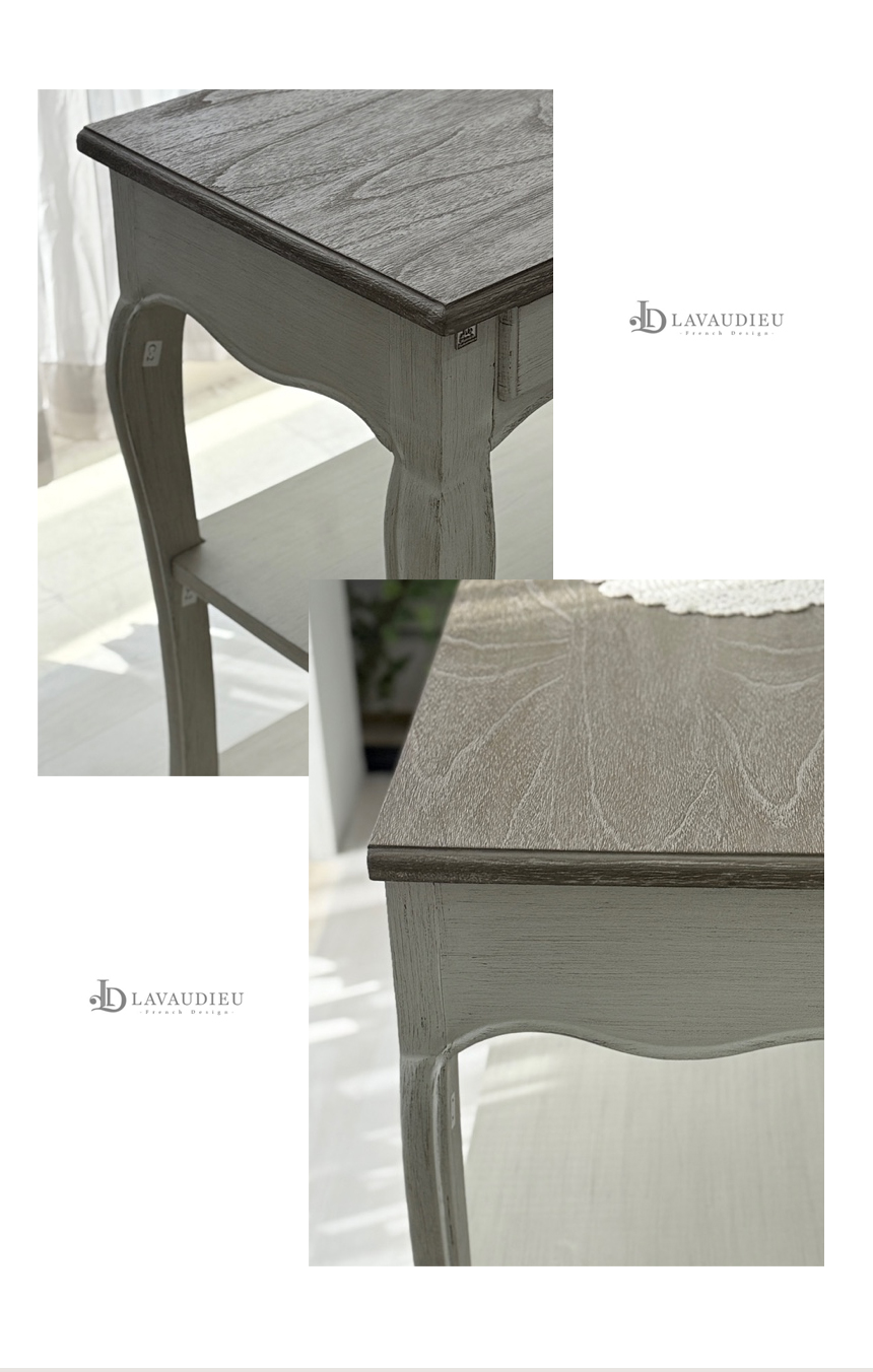 빈티지한 우드 상판과 은은한 라이트 그레이 톤의 앤티크 워싱 마감