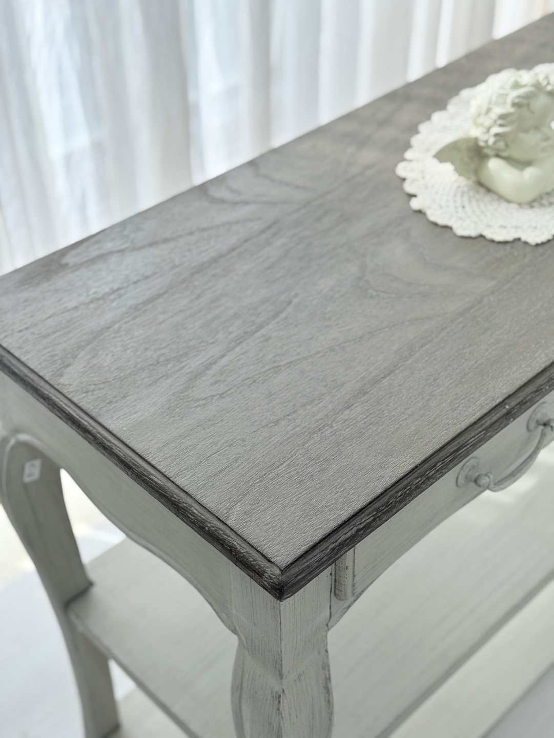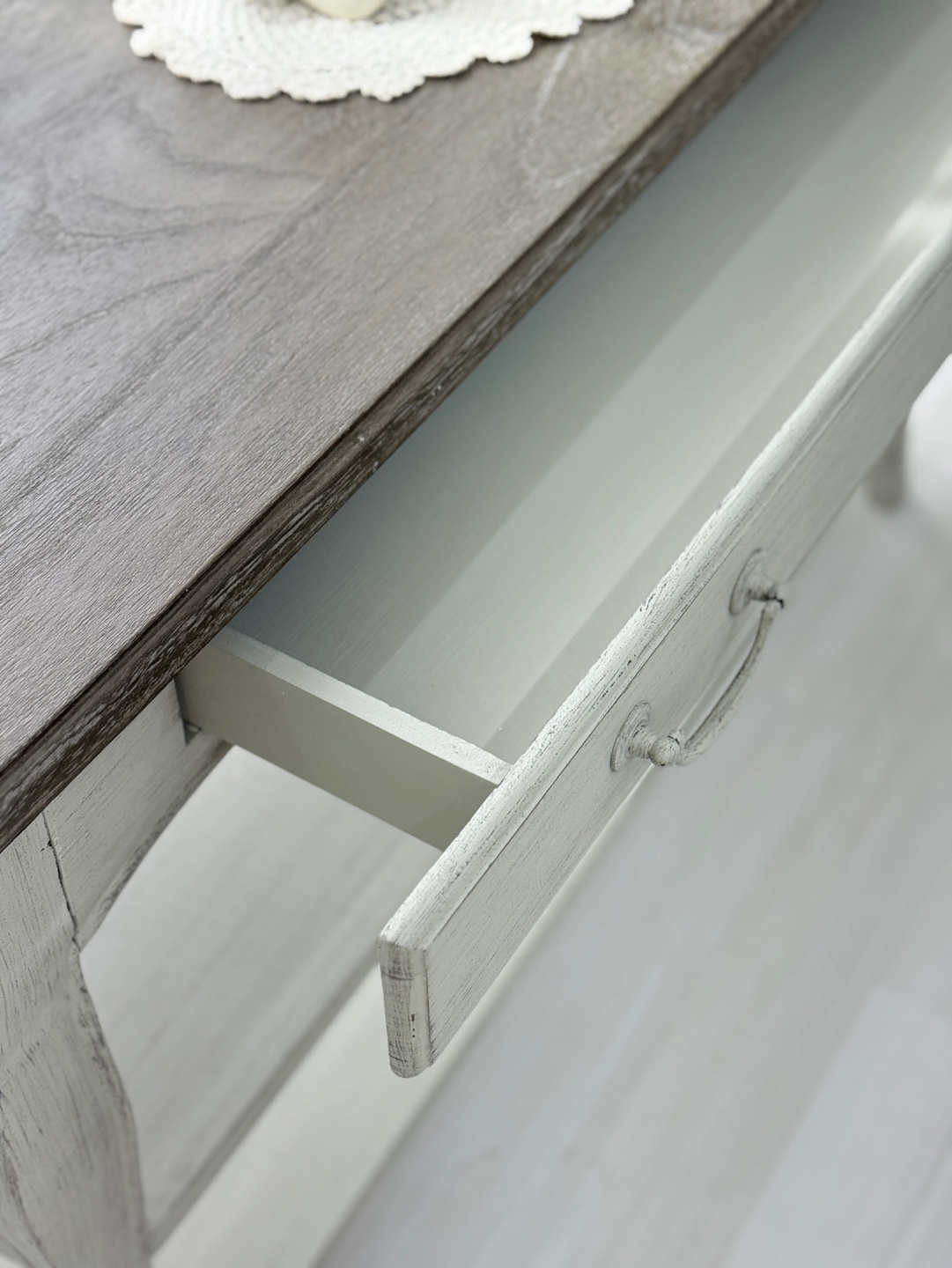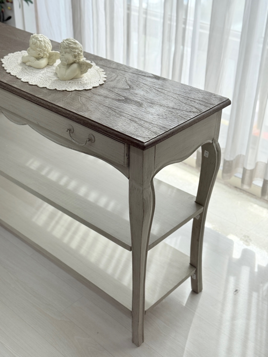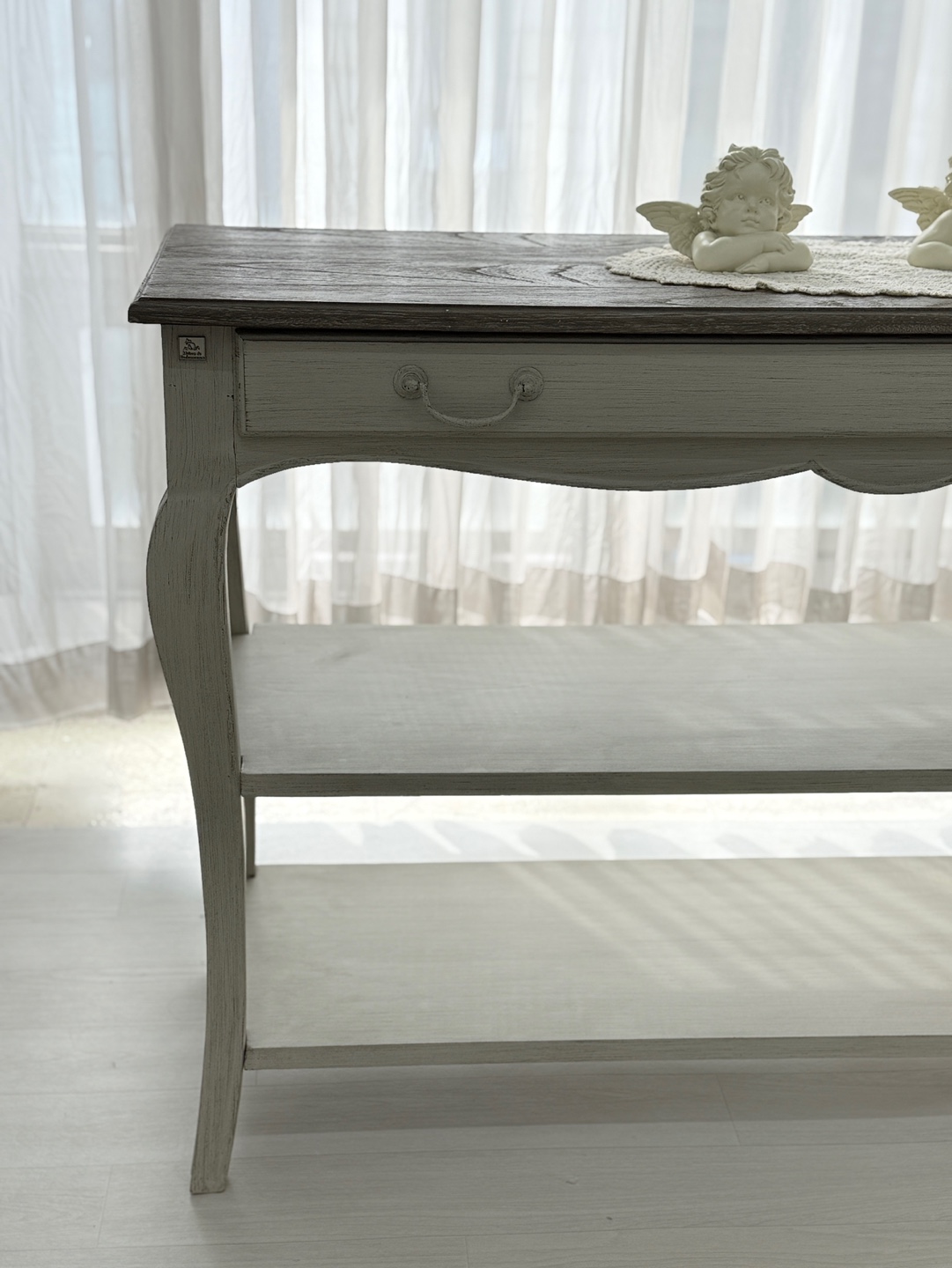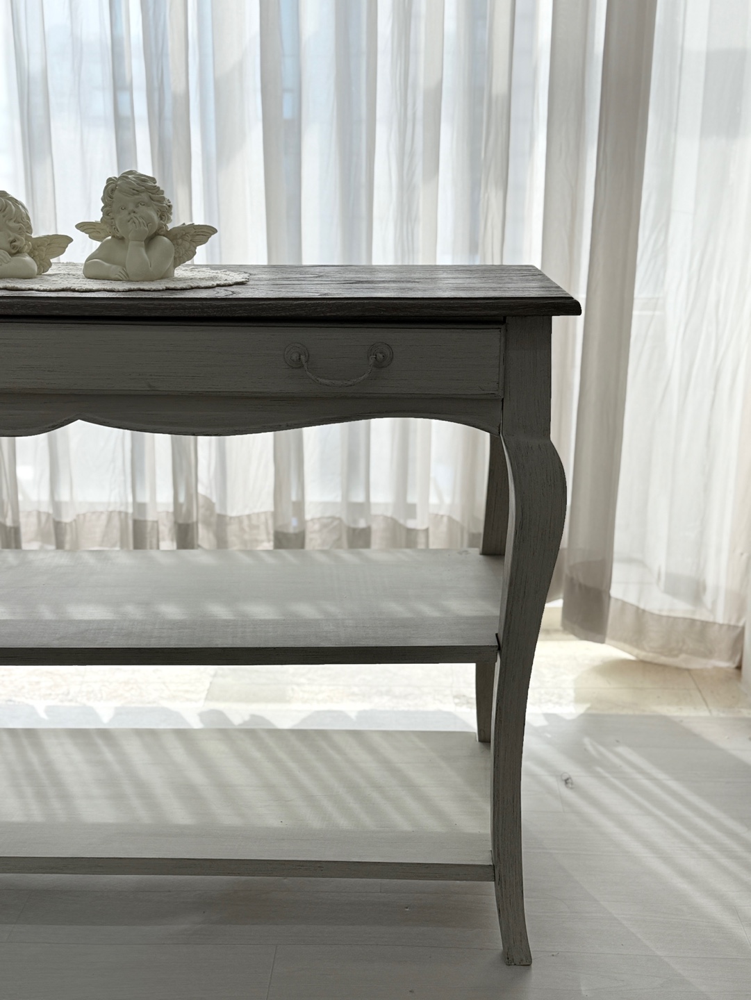빈티지한 우드 상판과 은은한 라이트 그레이 톤의 앤티크 워싱 마감