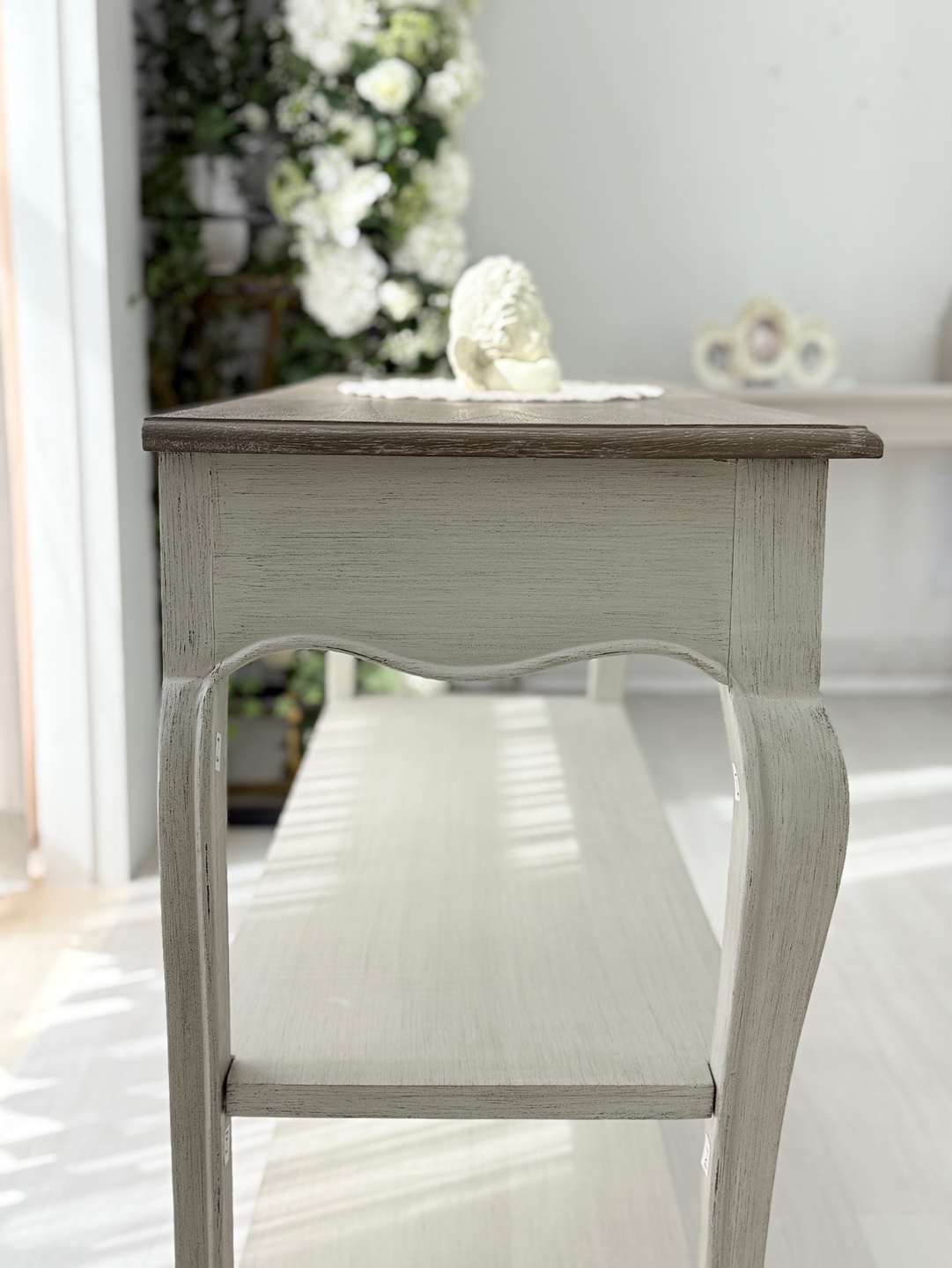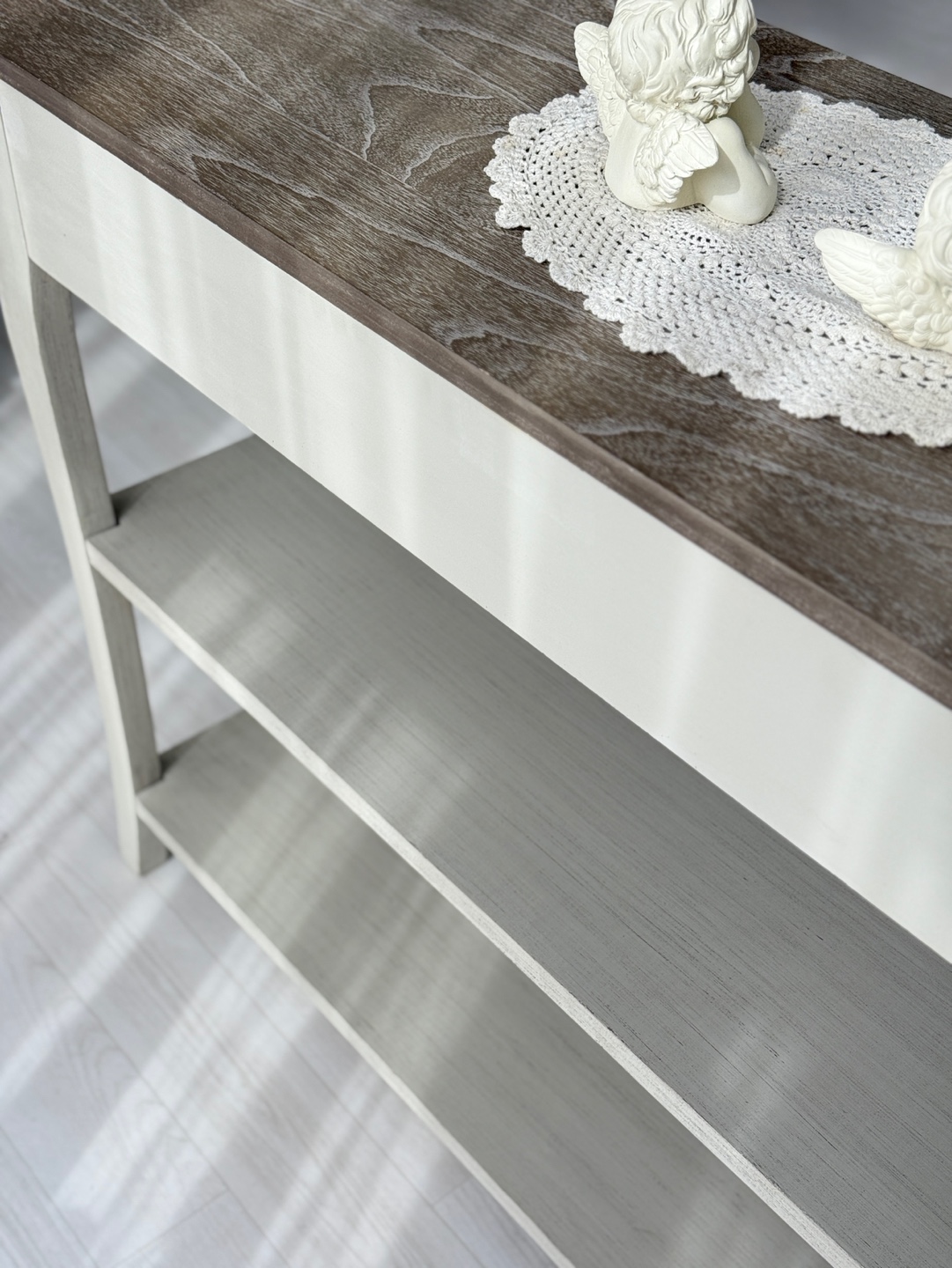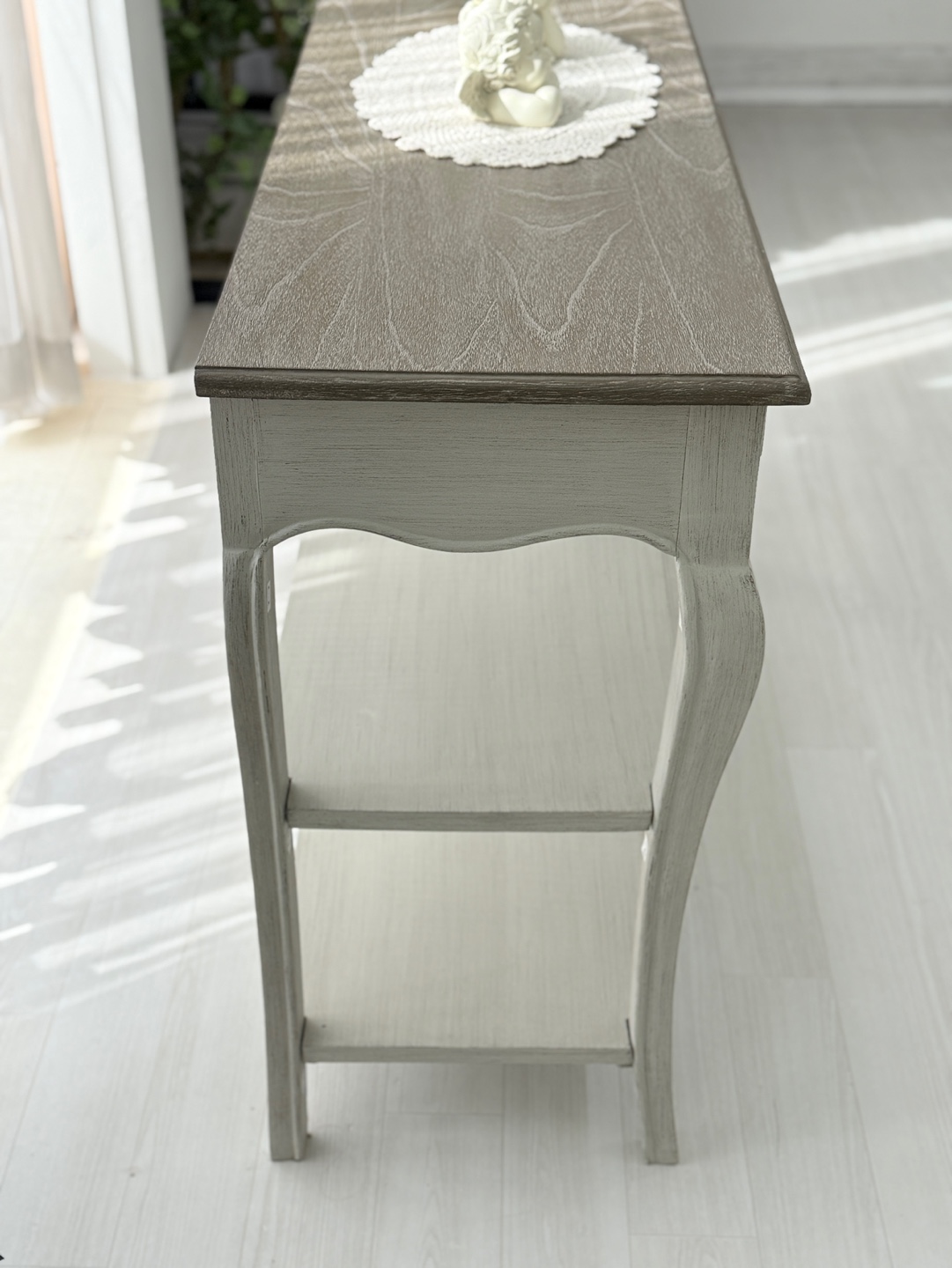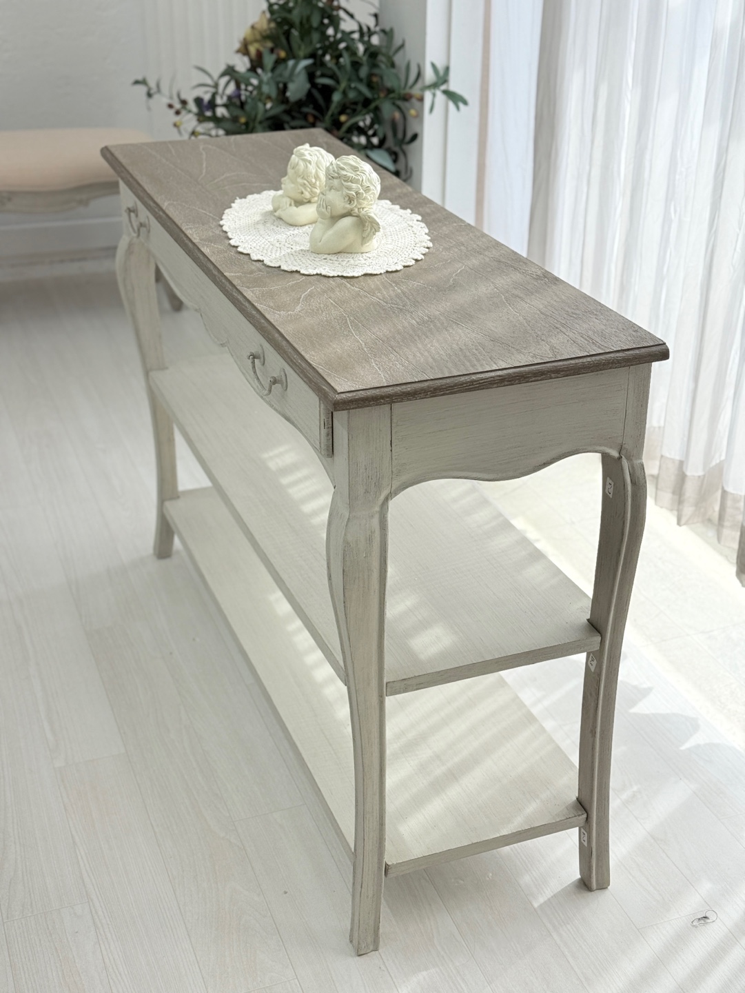 빈티지한 우드 상판과 은은한 라이트 그레이 톤의 앤티크 워싱 마감