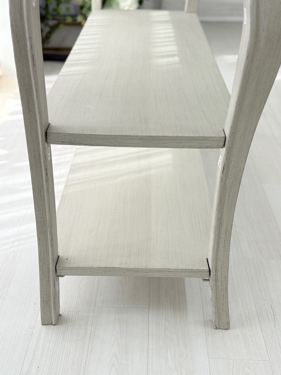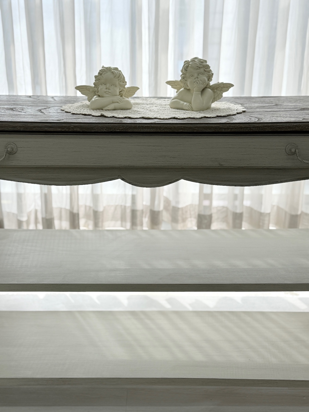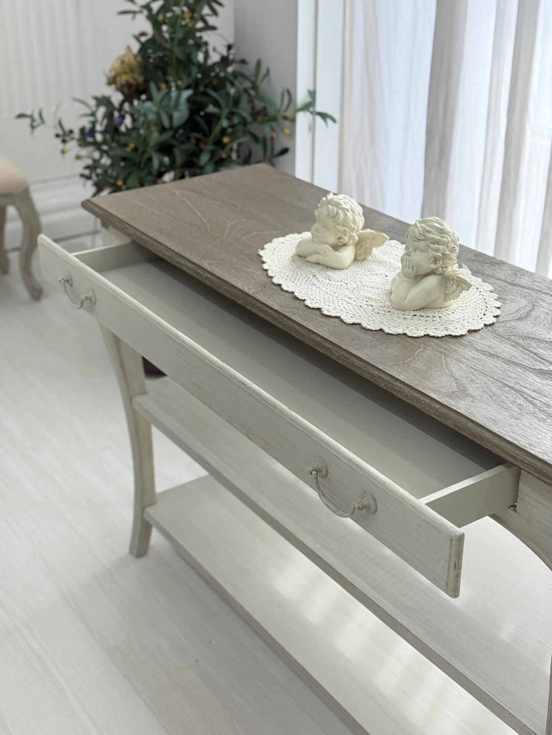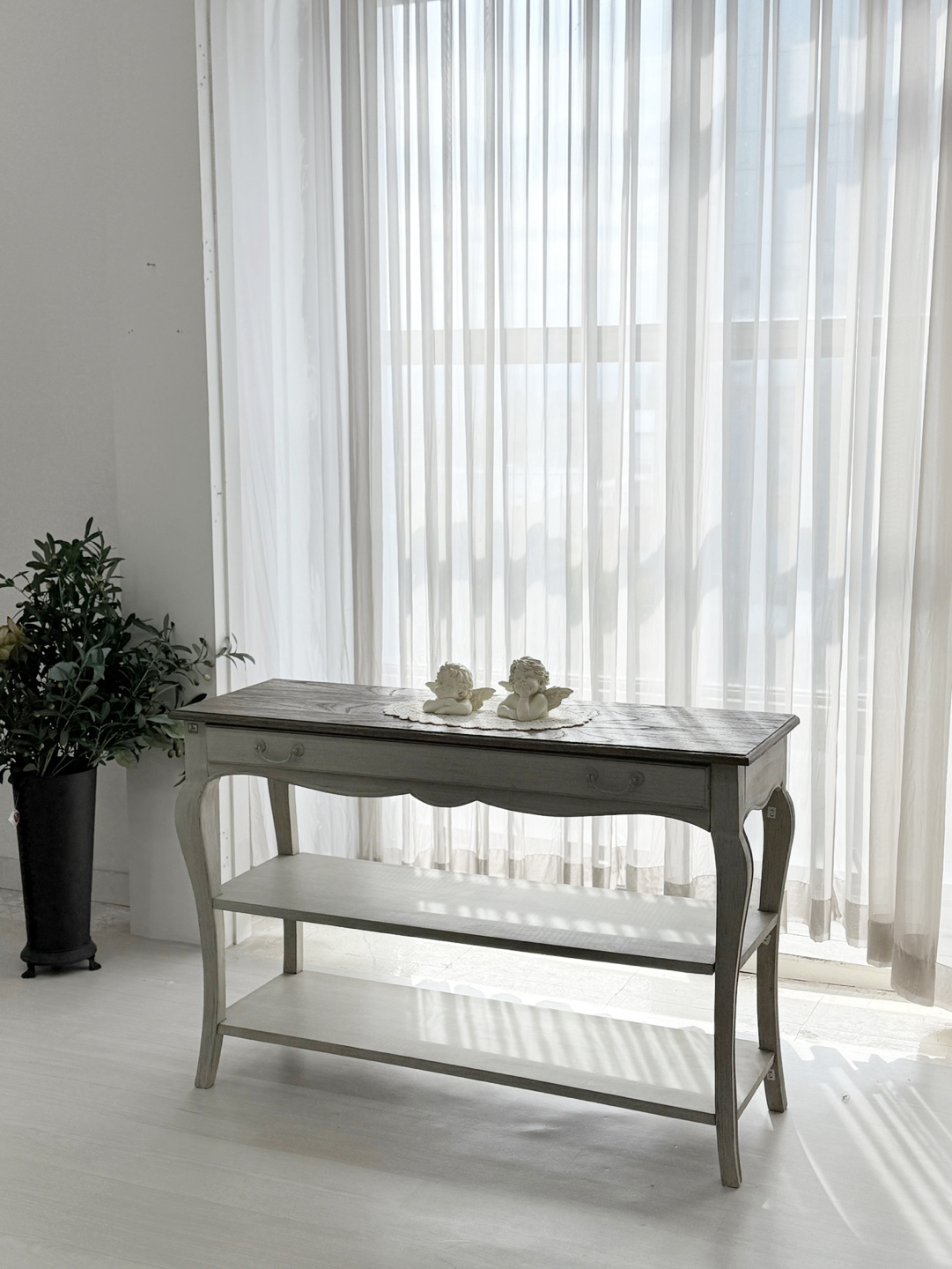 빈티지한 우드 상판과 은은한 라이트 그레이 톤의 앤티크 워싱 마감