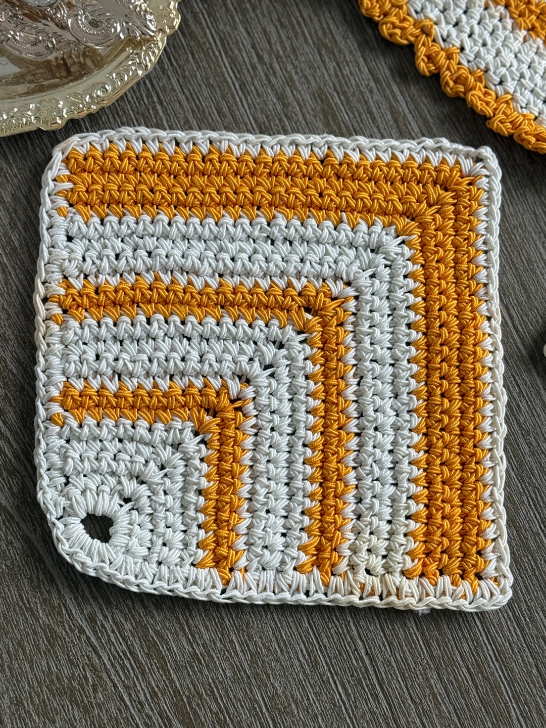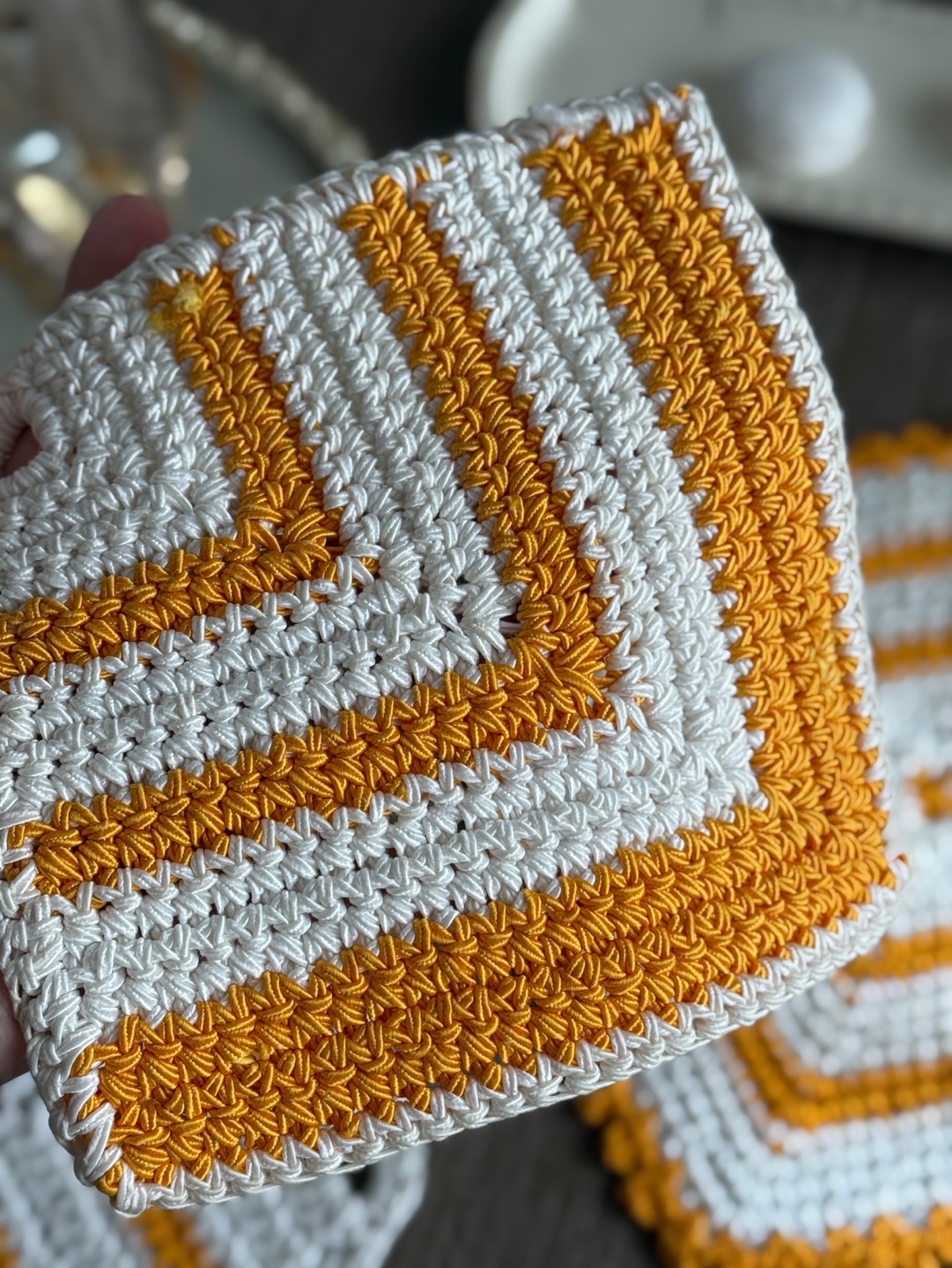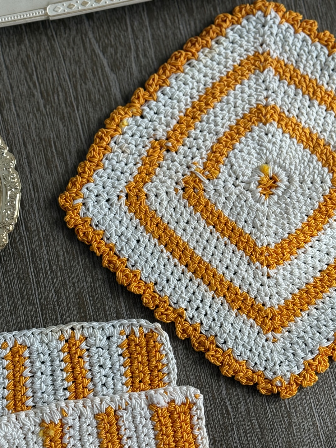정성껏 한 코 한 코 손으로 엮어 만든 핸드메이드 크로셰 매트입니다.