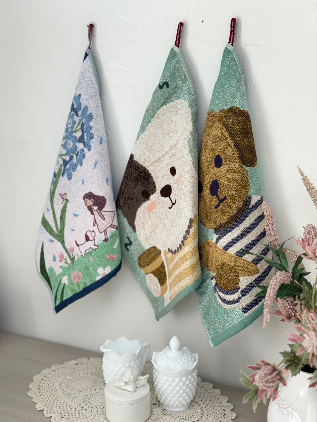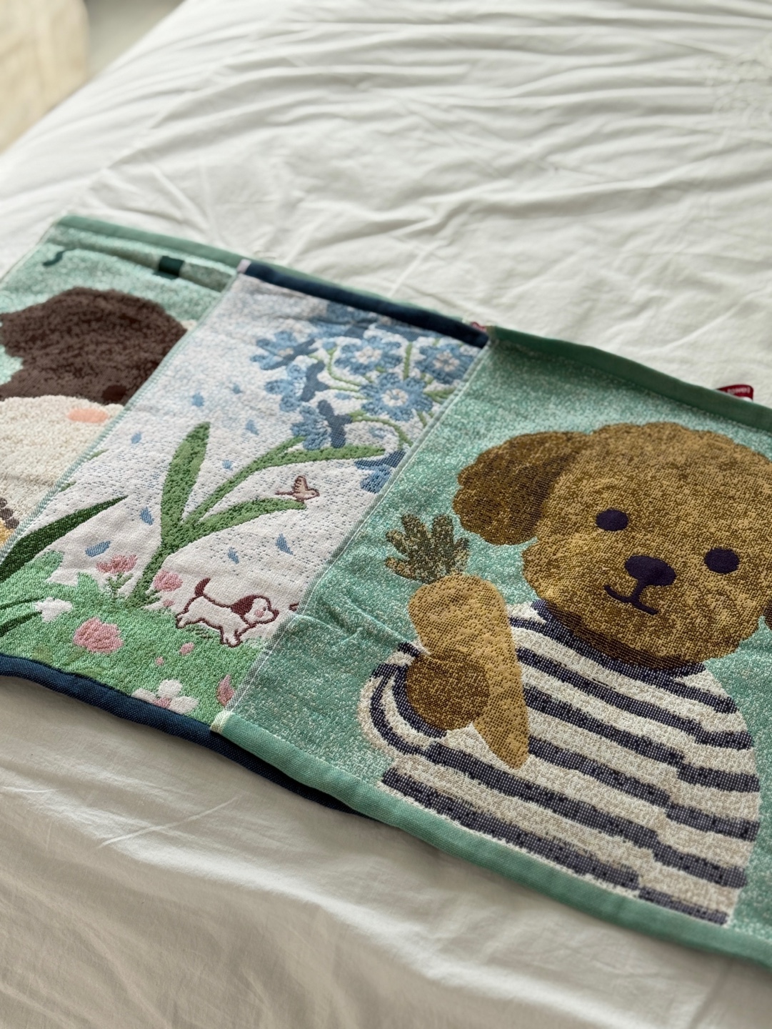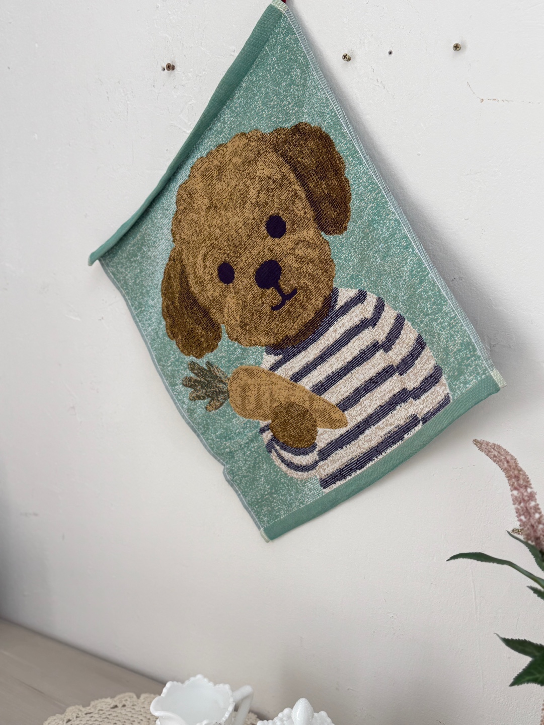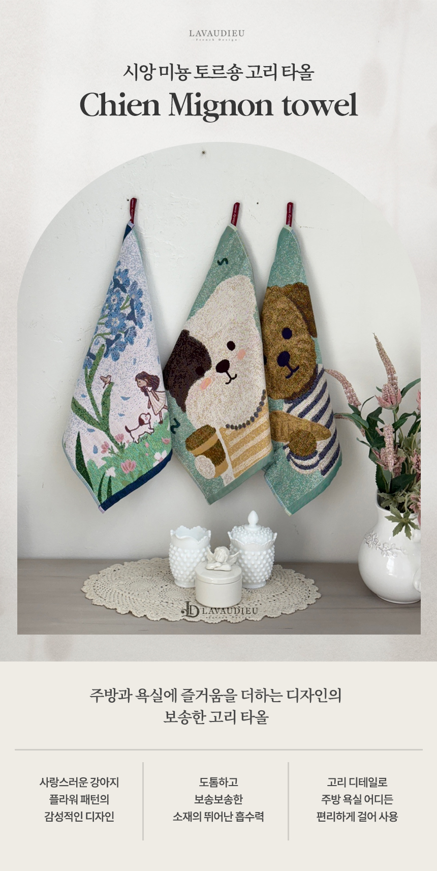 사랑스러운 강아지와 플라워 모티브의 패턴이 짜여진 타월로,