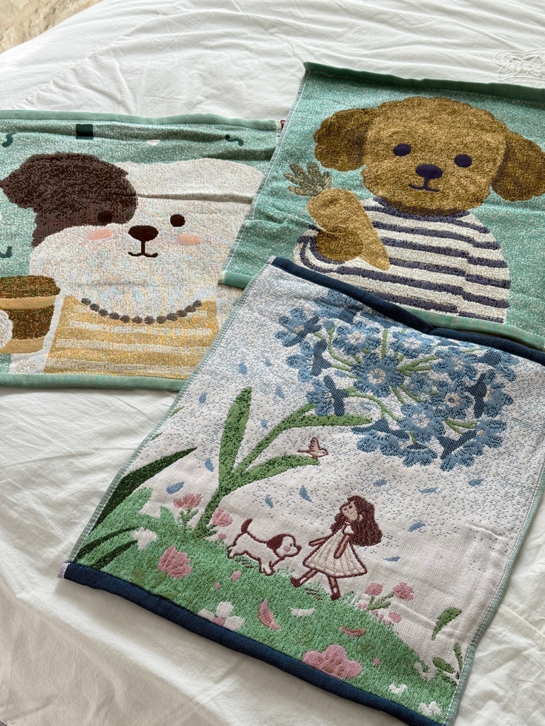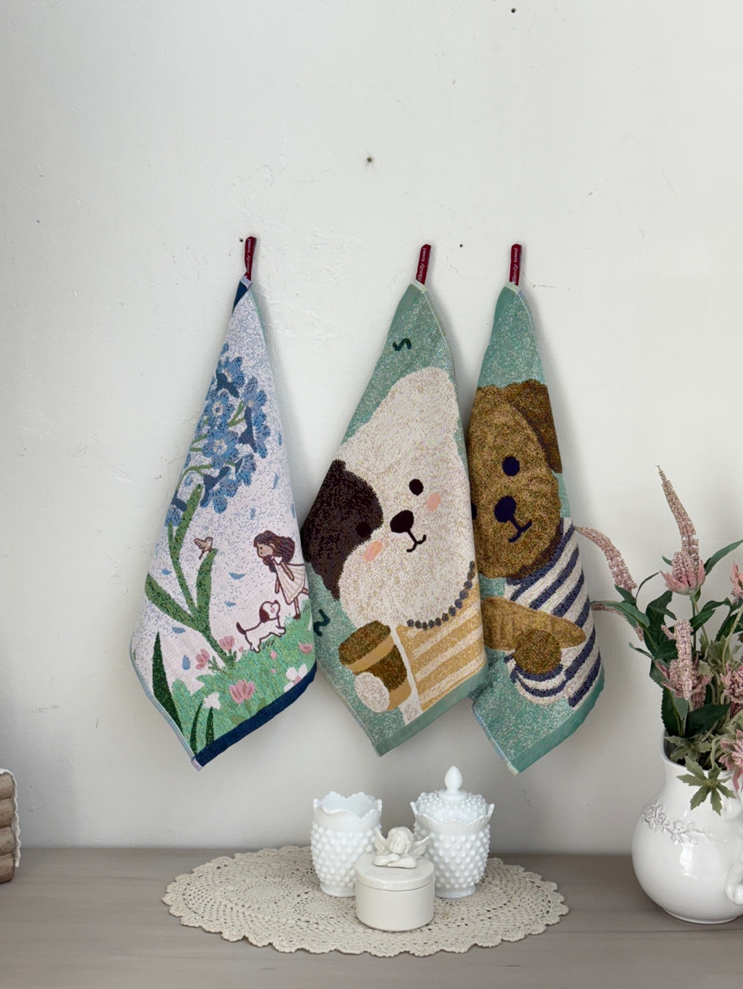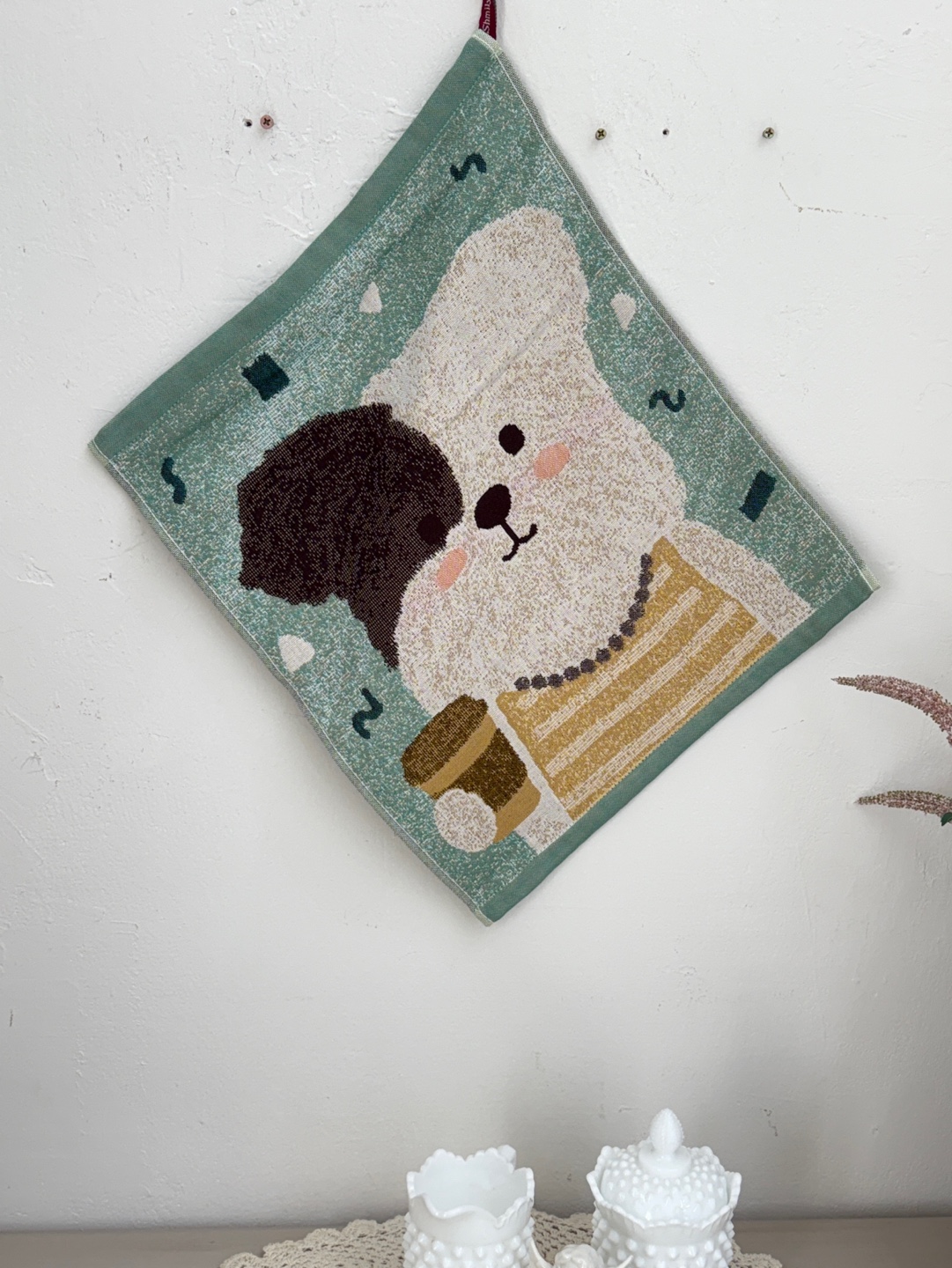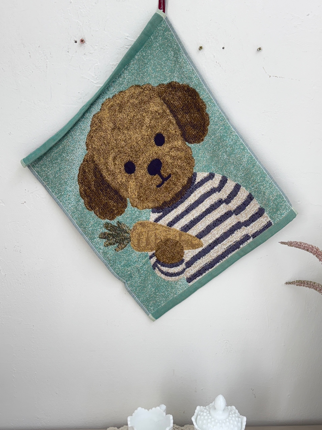 사랑스러운 강아지와 플라워 모티브의 패턴이 짜여진 타월로,