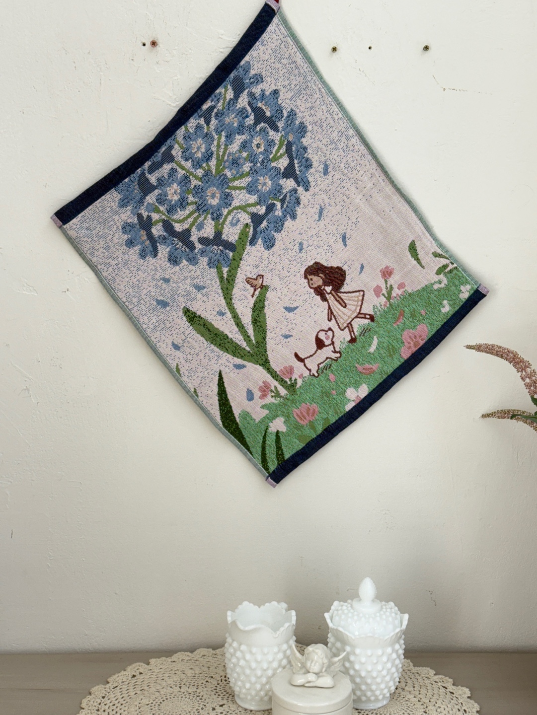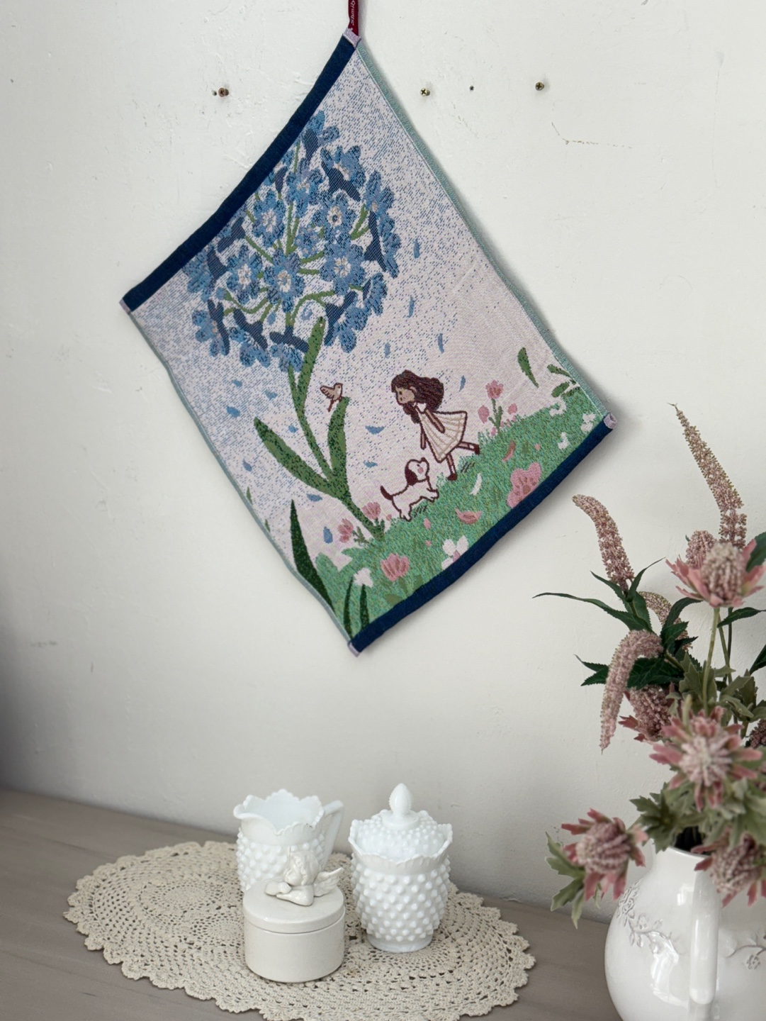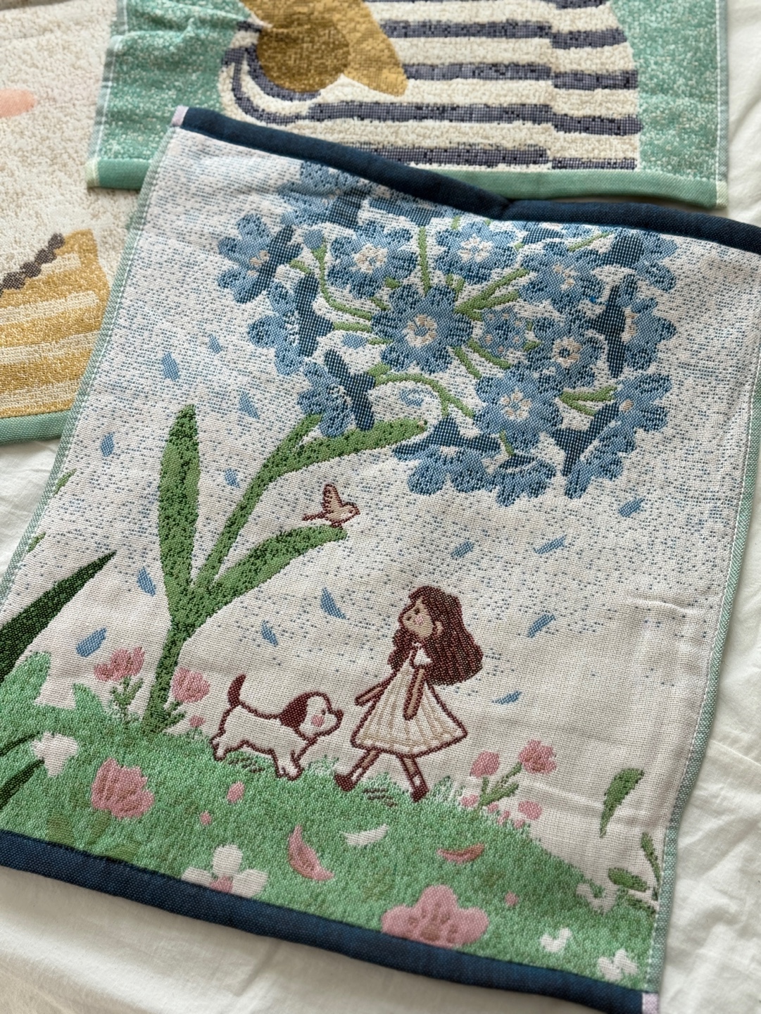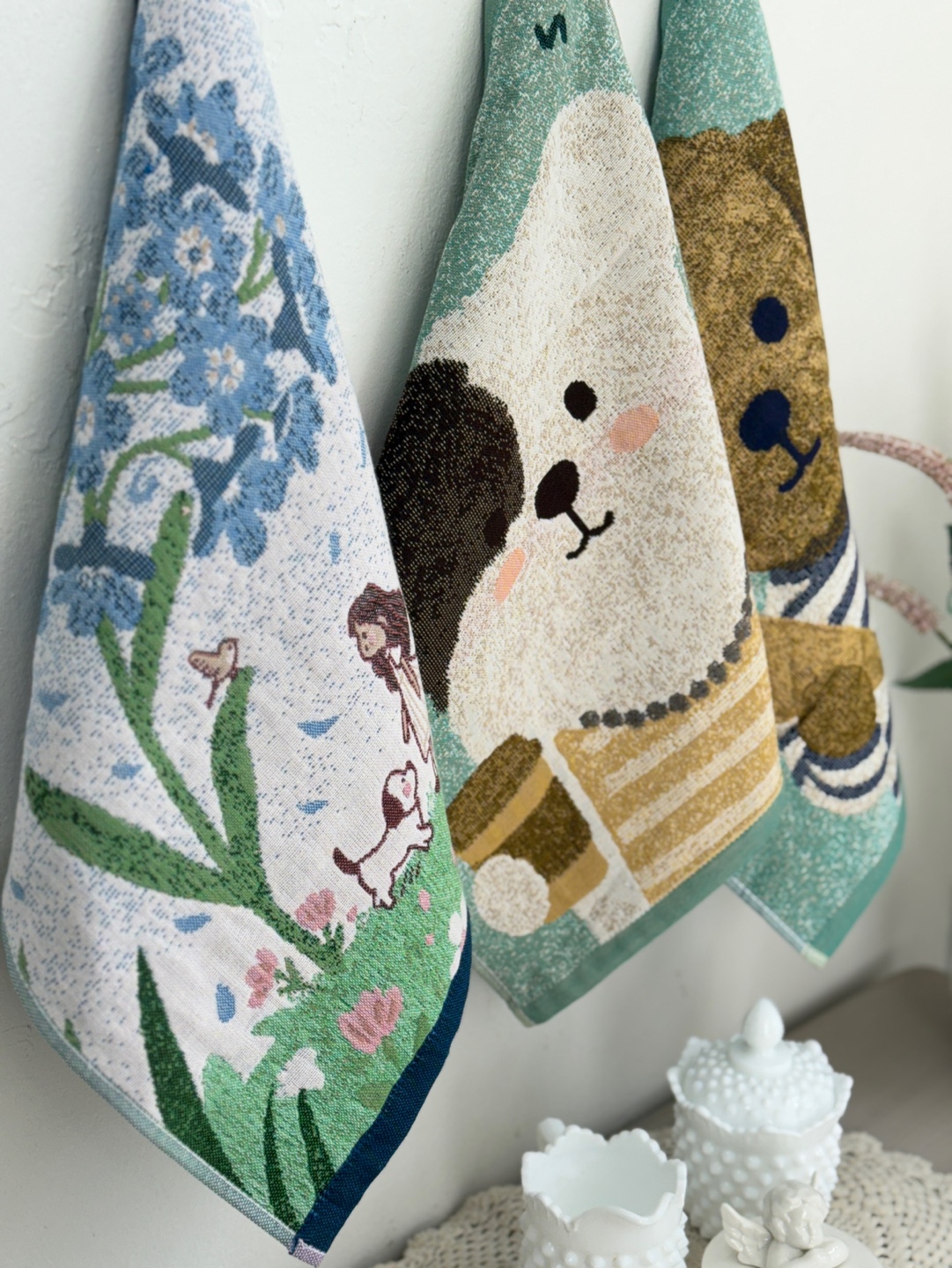사랑스러운 강아지와 플라워 모티브의 패턴이 짜여진 타월로,