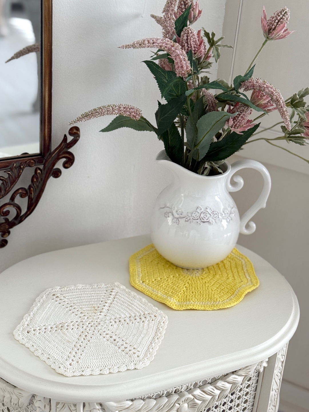 촘촘하고 섬세한 육각 레이스 짜임이 테이블 위에 우아한 분위기를 더해줍니다.