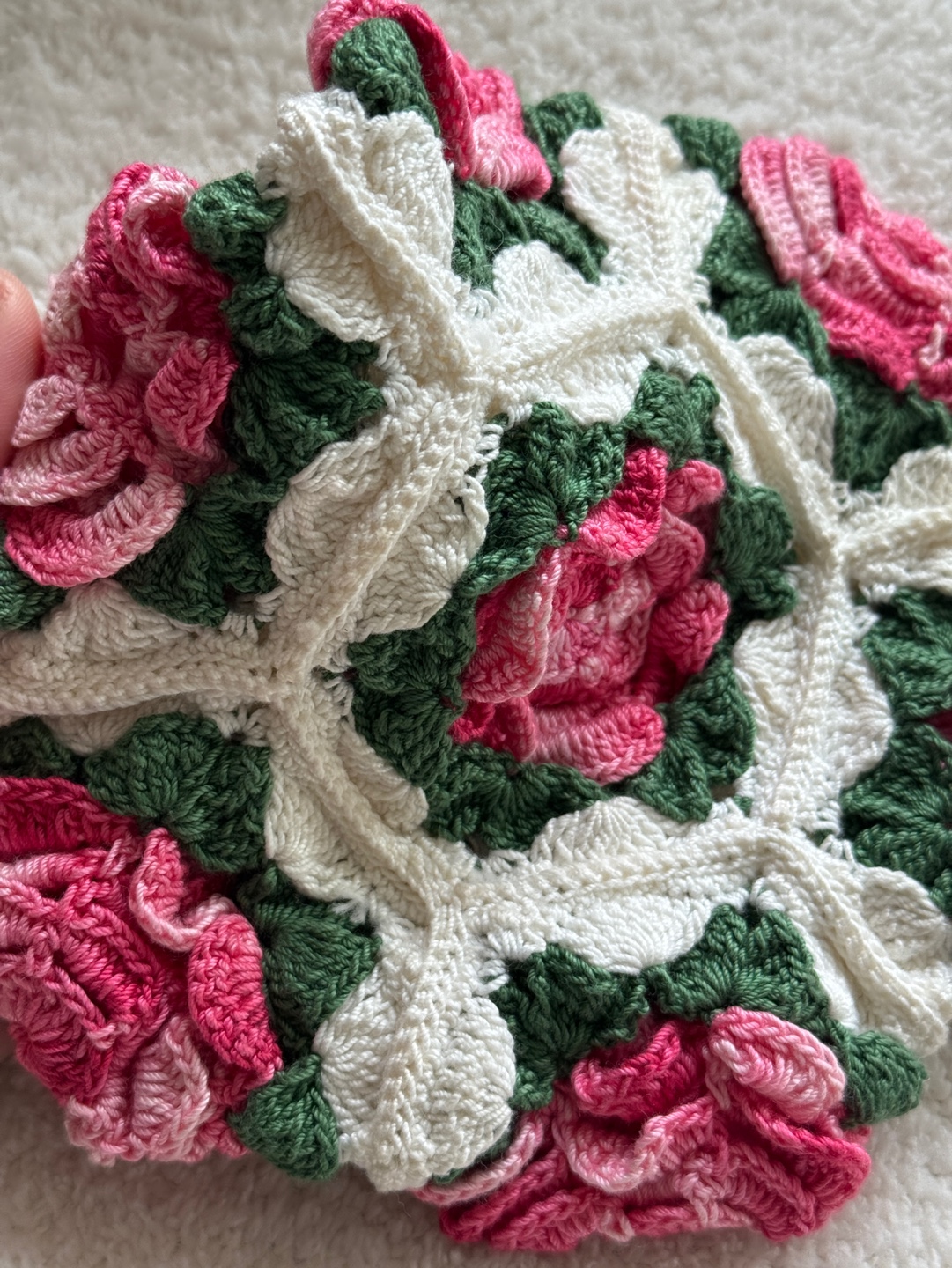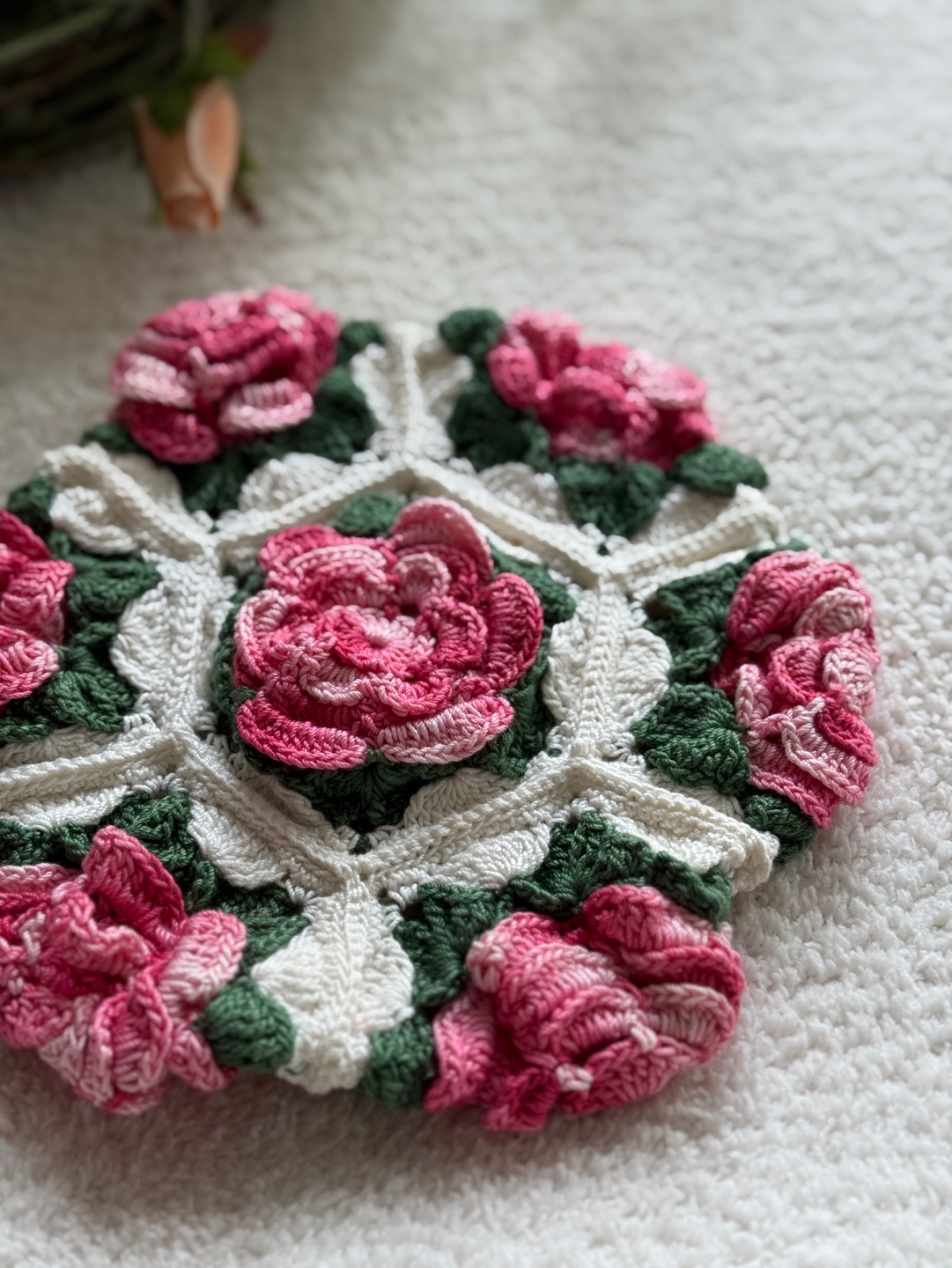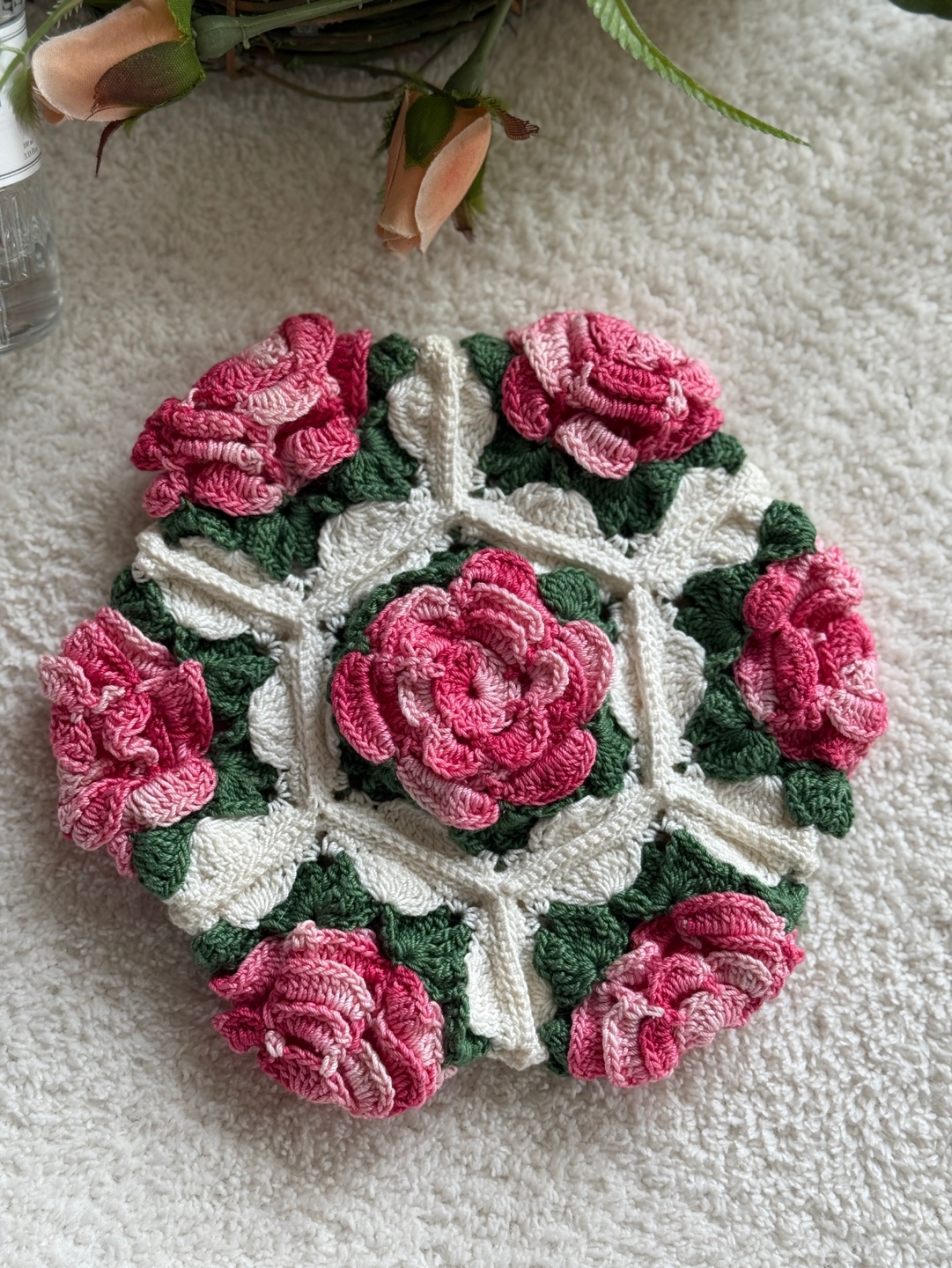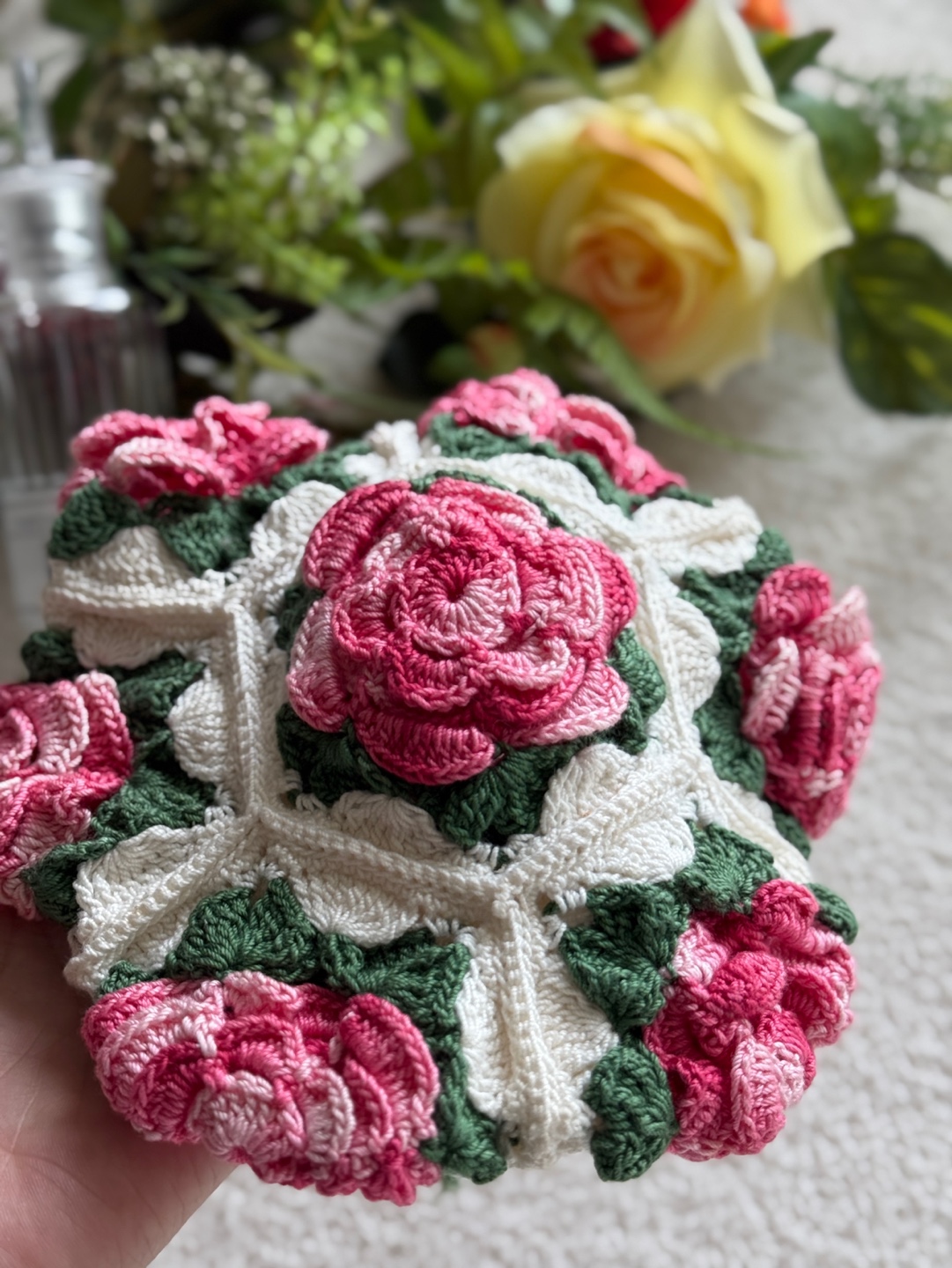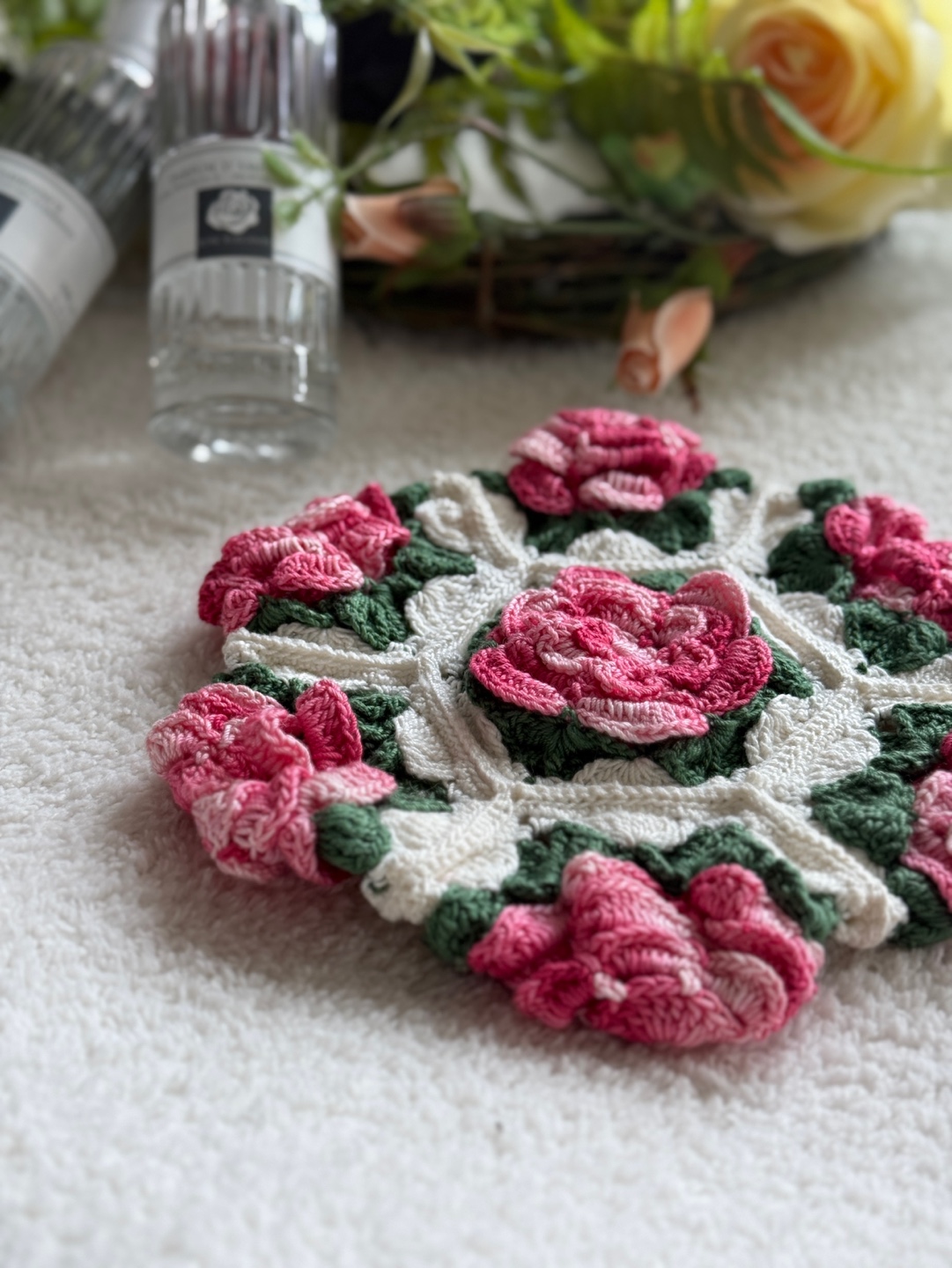 입체적인 장미 꽃다발 모양의 핸드메이드 뜨개 코스터