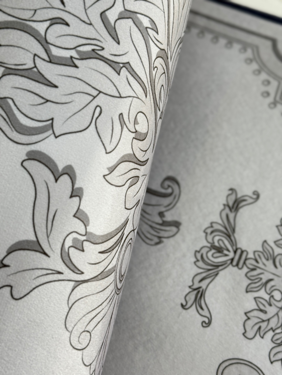 디자인&프린팅 중앙에 배치된 볼드하고 화려한 다마스크 문양, 깔끔한 프레임 라인으로 정돈된 디자인