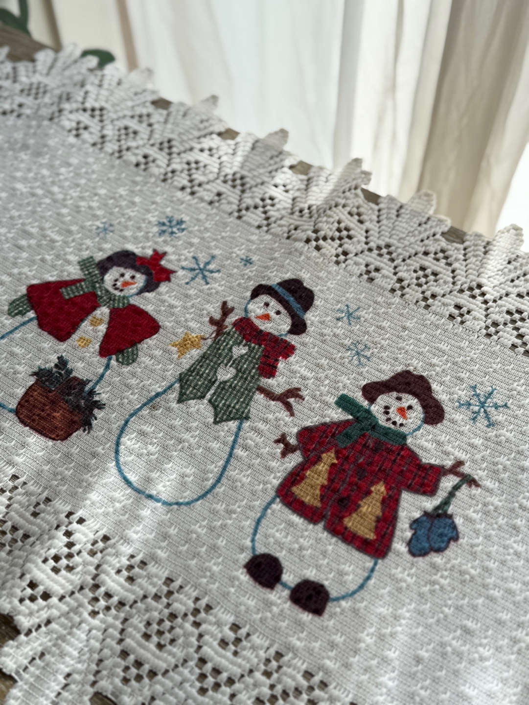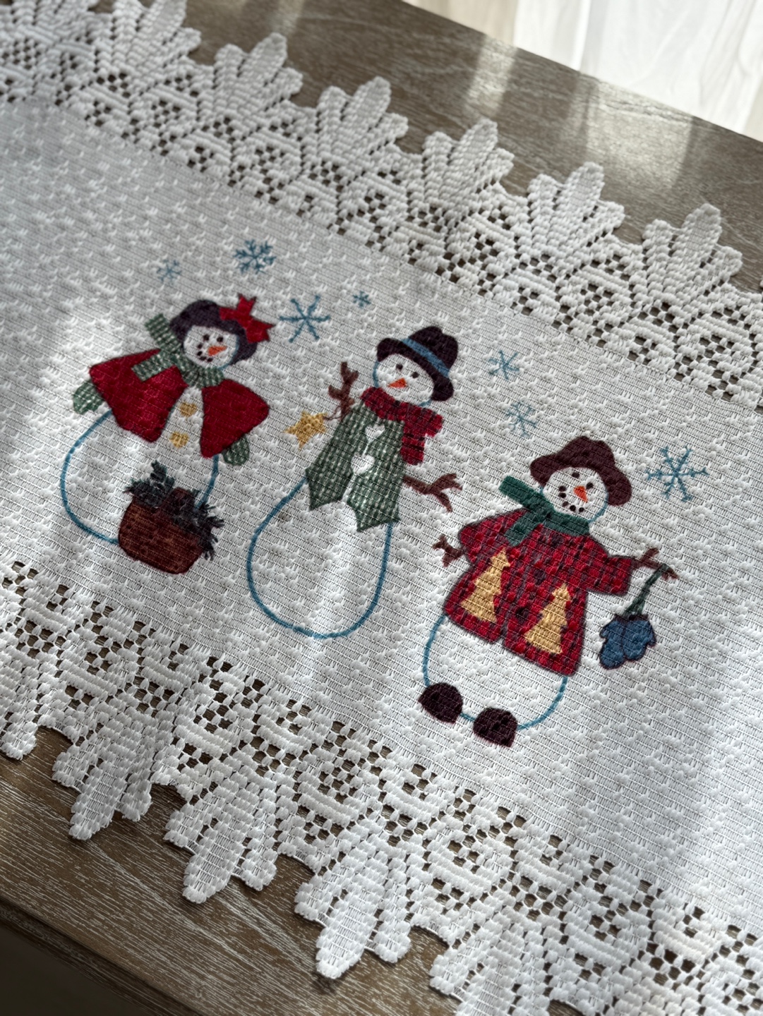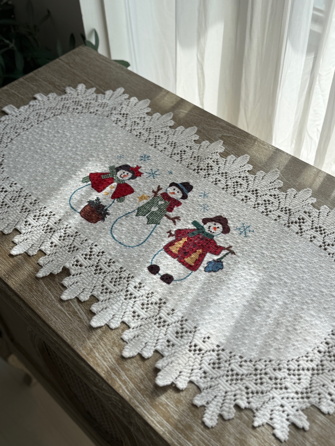 눈사람 자수와 레이스 테두리의 겨울 시즌 테이블 매트
