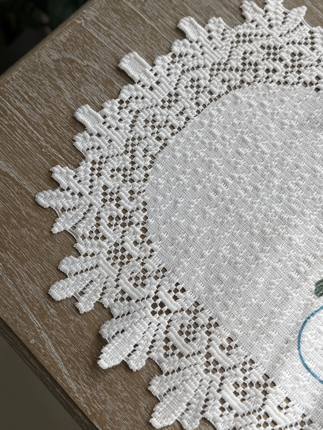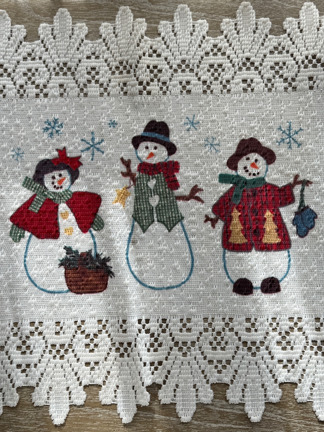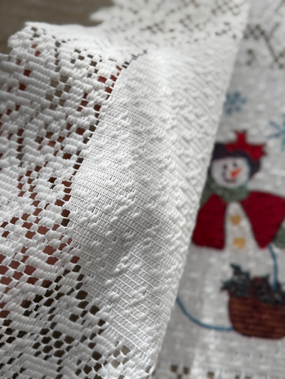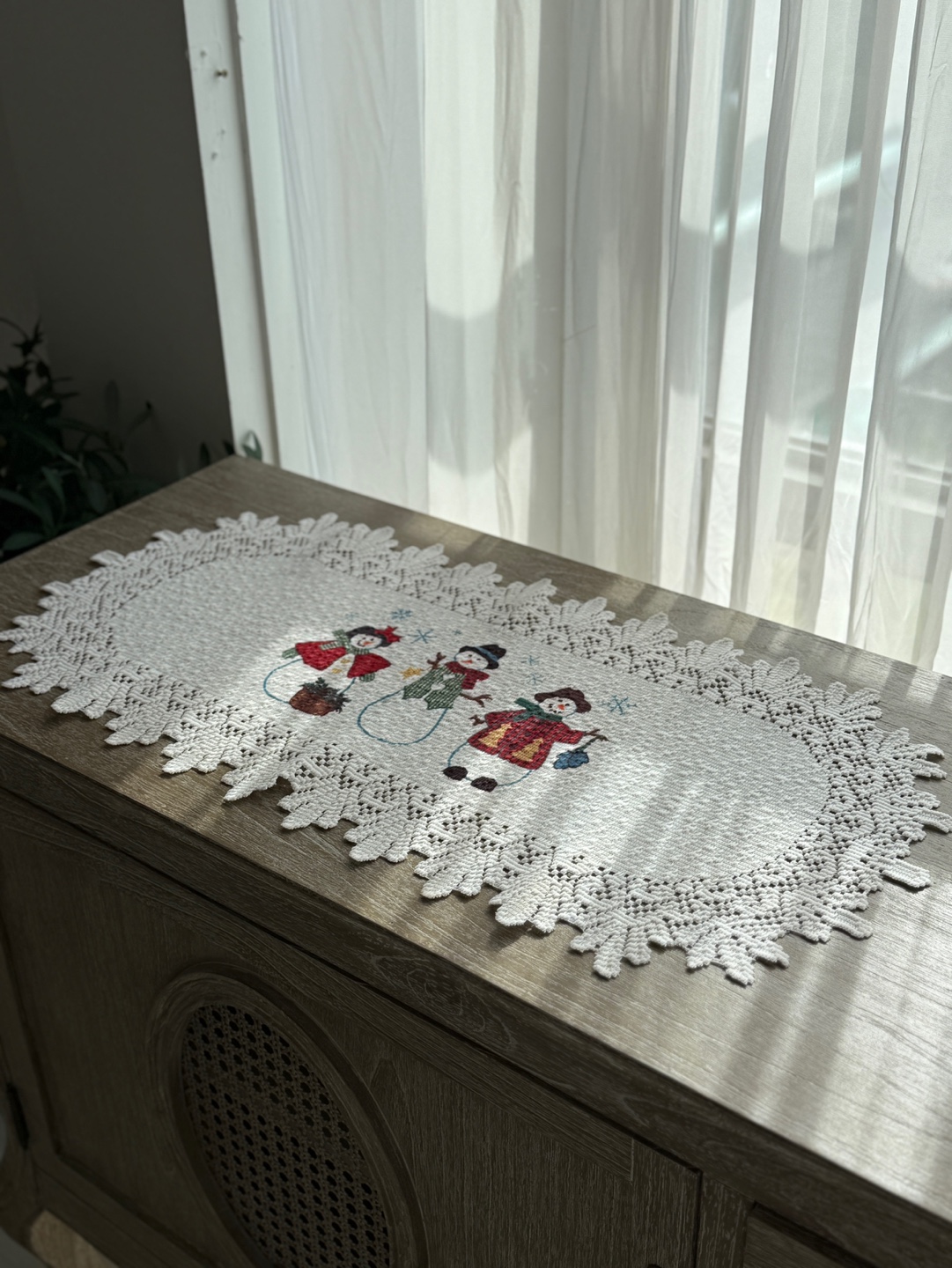 눈사람 자수와 레이스 테두리의 겨울 시즌 테이블 매트