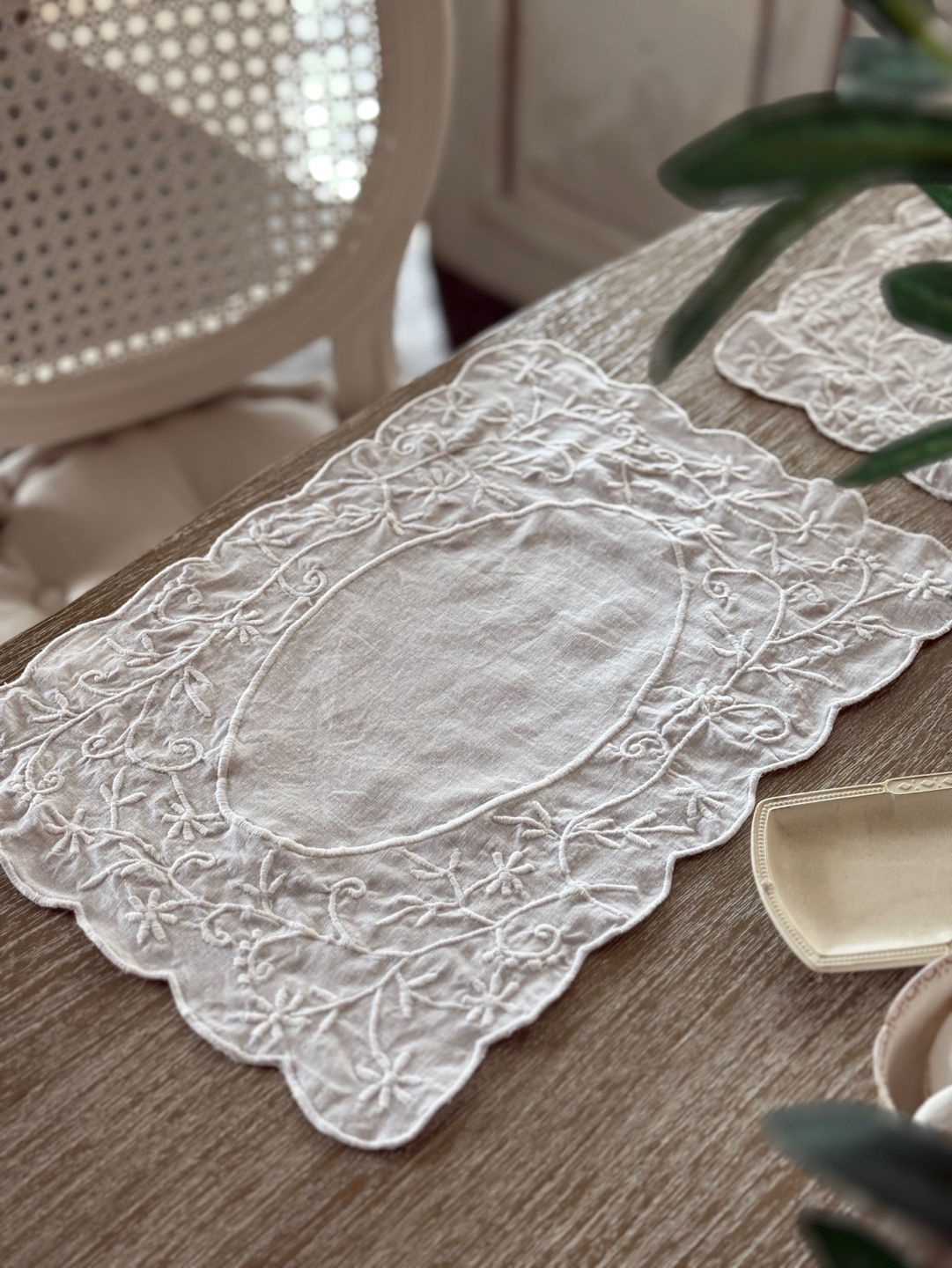 매트 전체를 두른 물결 모양의 섬세한 컷워크 레이스 마감
