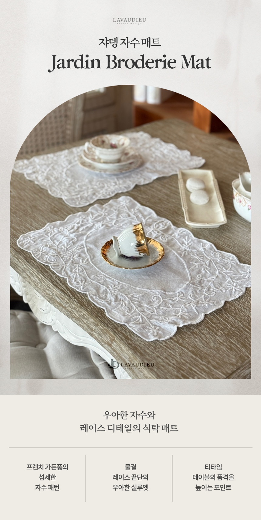 중앙을 채운 풍성한 자수 디테일, 프랑스 정원의 고풍스럽고 로맨틱한 무드