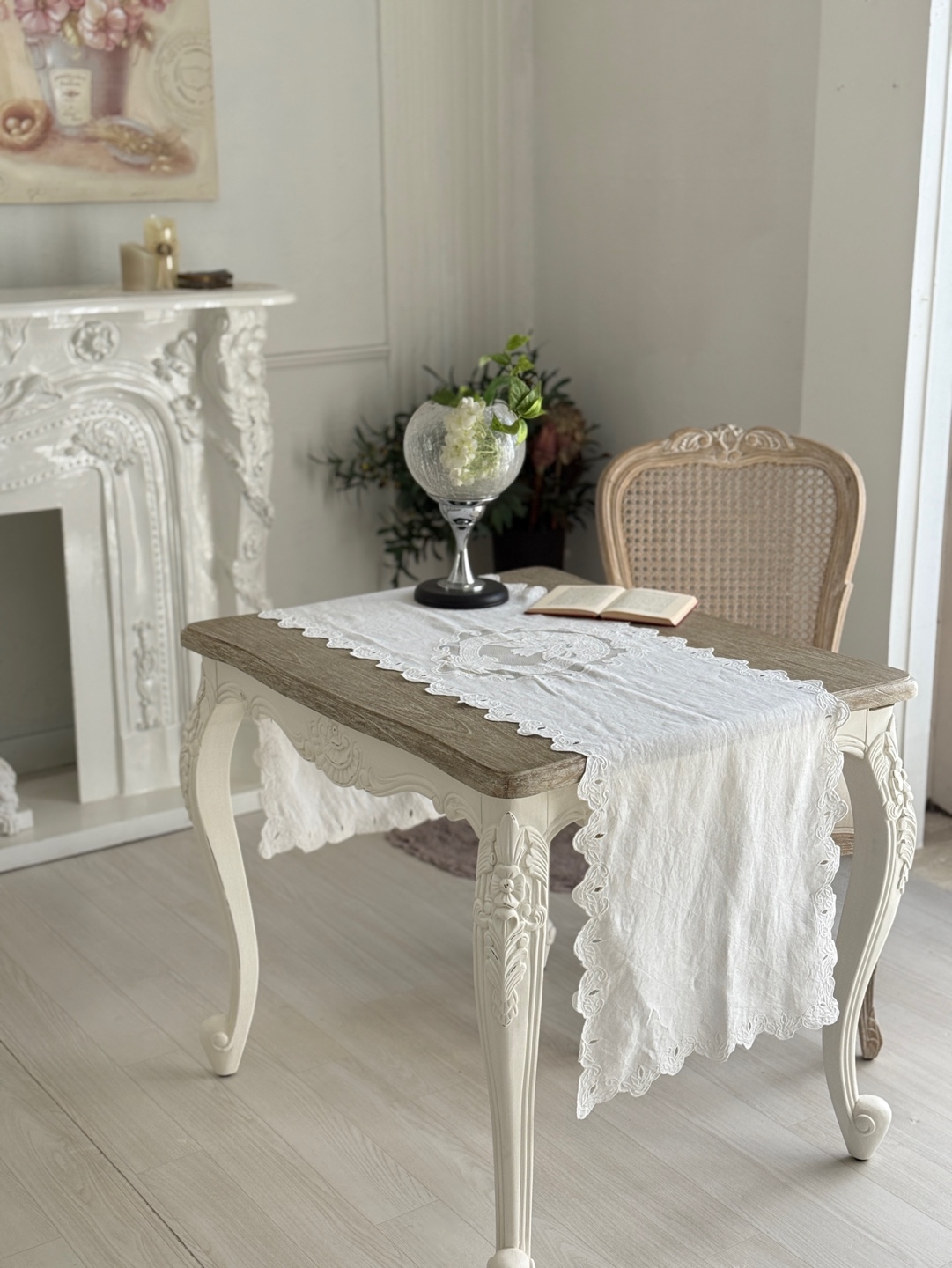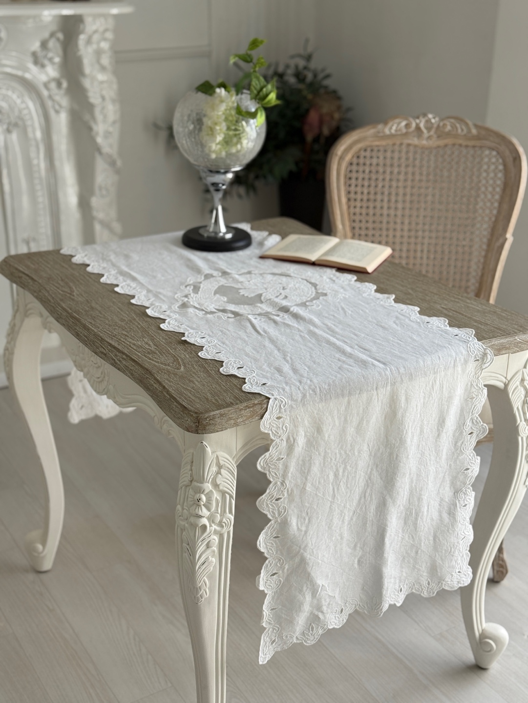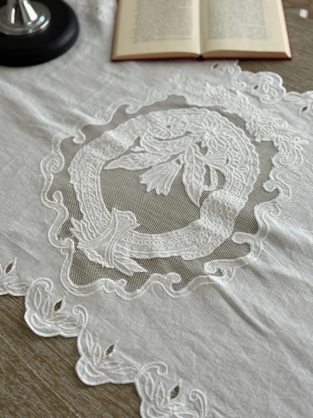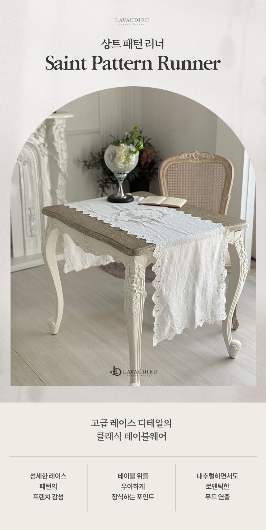 고풍스러운 유럽풍 레이스 패턴, 테이블 위에 차분하고 우아한 분위기 완성