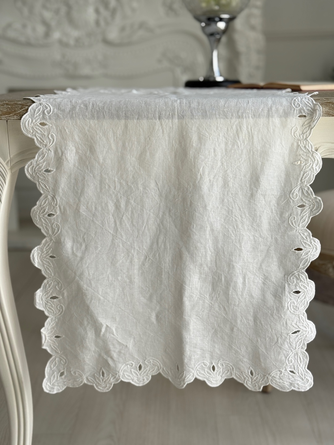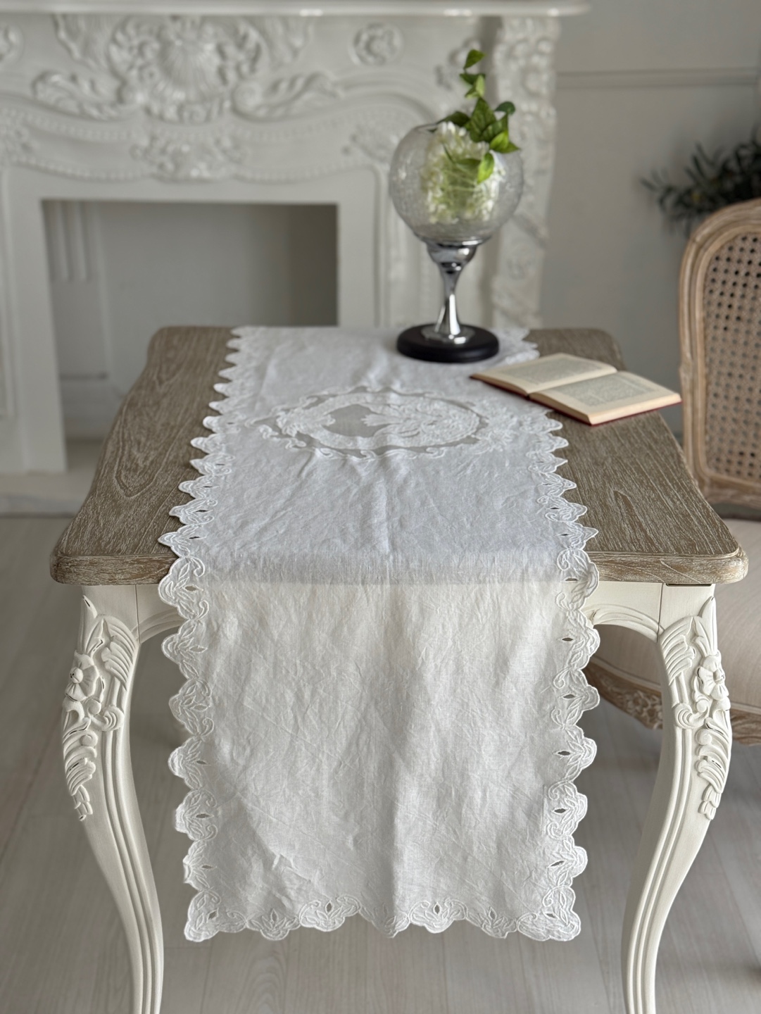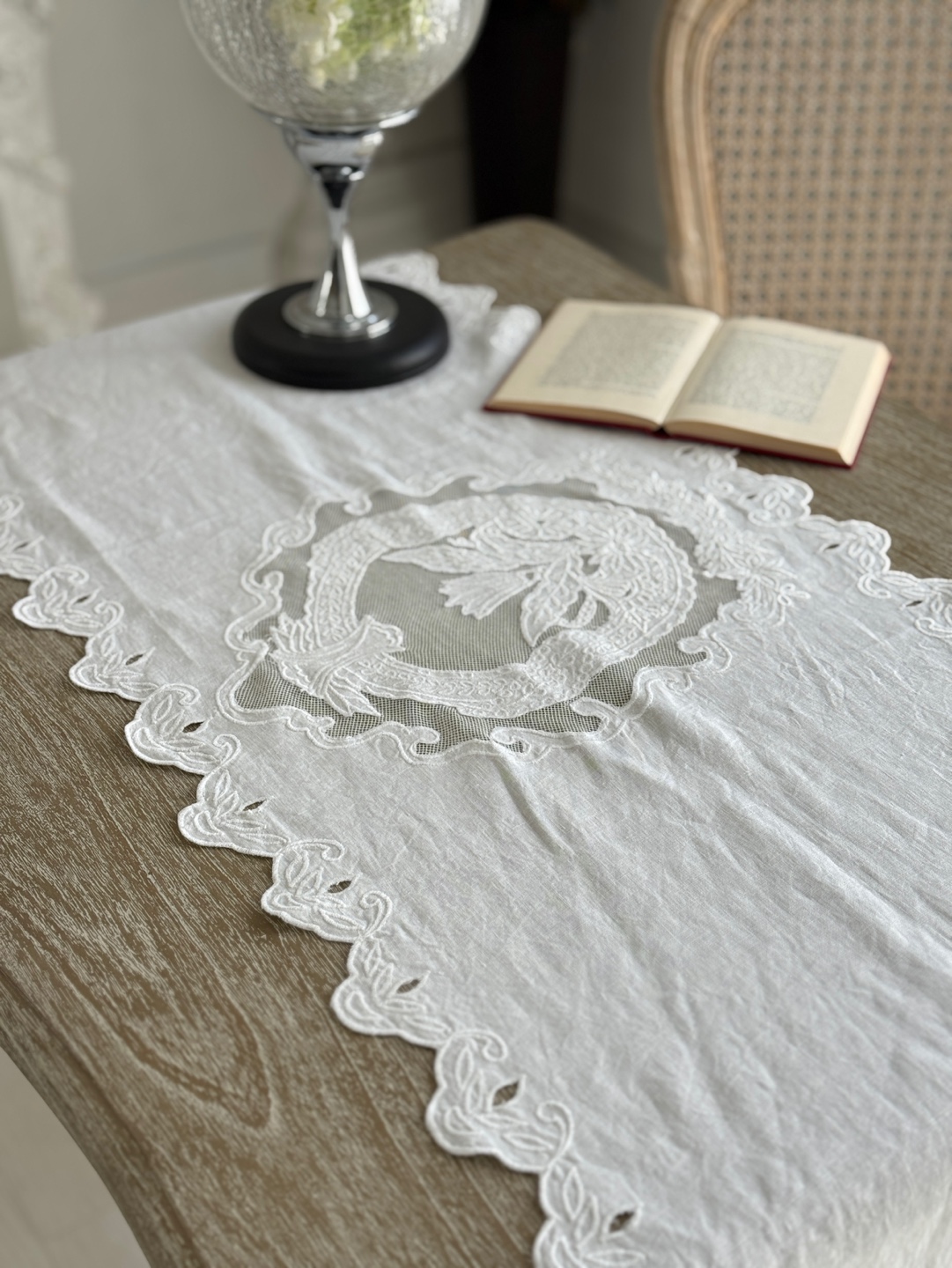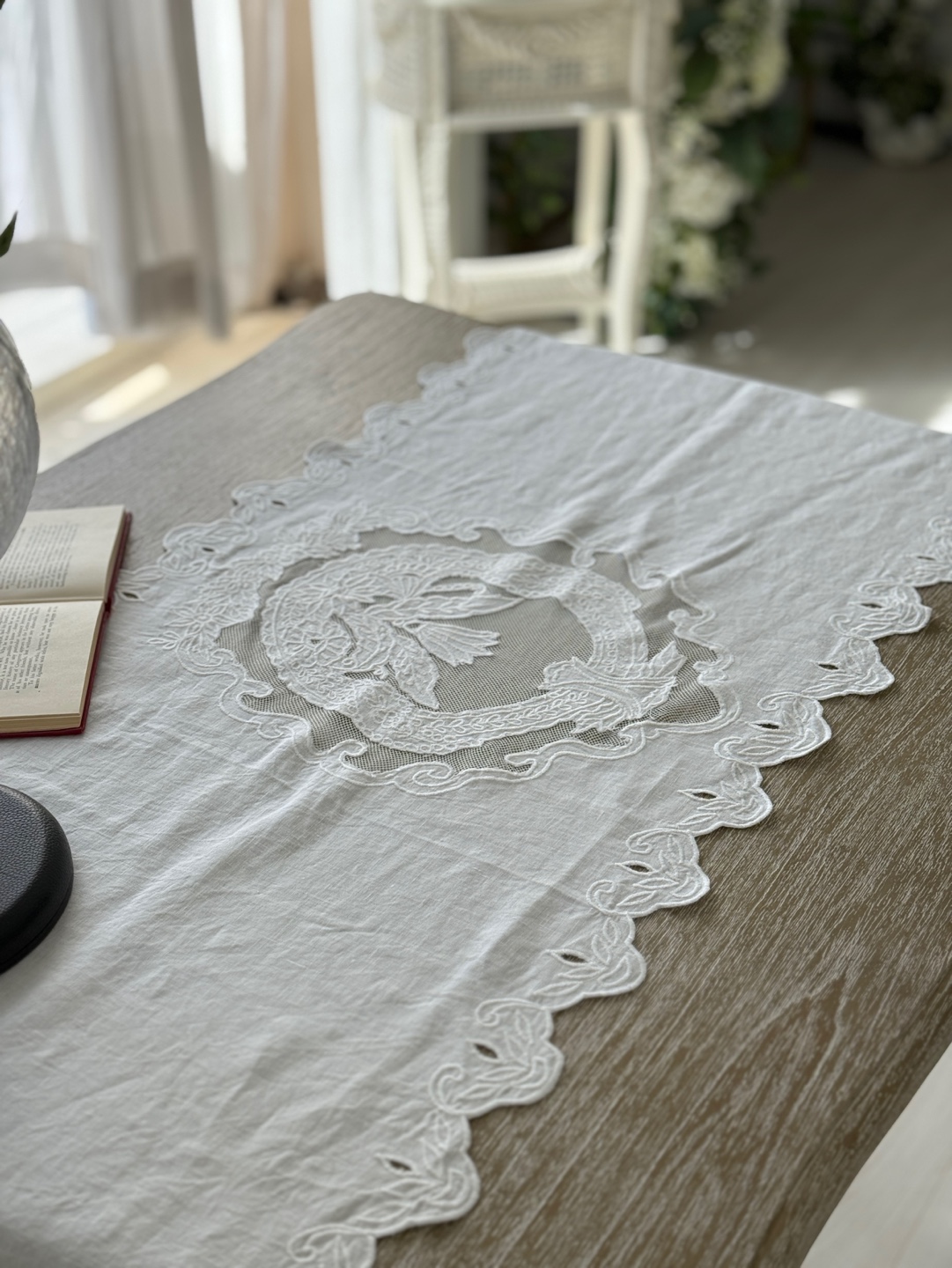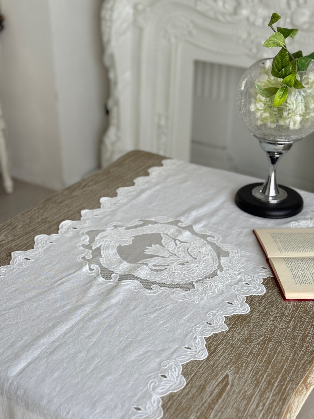 고풍스러운 유럽풍 레이스 패턴, 테이블 위에 차분하고 우아한 분위기 완성