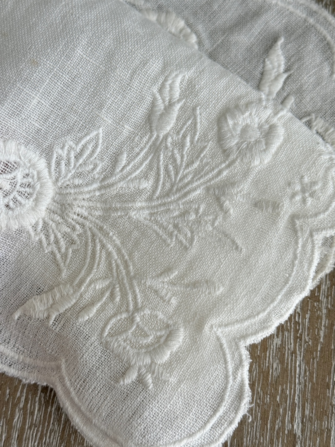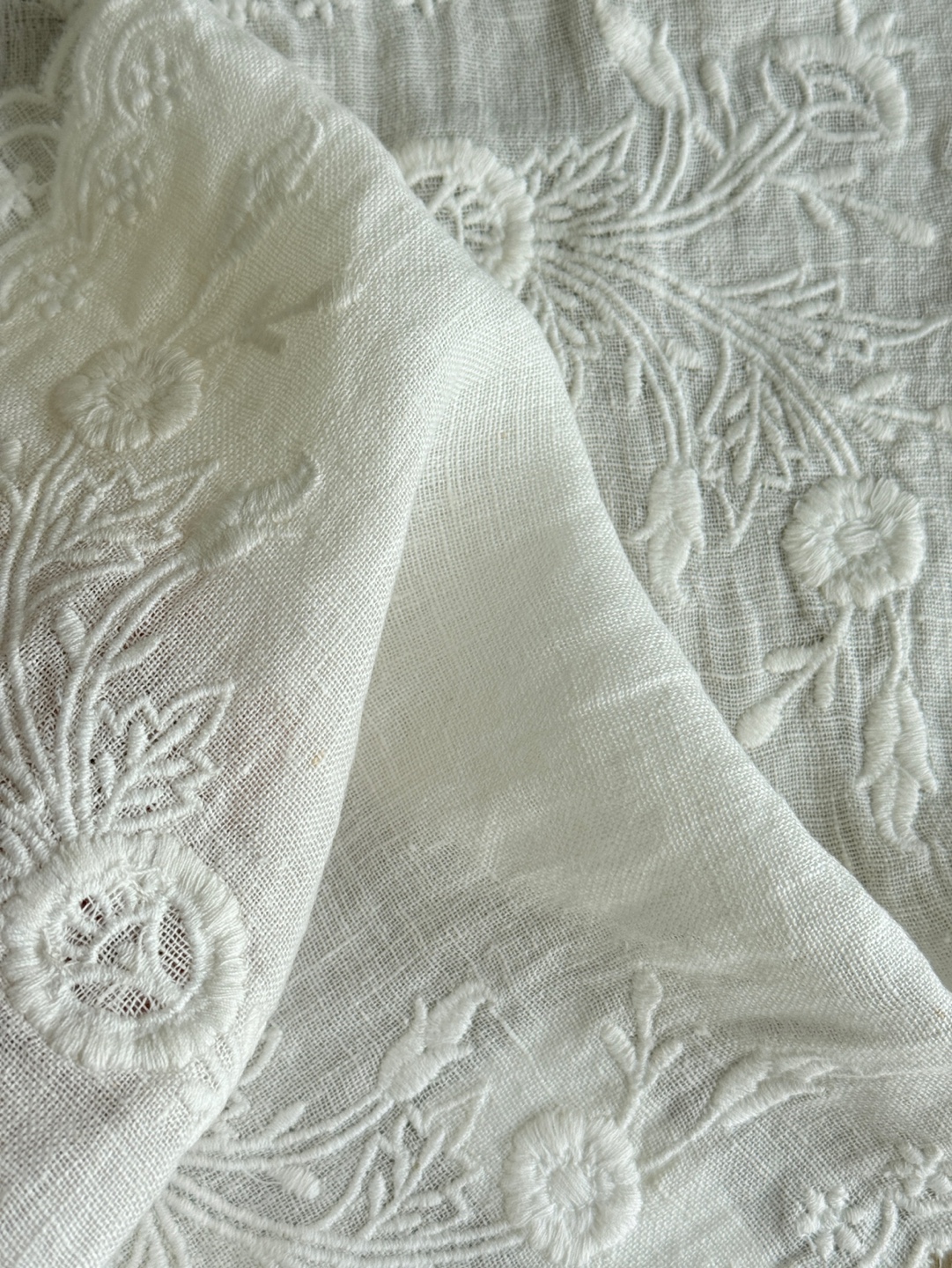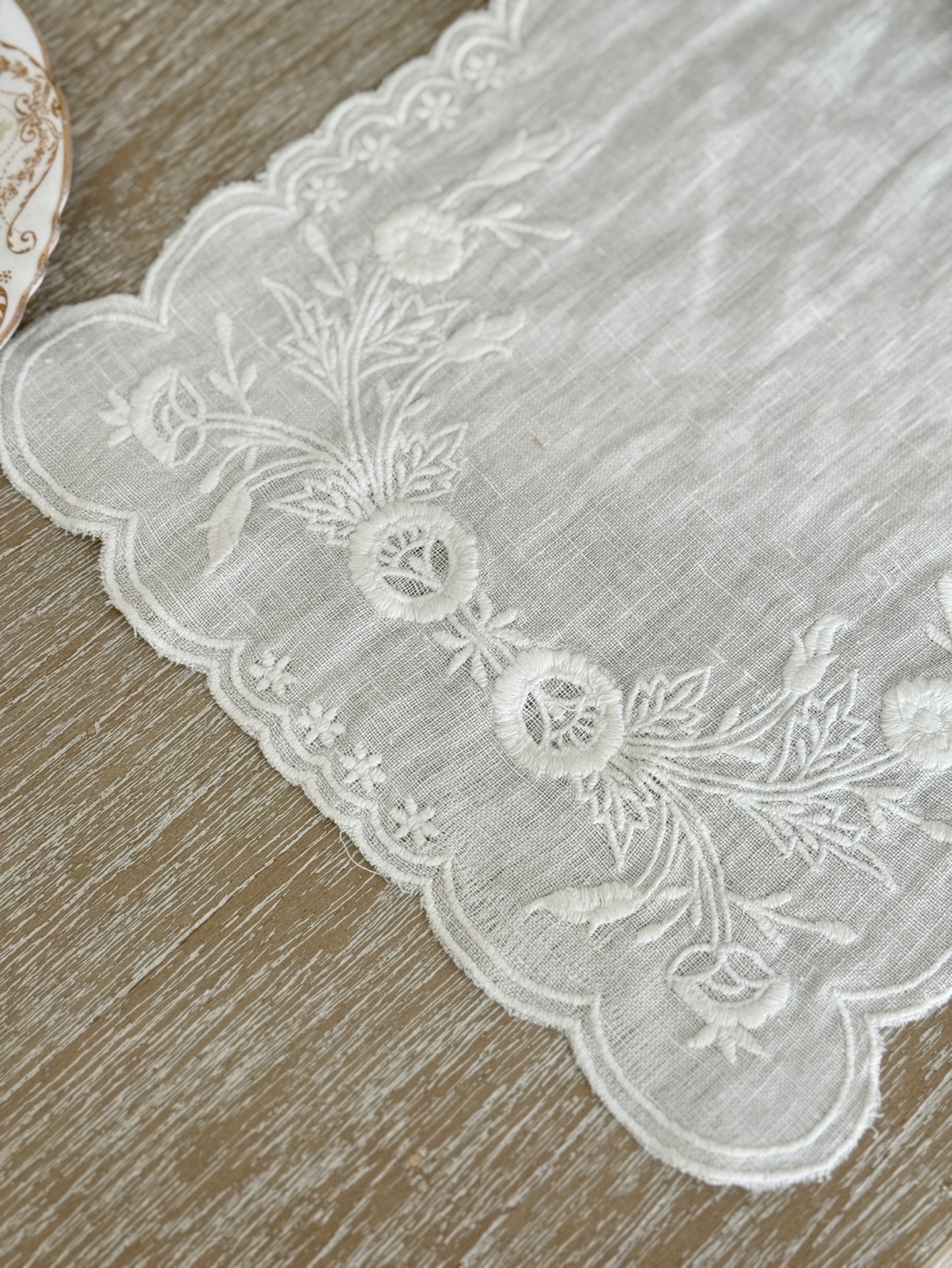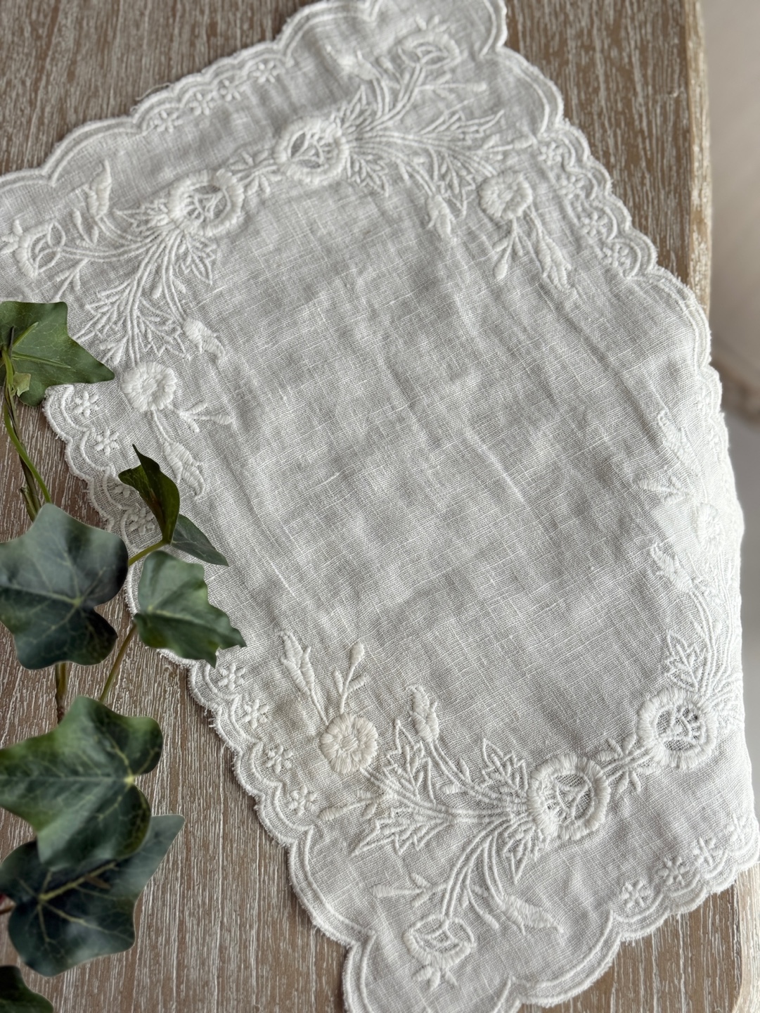 내추럴한 마(린넨) 100% 소재 위에 섬세한 리스 자수가 놓여