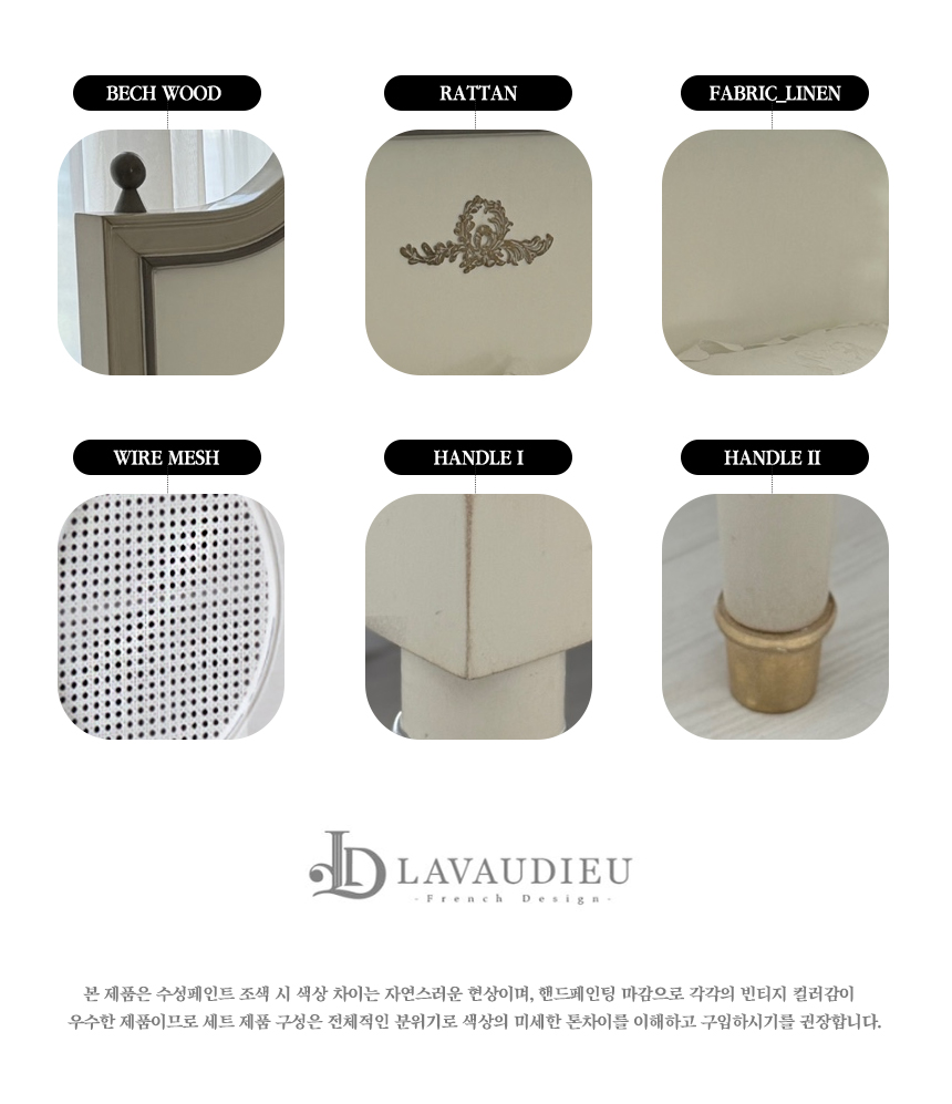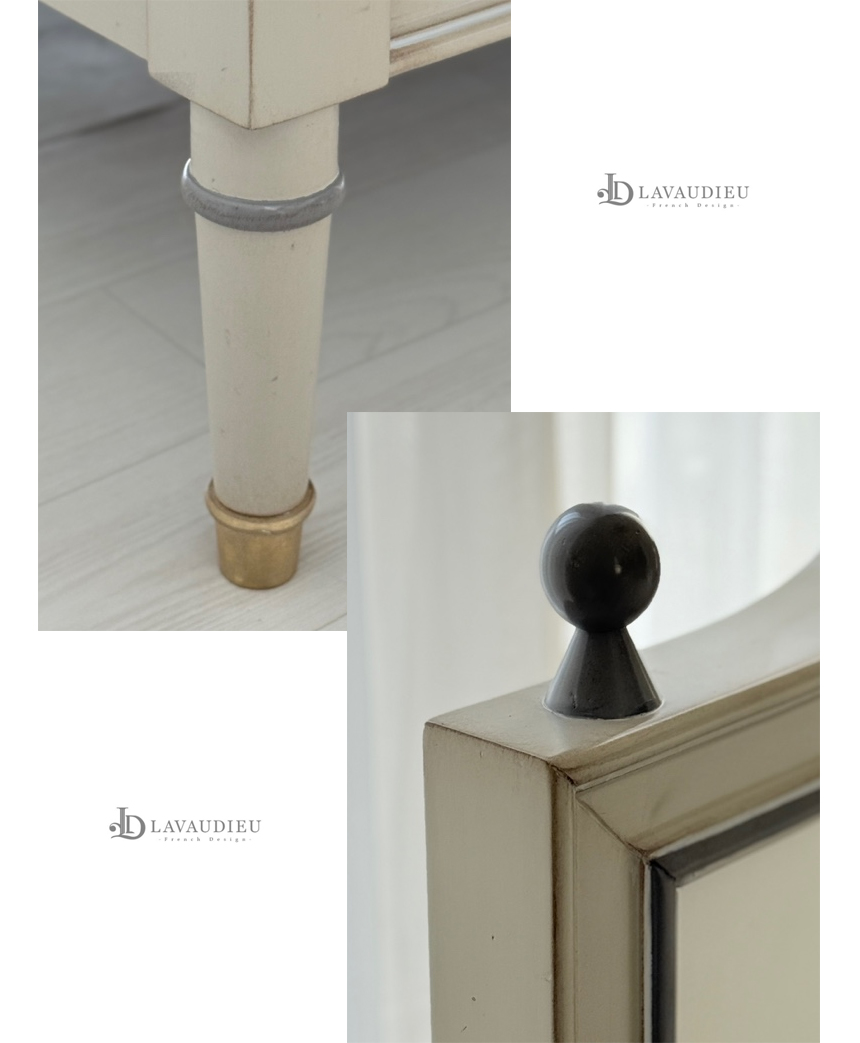 • - 디테일 부분은 핸드메이드 방식으로 제작되기 때문에, 제품마다 균일하지 않을 수 있습니다. 빈티지 작업 즉 스크래치 공법으로 도장 마감 전 스크래치를 내주는 공법이 사용됩니다. 핀홀공법(마감 전 못이박힌 브러쉬같은 도구로 찍어주는공법)과 더스트공법(옛스럽게 보이려 세월의 먼지가 쌓인것처럼 연출하는 공법)을 사용합니다.