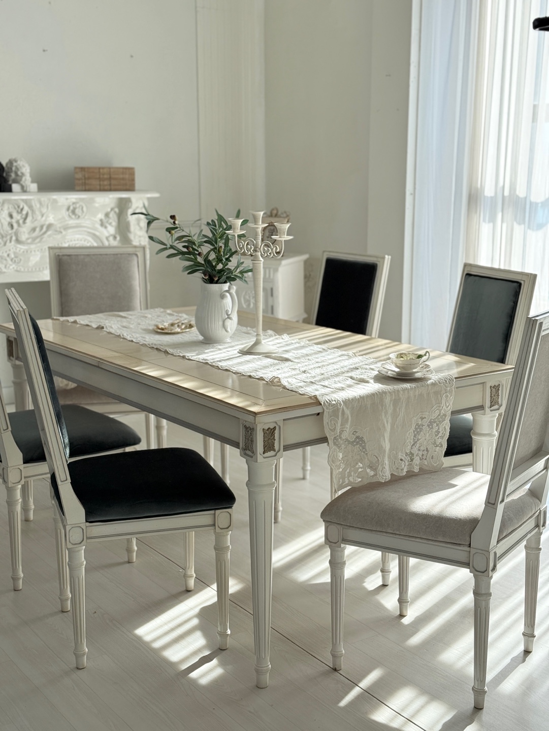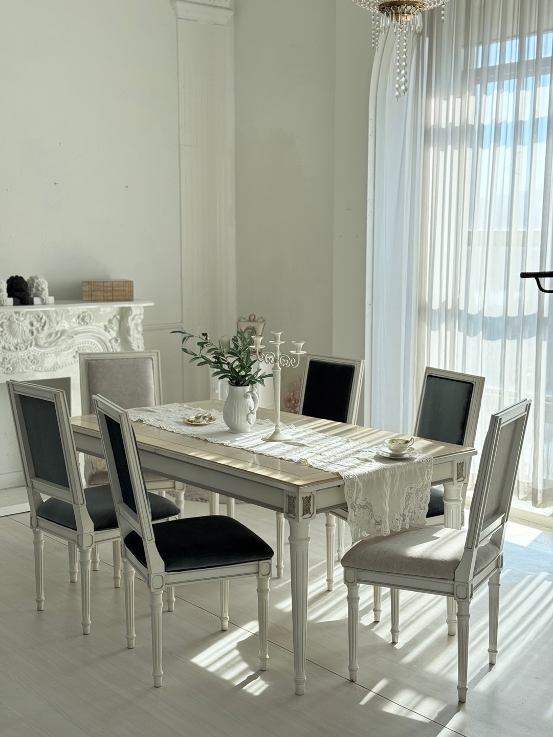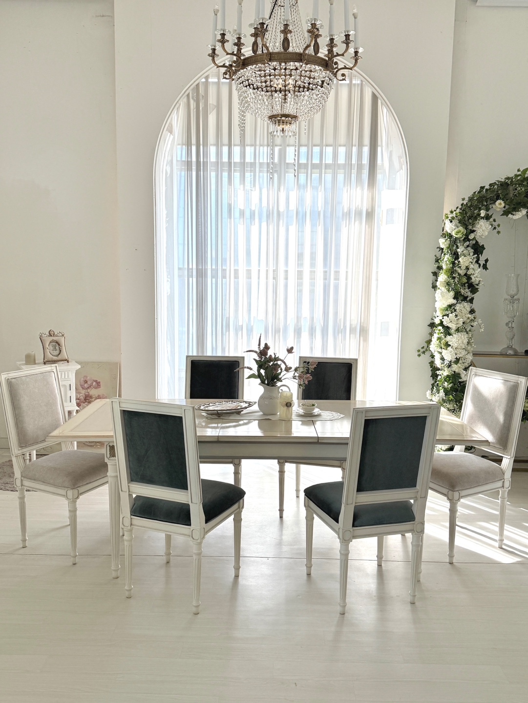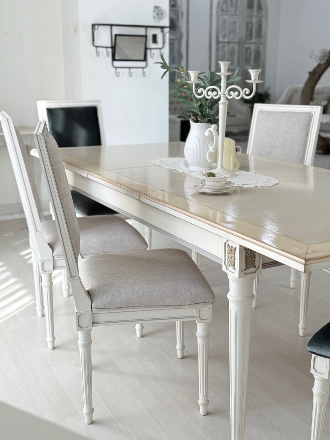 루이 스타일의 우아한 곡선과 화이트 워시 엔틱 프레임은 어떤 식탁과도 완벽하게