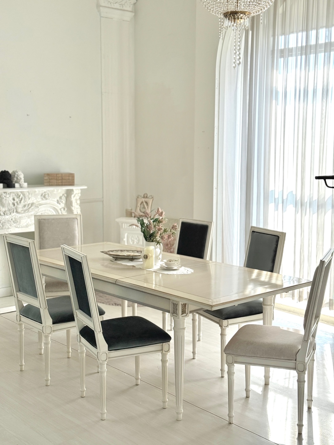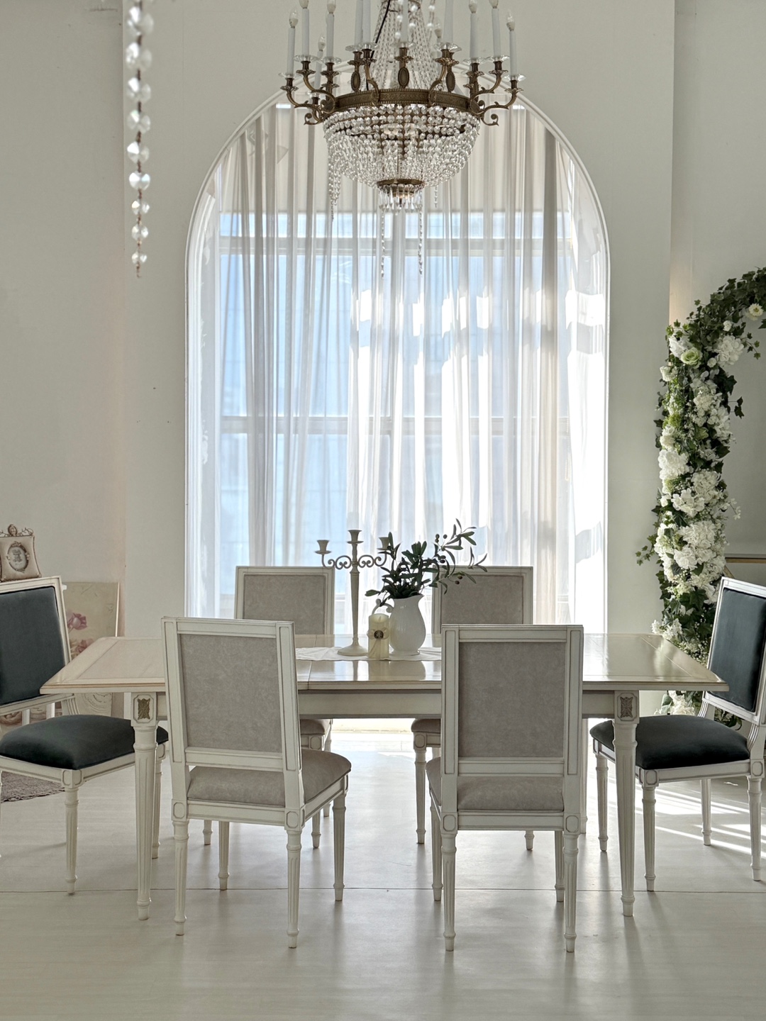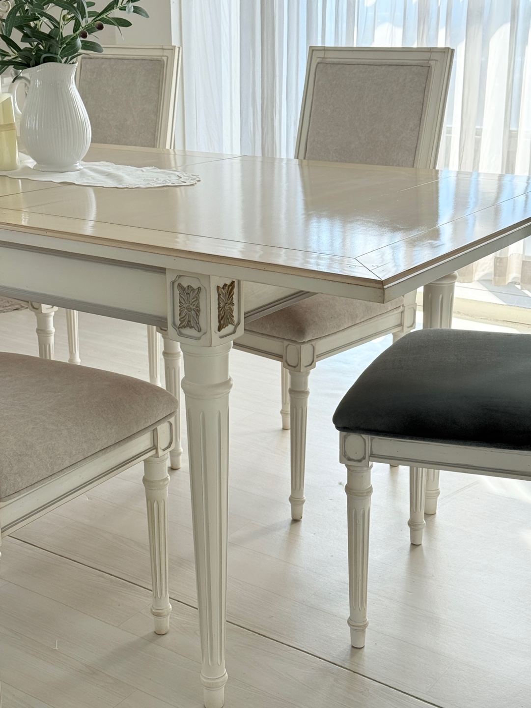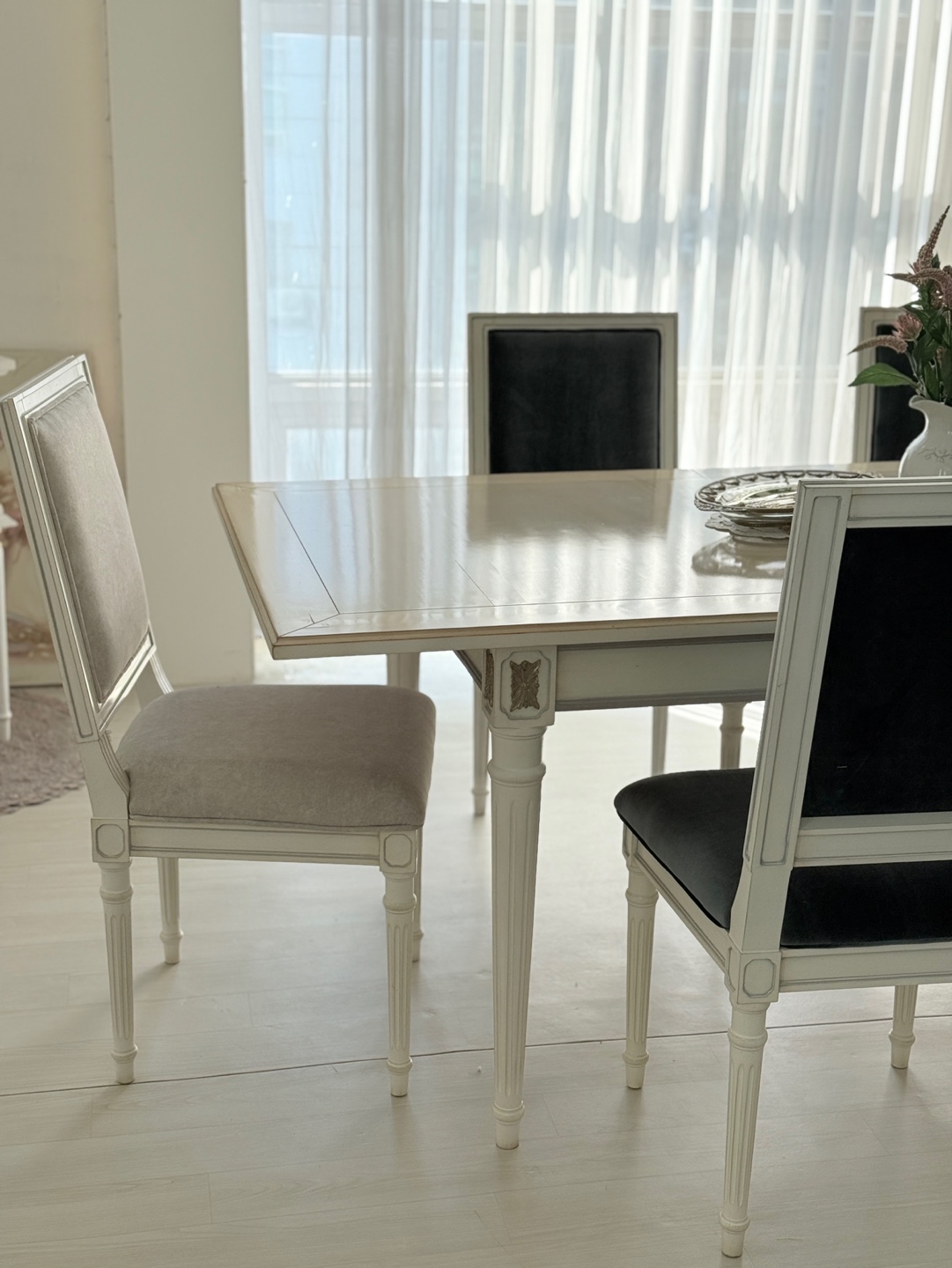 루이 스타일의 우아한 곡선과 화이트 워시 엔틱 프레임은 어떤 식탁과도 완벽하게