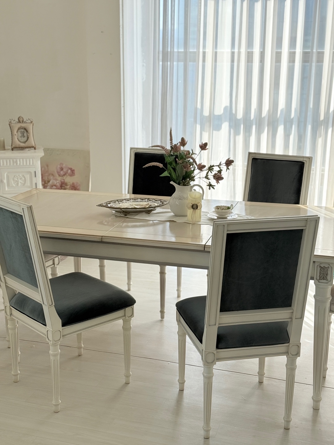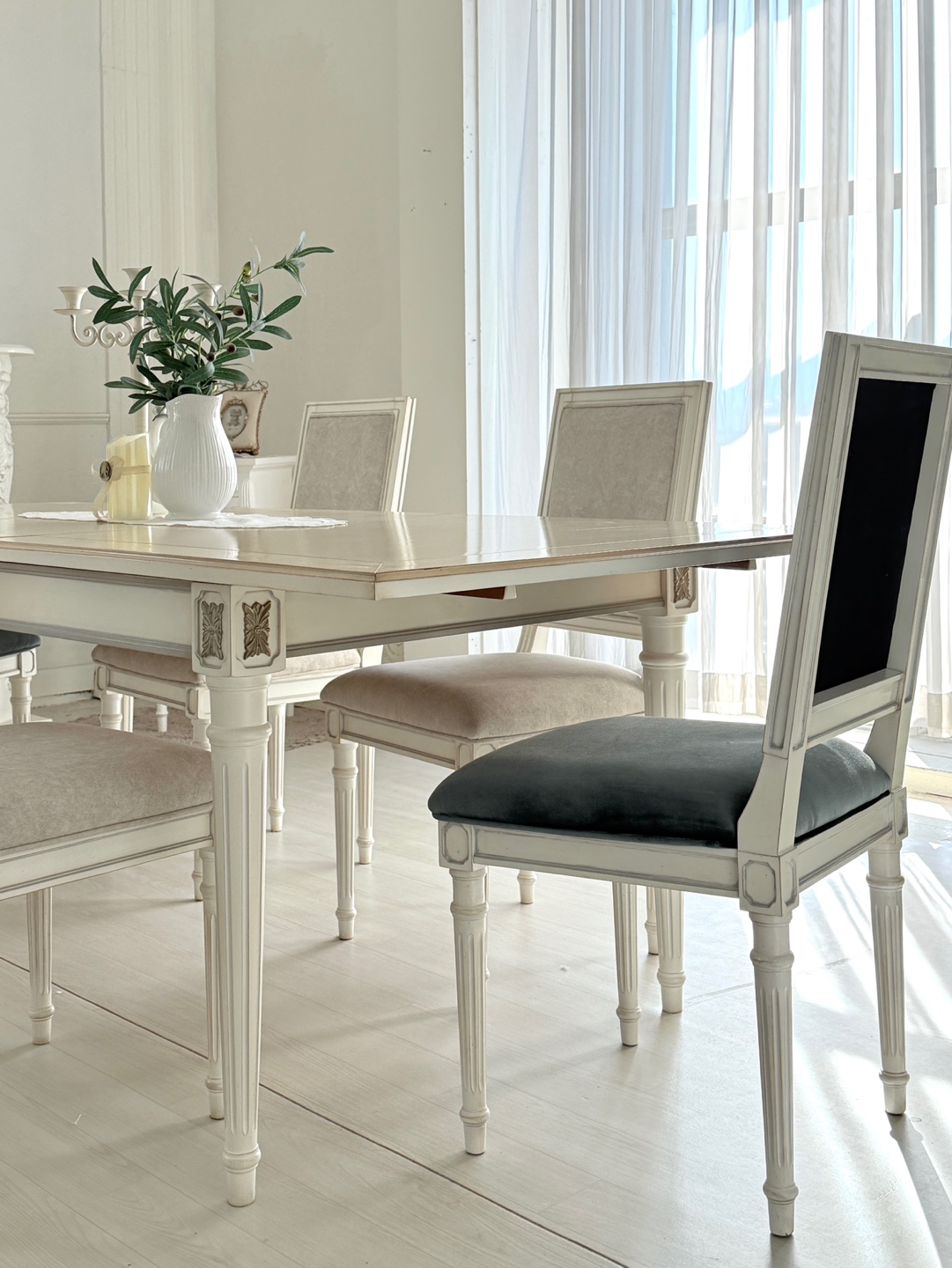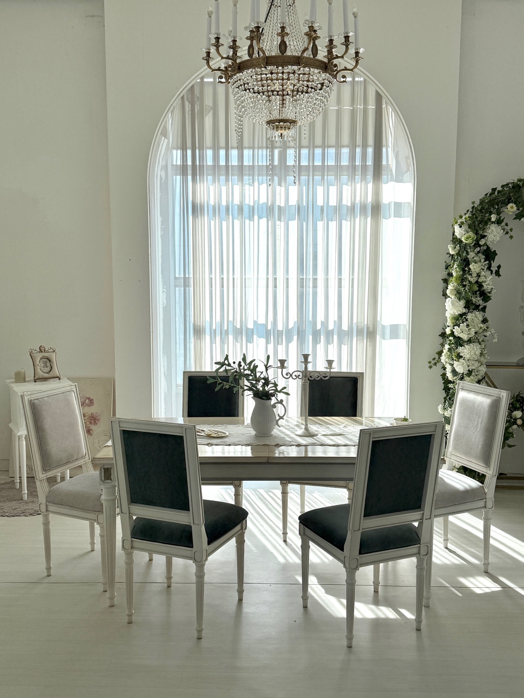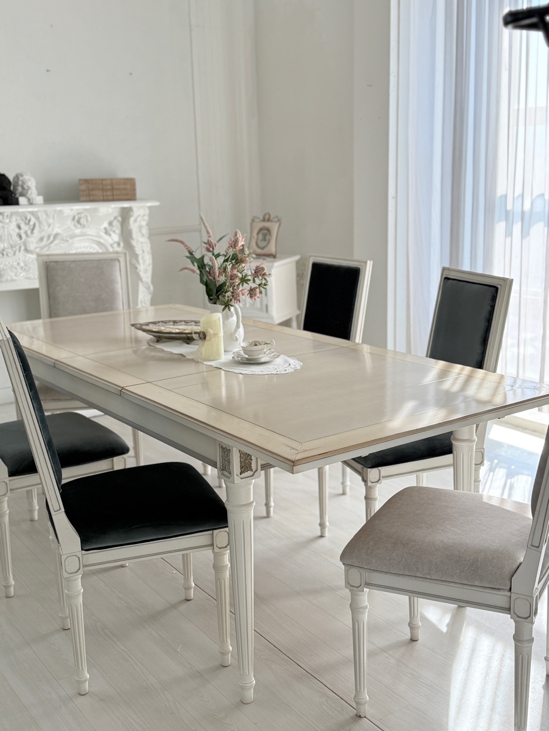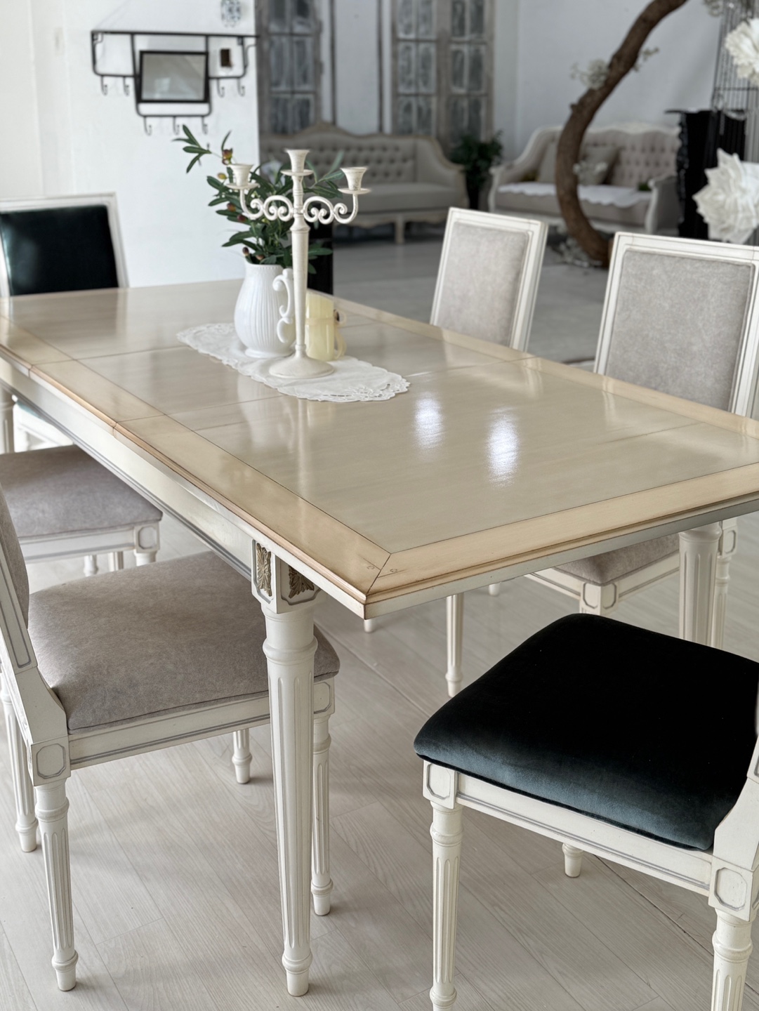 루이 스타일의 우아한 곡선과 화이트 워시 엔틱 프레임은 어떤 식탁과도 완벽하게