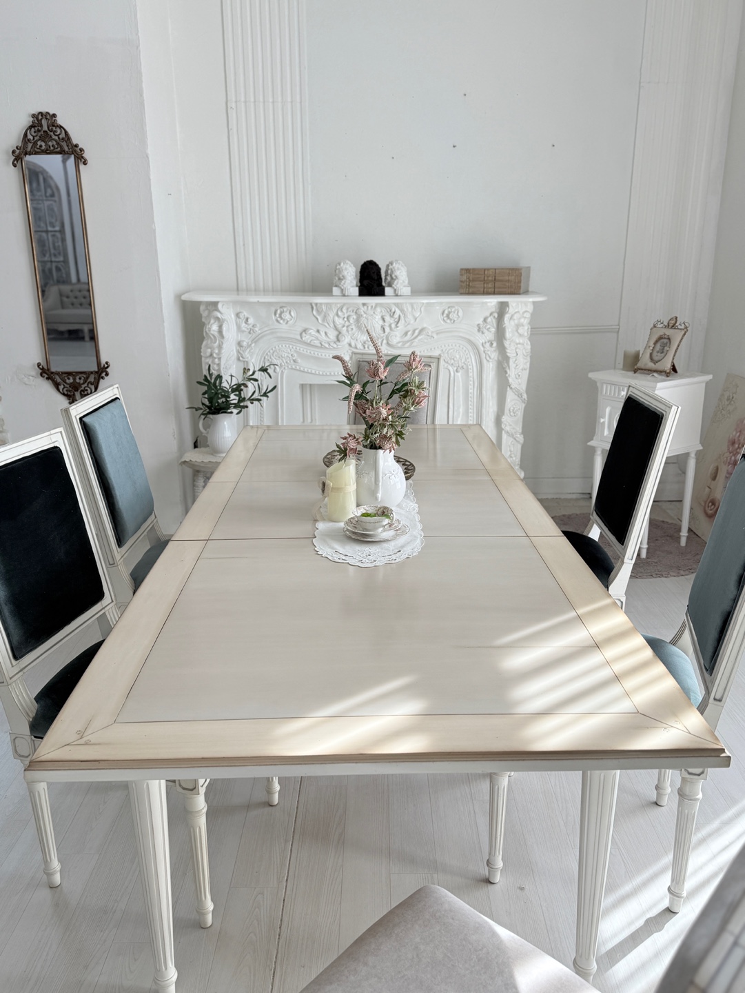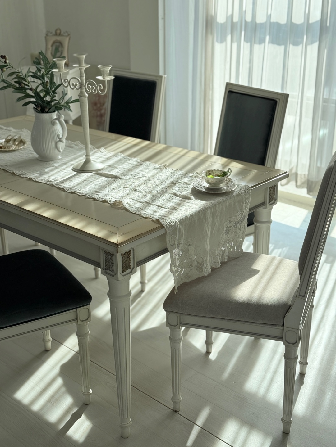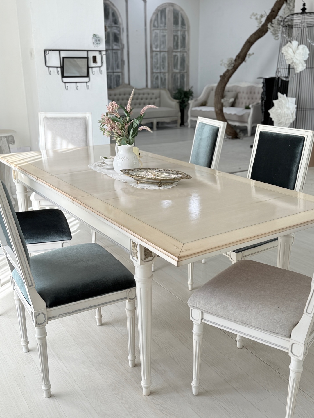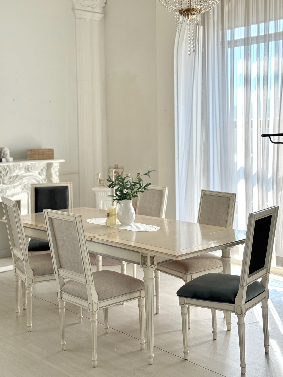 루이 스타일의 우아한 곡선과 화이트 워시 엔틱 프레임은 어떤 식탁과도 완벽하게