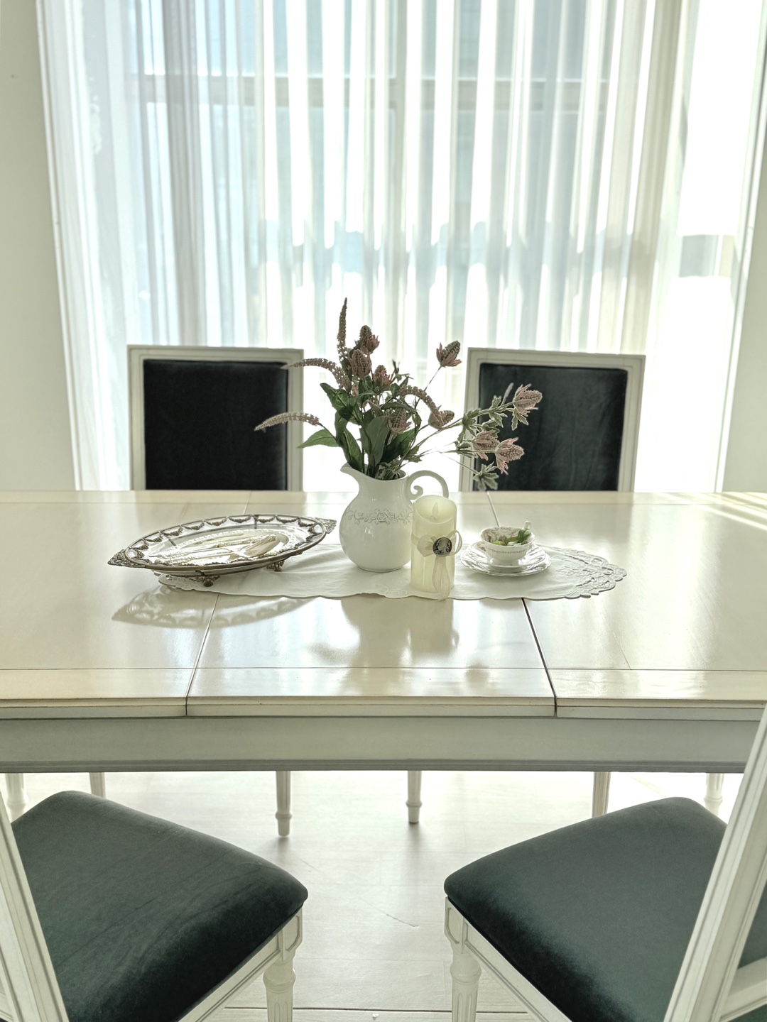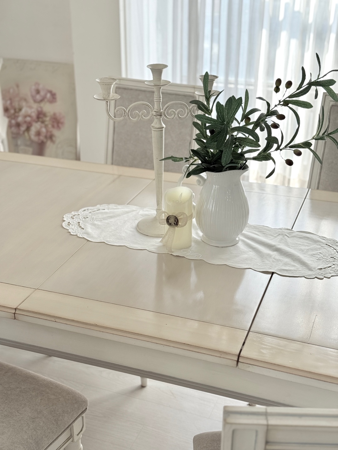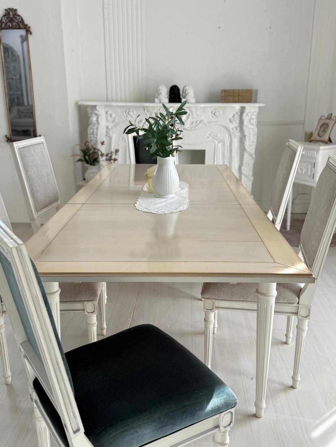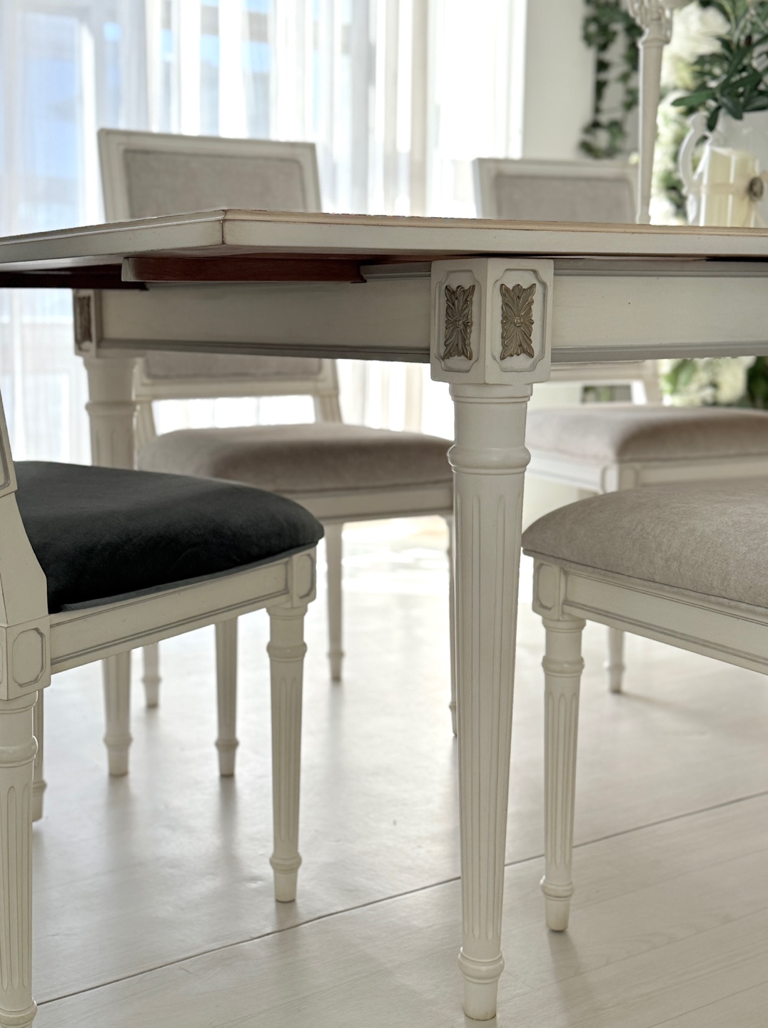 루이 스타일의 우아한 곡선과 화이트 워시 엔틱 프레임은 어떤 식탁과도 완벽하게