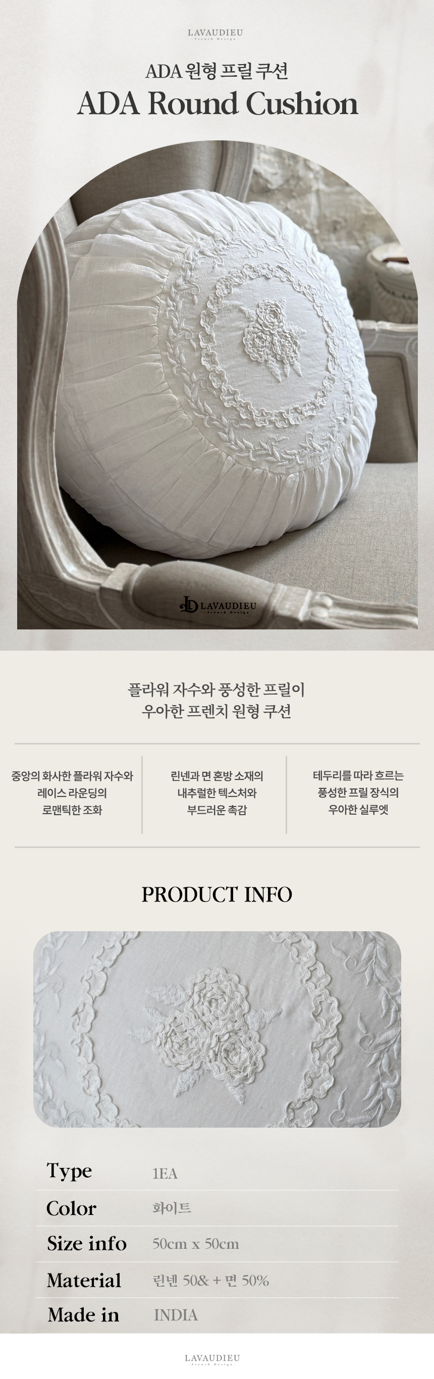 디자인&디테일 정교한 플라워 자수와 레이스 디테일이 어우러져 격조 높은 프렌치 무드를 완성합니다.