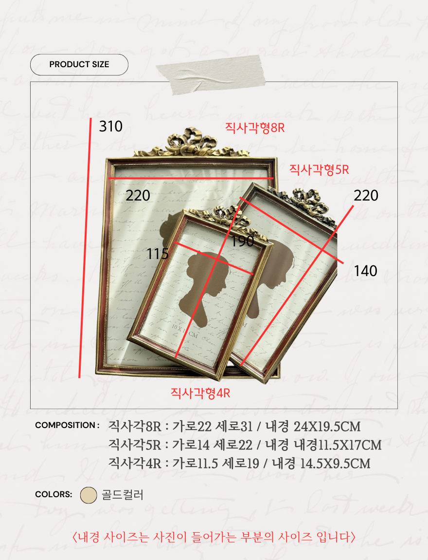 | 크기 | 직사각8r : 가로22 세로31 / 내경 24x19.5cm 직사각5r : 가로14 세로22 / 내경 내경11.5x17cm 직사각4r : 가로11.5 세로19 / 내경 14.5x9.5cm |