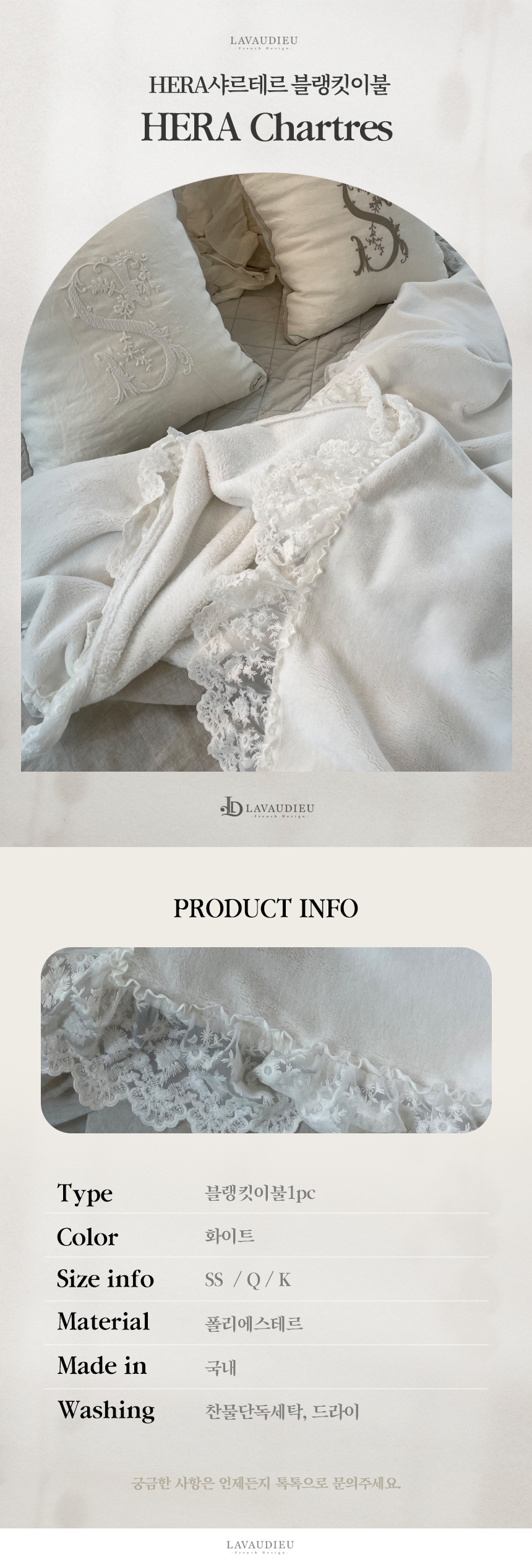 - HOME > 침구,쿠션,커버류 > 블랭킷,스프레드,패드 > 담요 극세사 블랭킷 프렌치 레이스 이불 화이트 침구 국내제작(헤라 샤르테르 블랭킷)