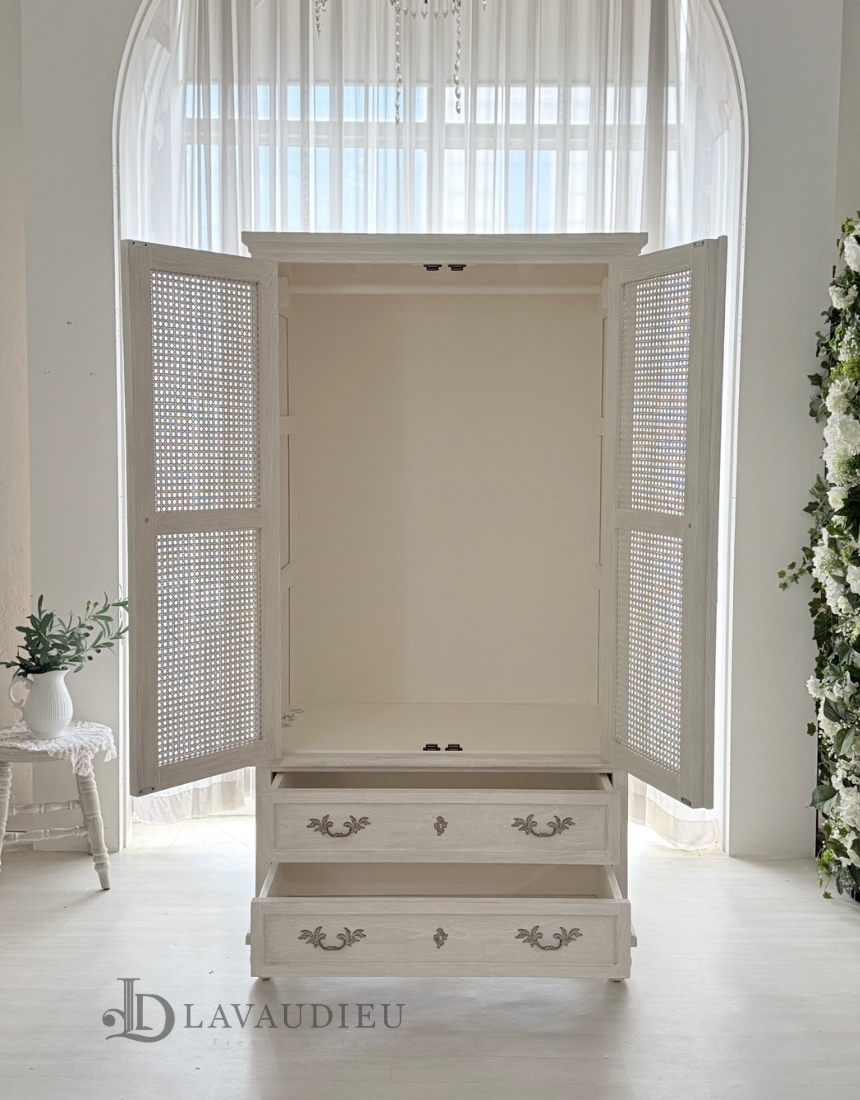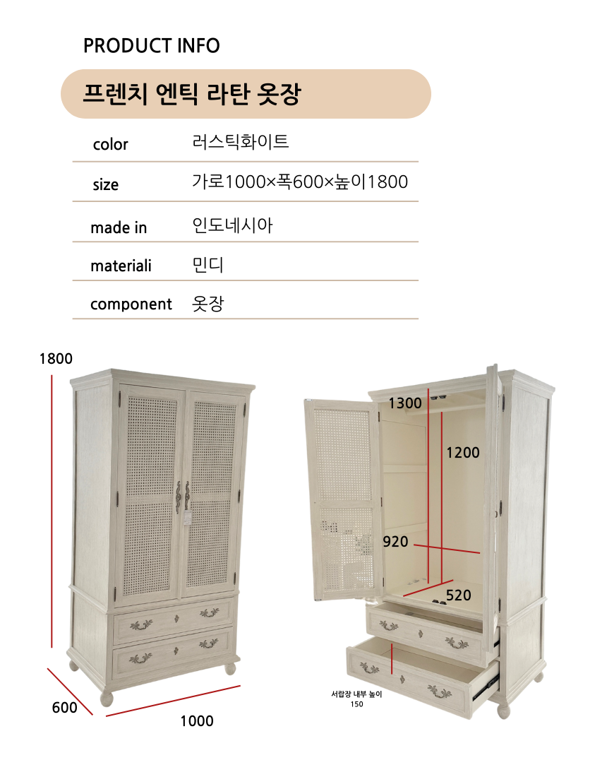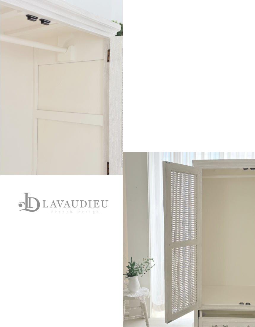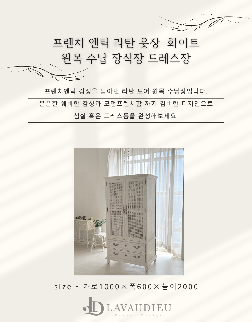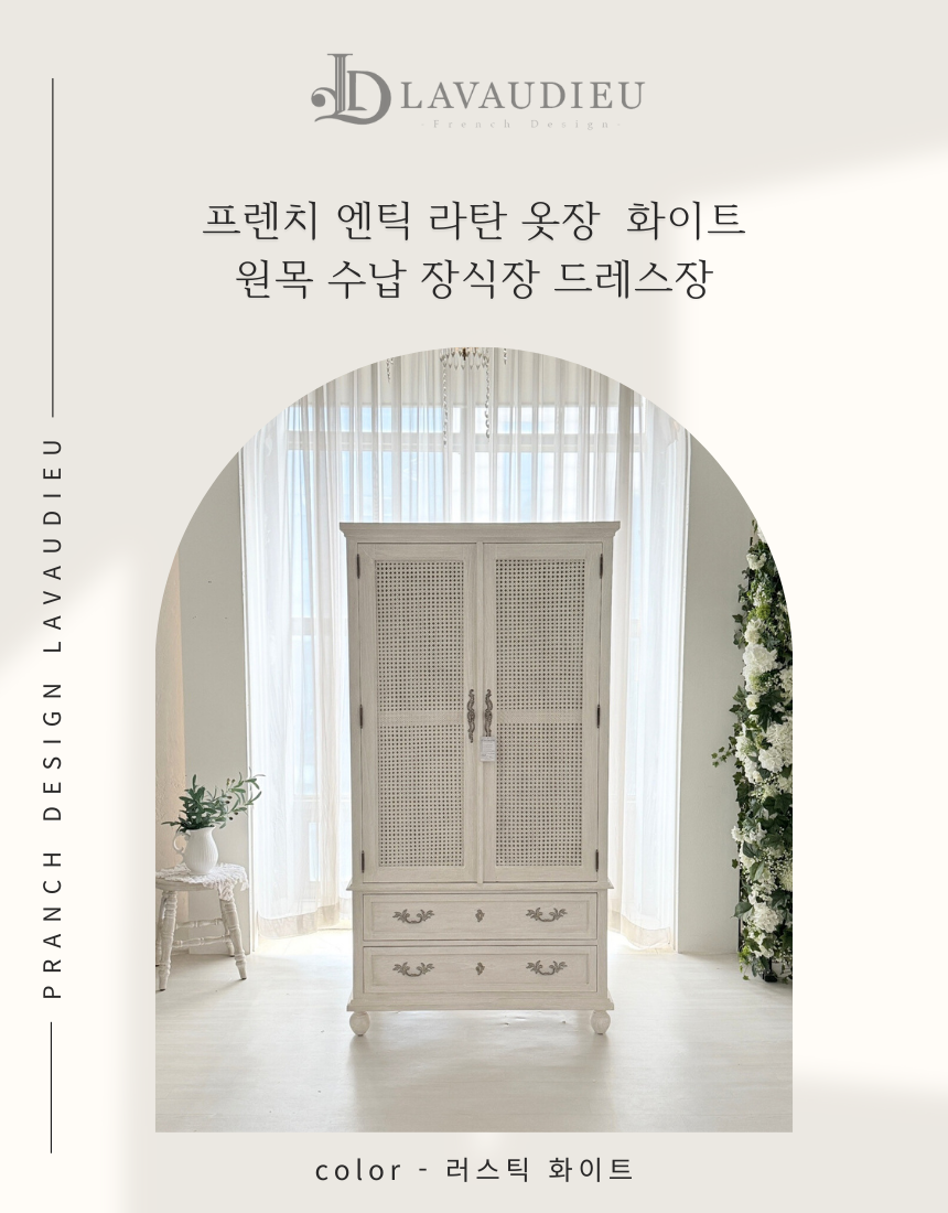 | 품명 | 프렌치 엔틱 라탄 옷장 화이트 원목 수납 장식장 드레스장 |