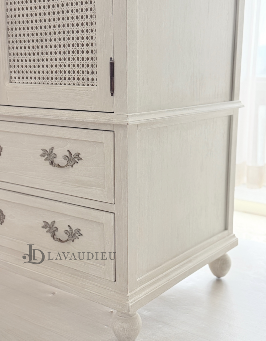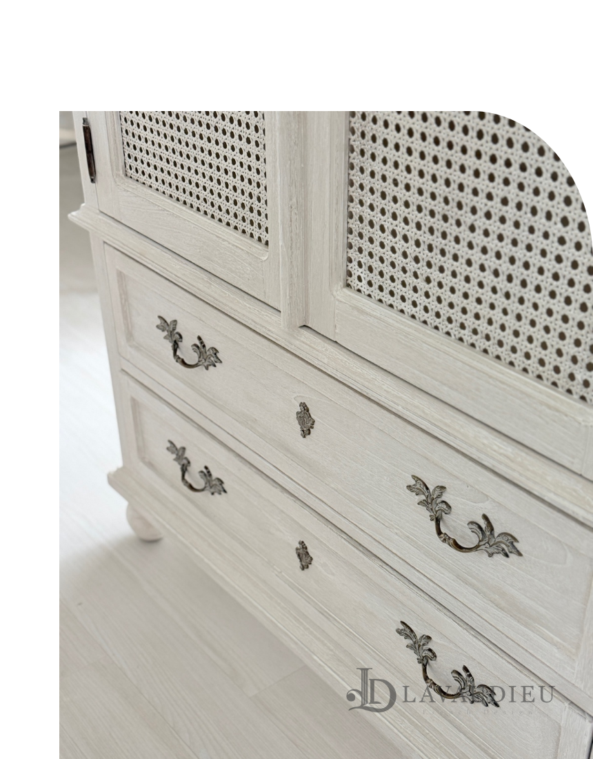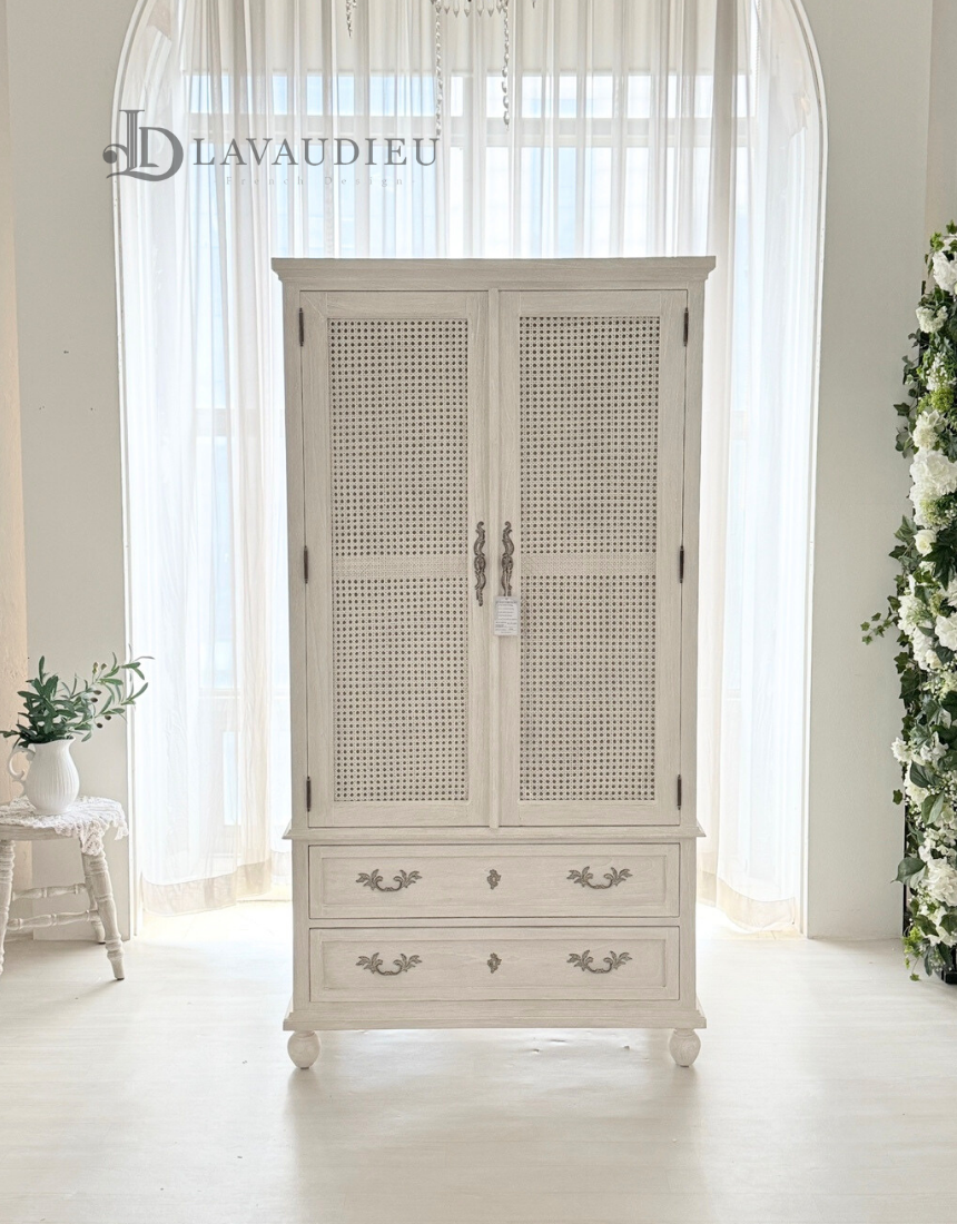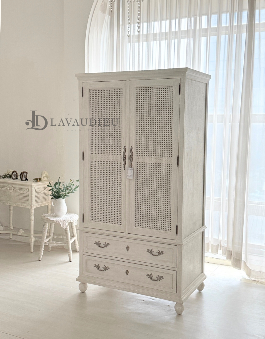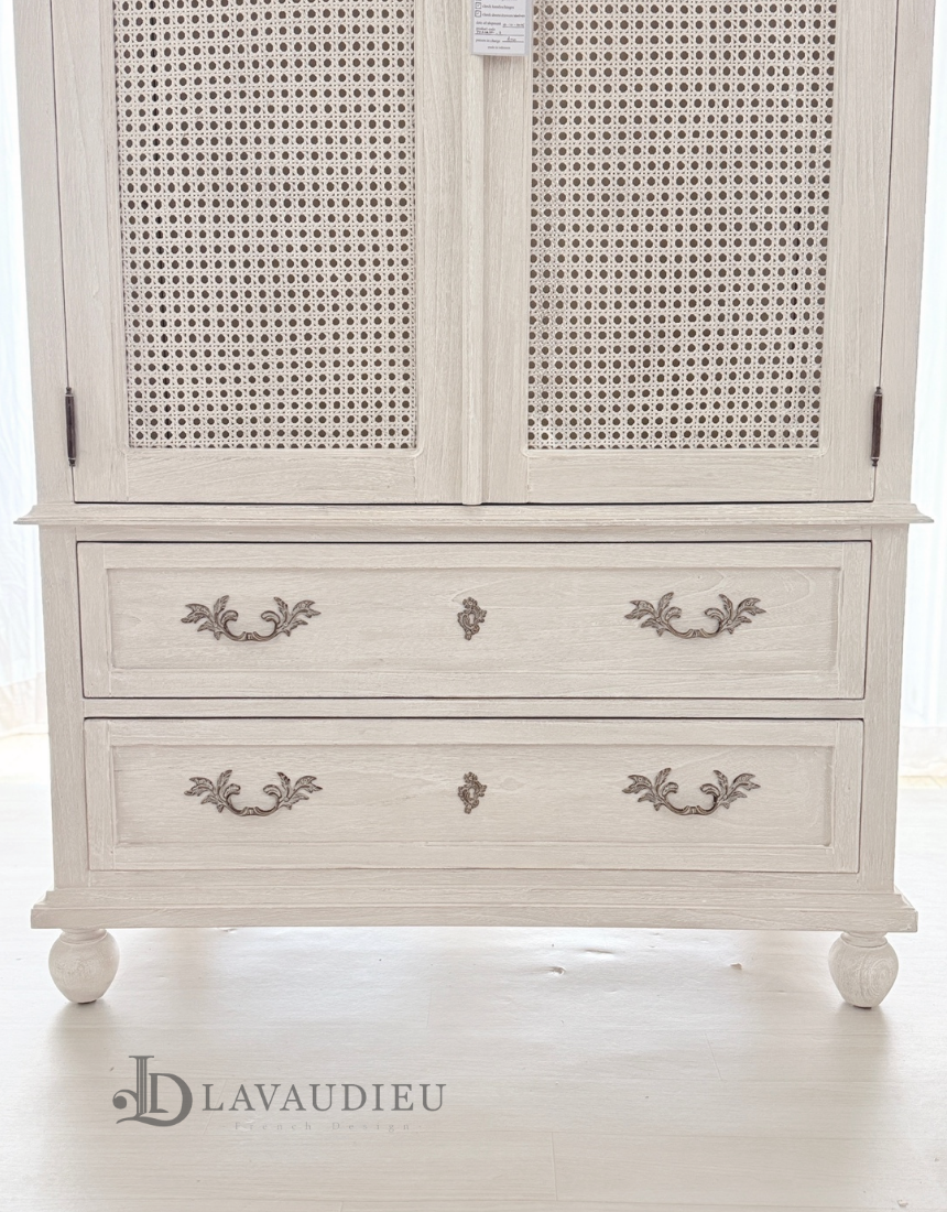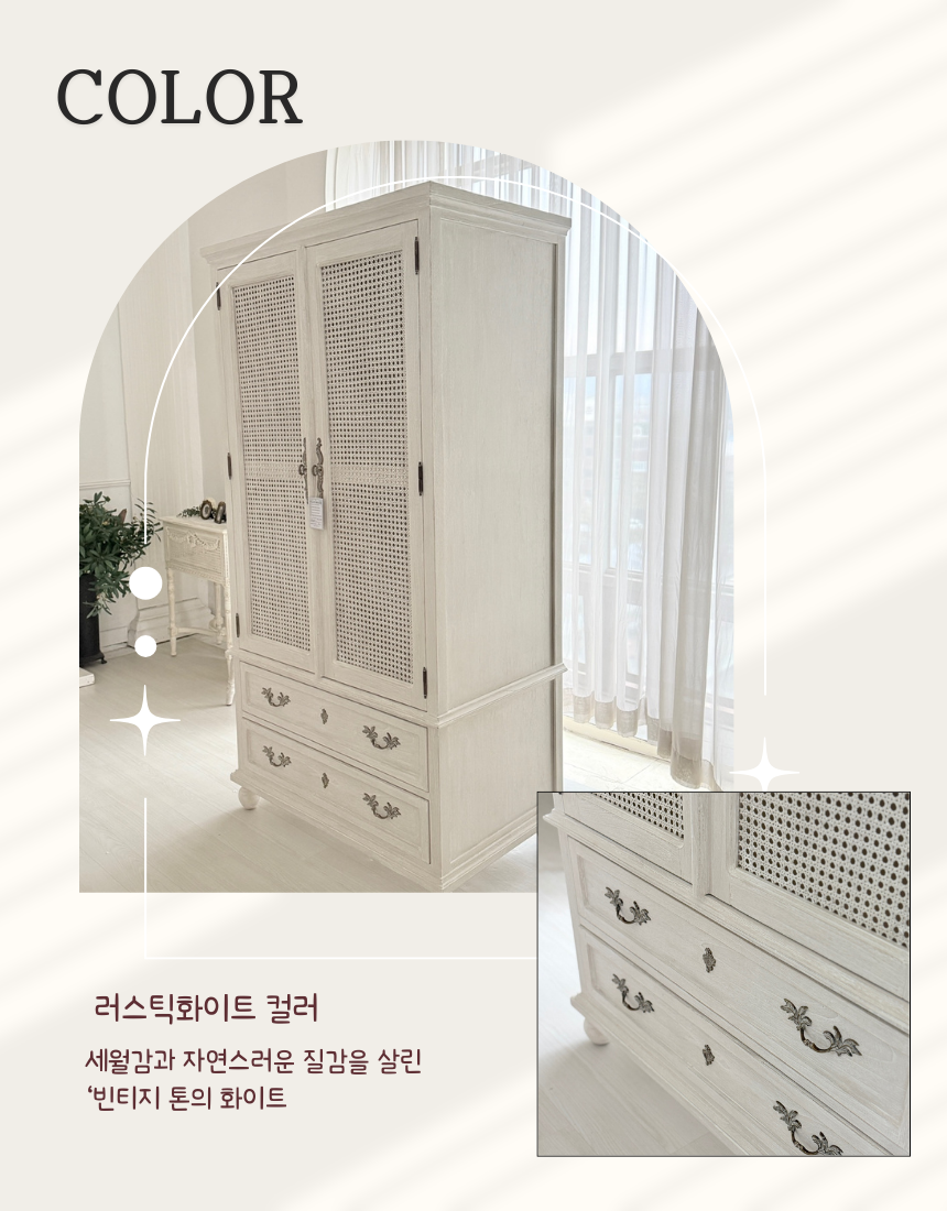 | 품명 | 프렌치 엔틱 라탄 옷장 화이트 원목 수납 장식장 드레스장 |